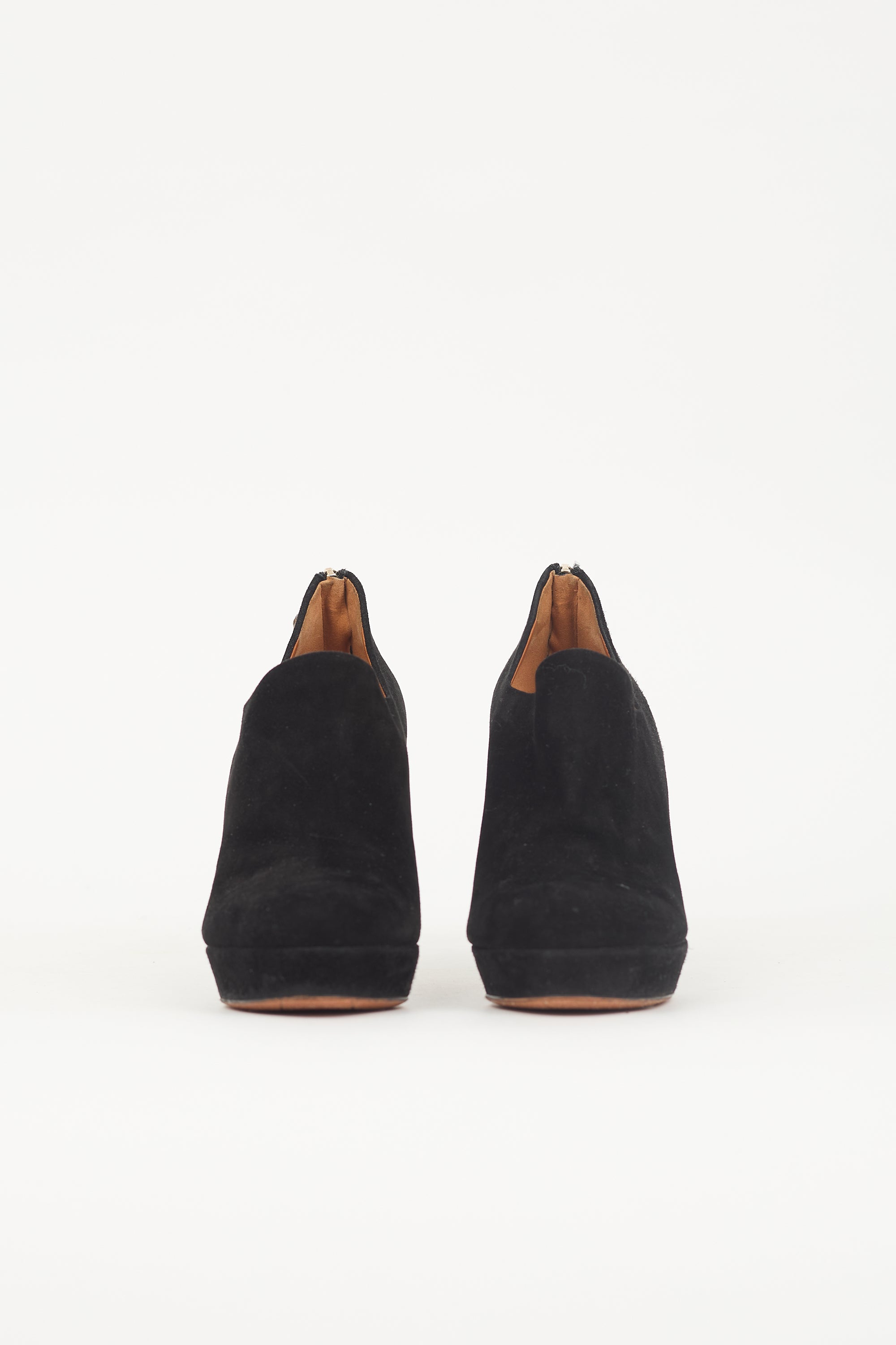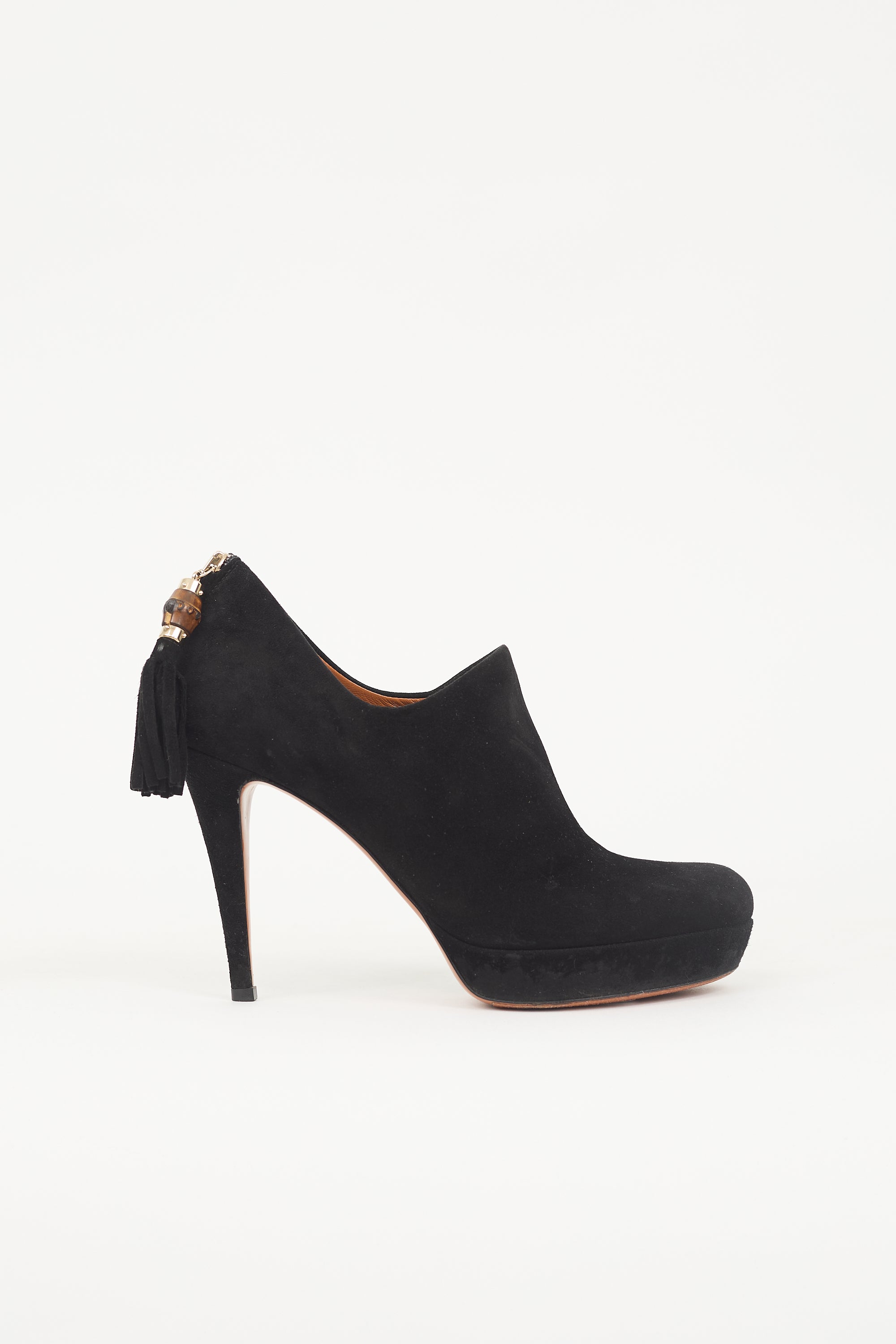 Pre-owned Gucci black suede Betty booties featuring a rounded toe, platform midsole, back zip with bamboo tassel pull, and covered continental heel.
