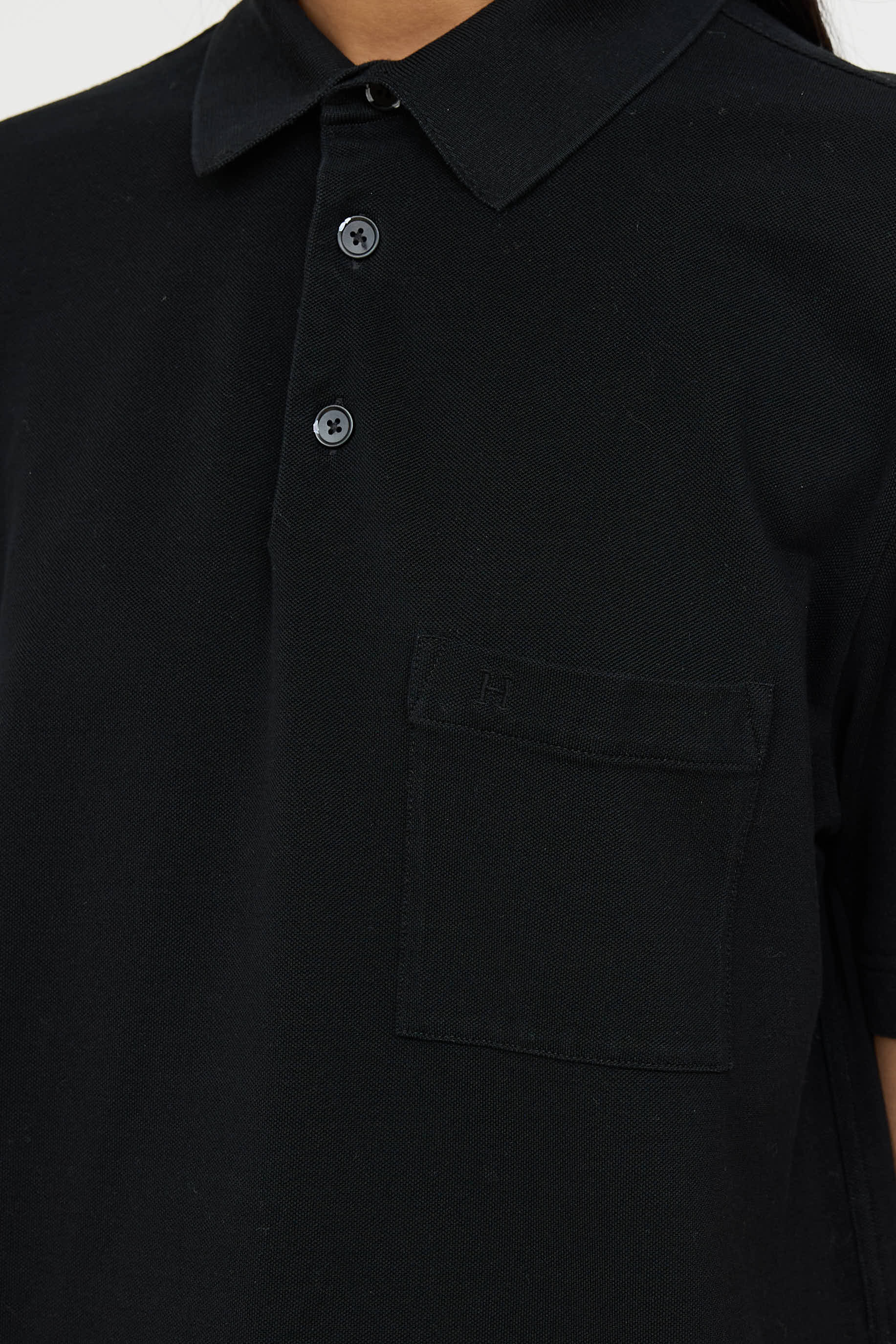 Pre-owned Hermès black polo top featuring a pointed collar, short sleeves, patch pocket at chest with embroidered logo, and quarter button up closure.