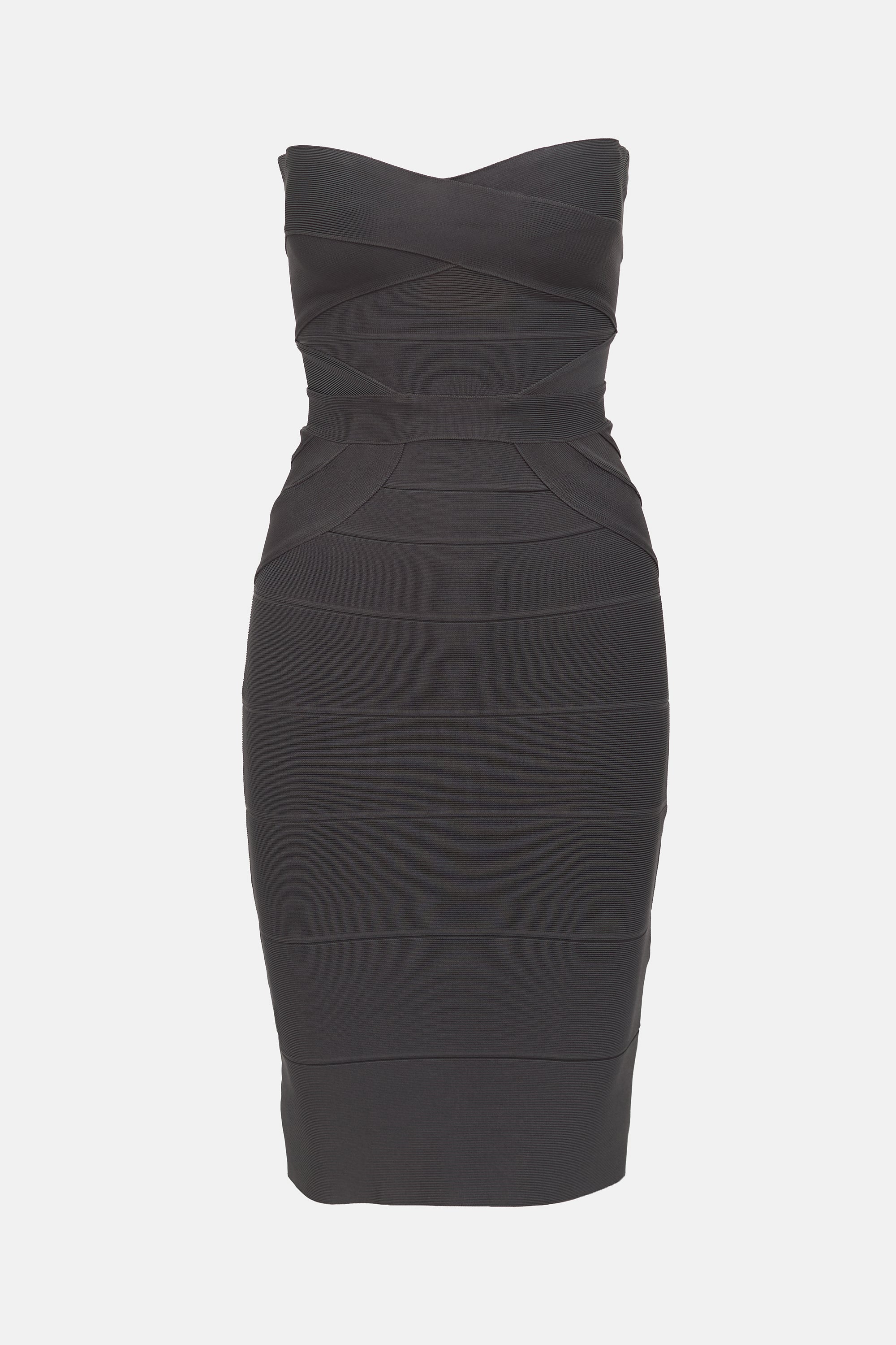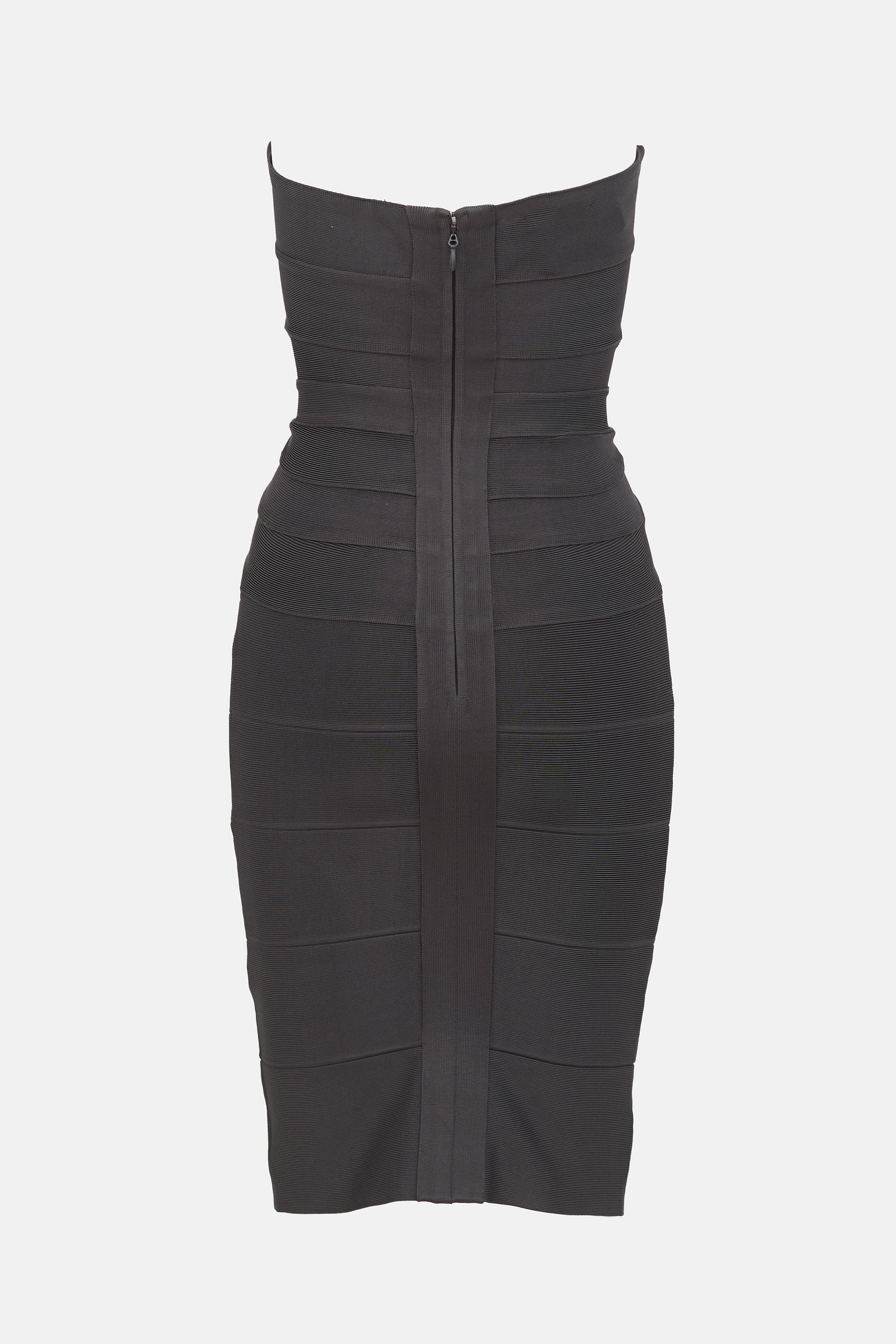 Pre-owned Hervé Léger dark grey bandage dress featuring sweetheart neckline with silicone grip at interior, back zip closure, paneled construction, and bodycon silhouette.
