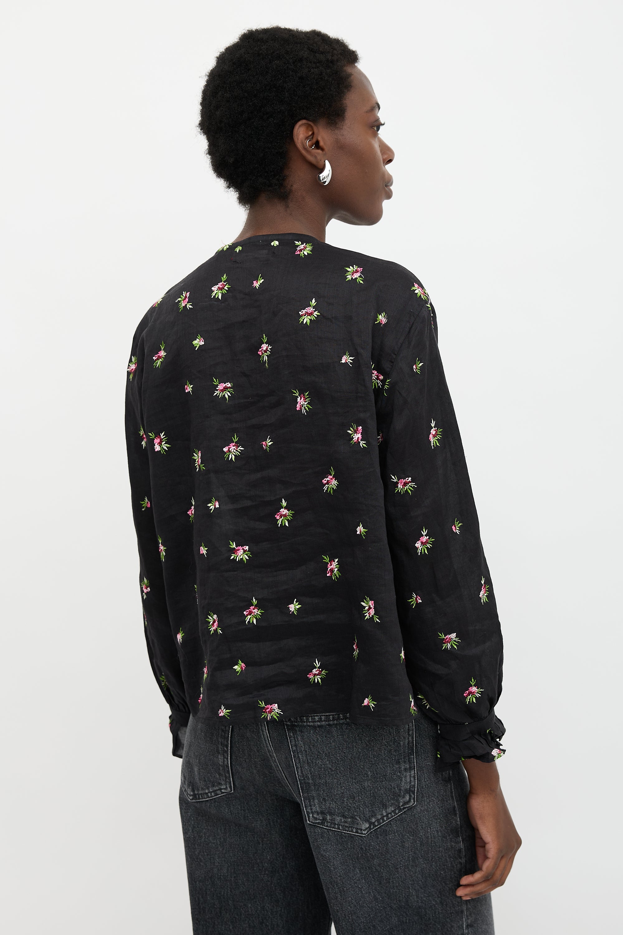 Pre-owned Isabel Marant black ramie Uamos blouse featuring a round collar, pink floral embroidery, concealed button front with ruffled placket, and ruffled buttoned cuffs.