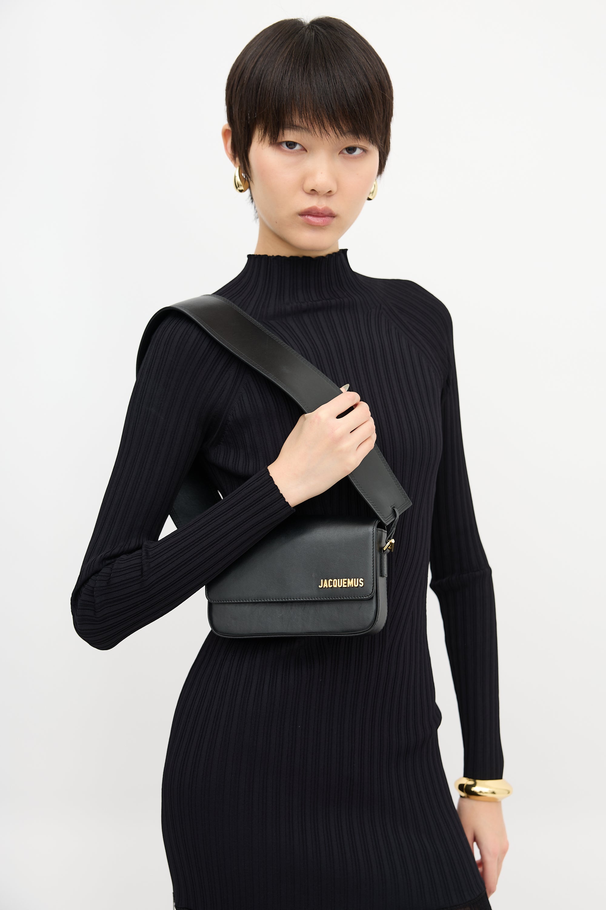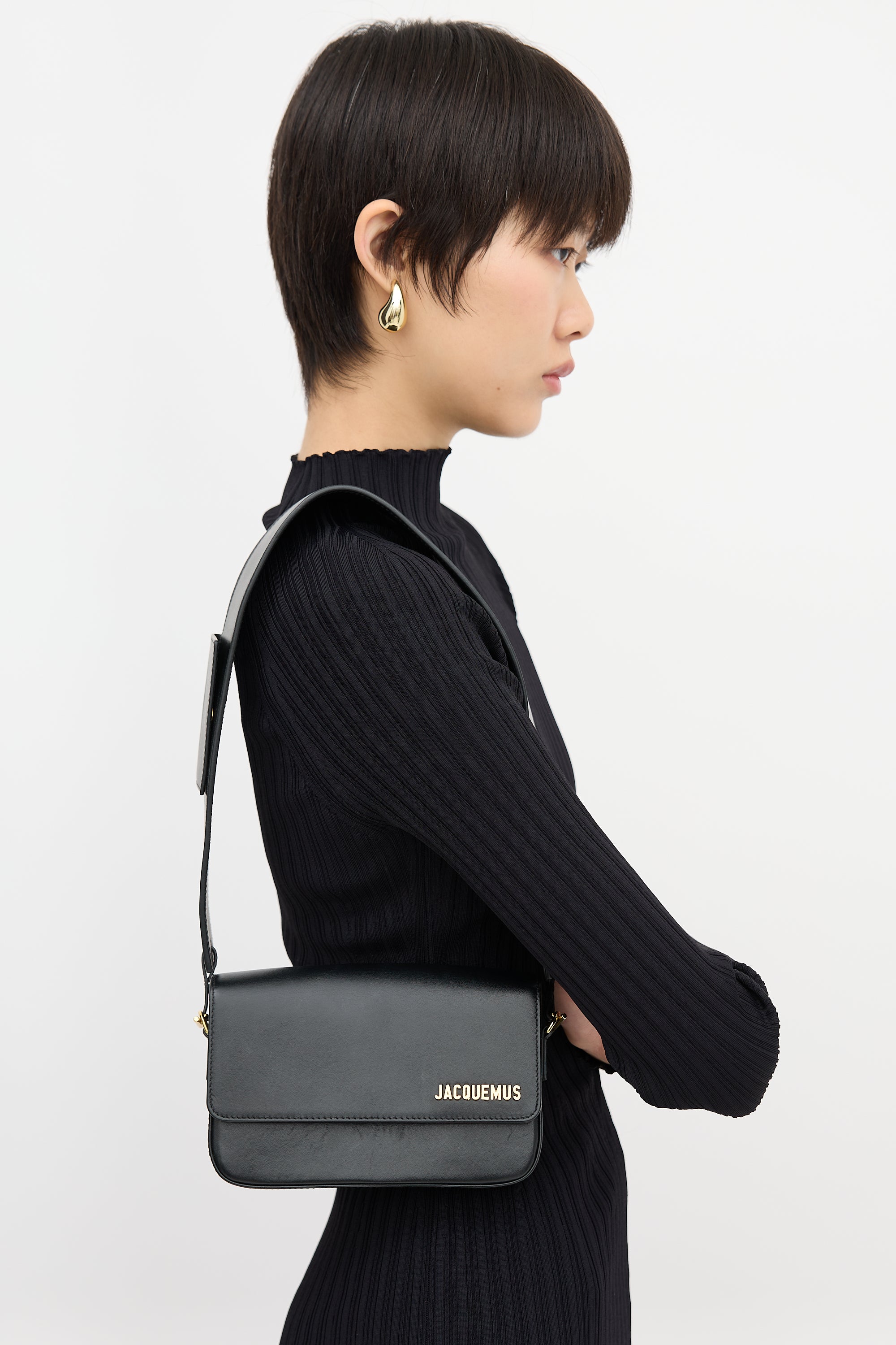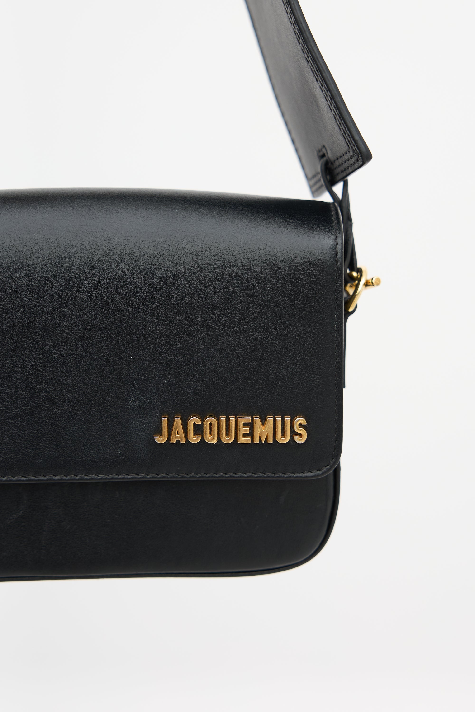 Pre-owned Jacquemus black leather Le Carinu shoulder bag featuring tonal stitching, gold tone logo embellishment at front flap, removable wide shoulder strap, magnetic closure, and one lined main compartment with one slip pocket. Comes with original dust bag.