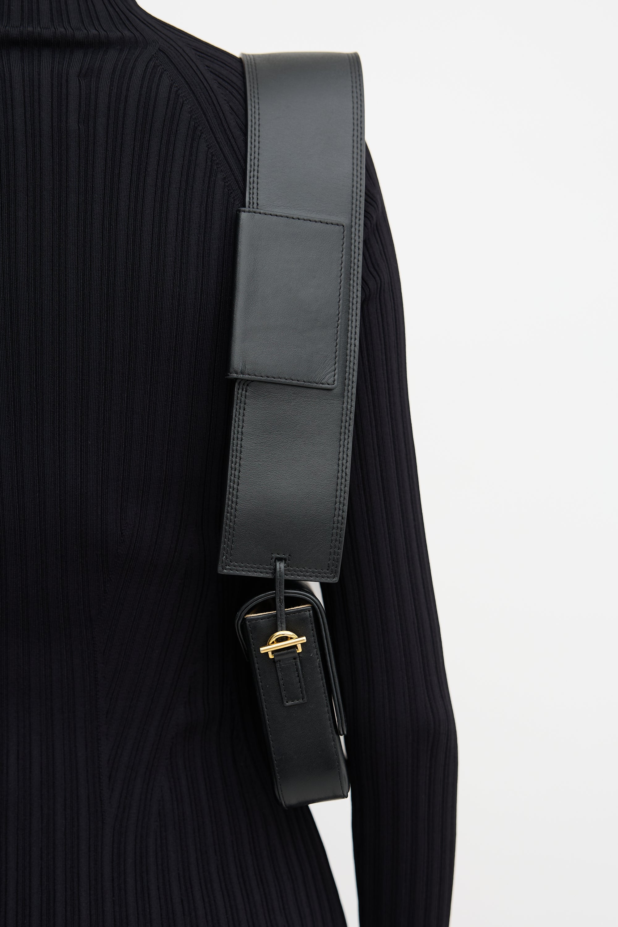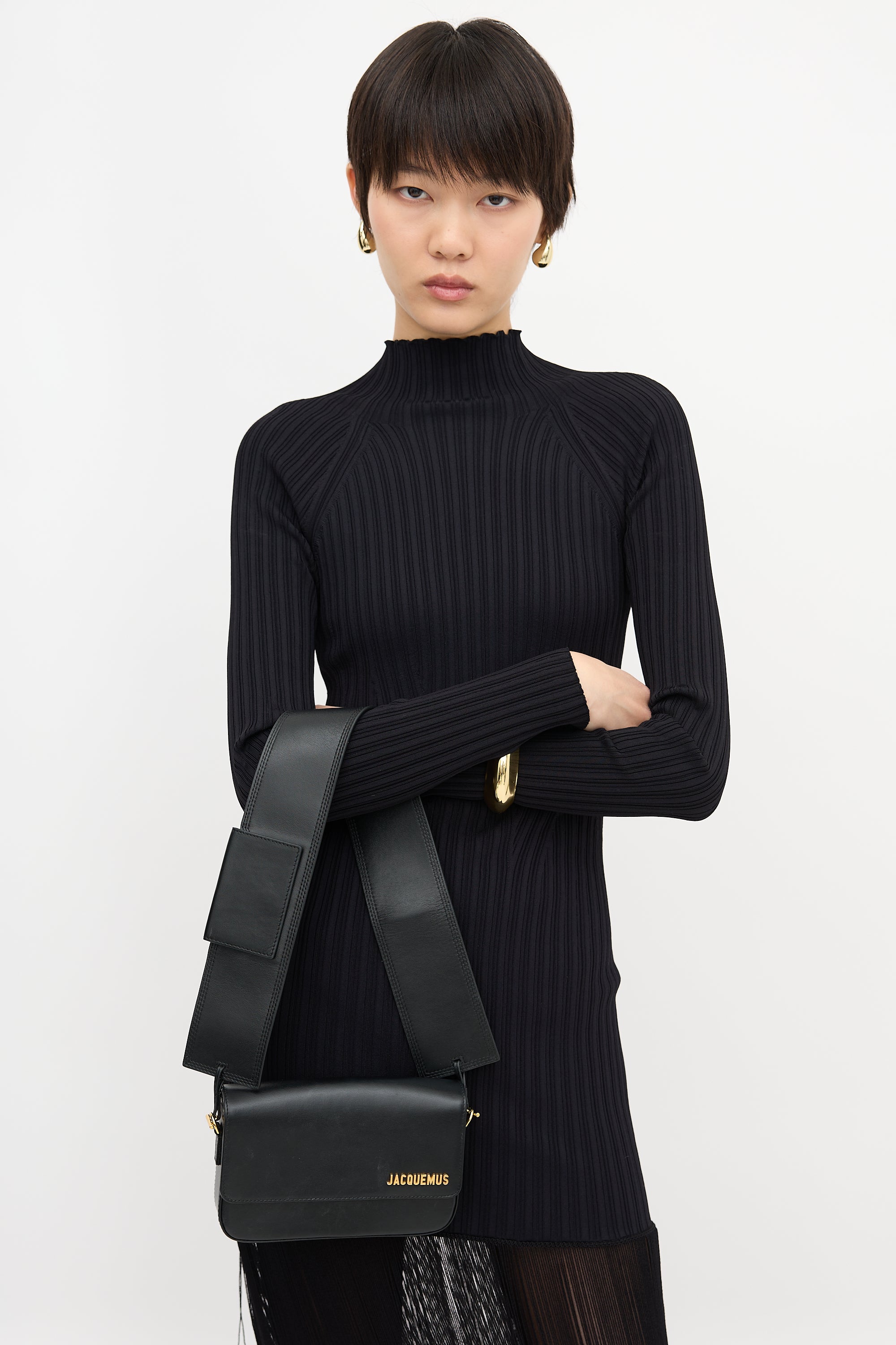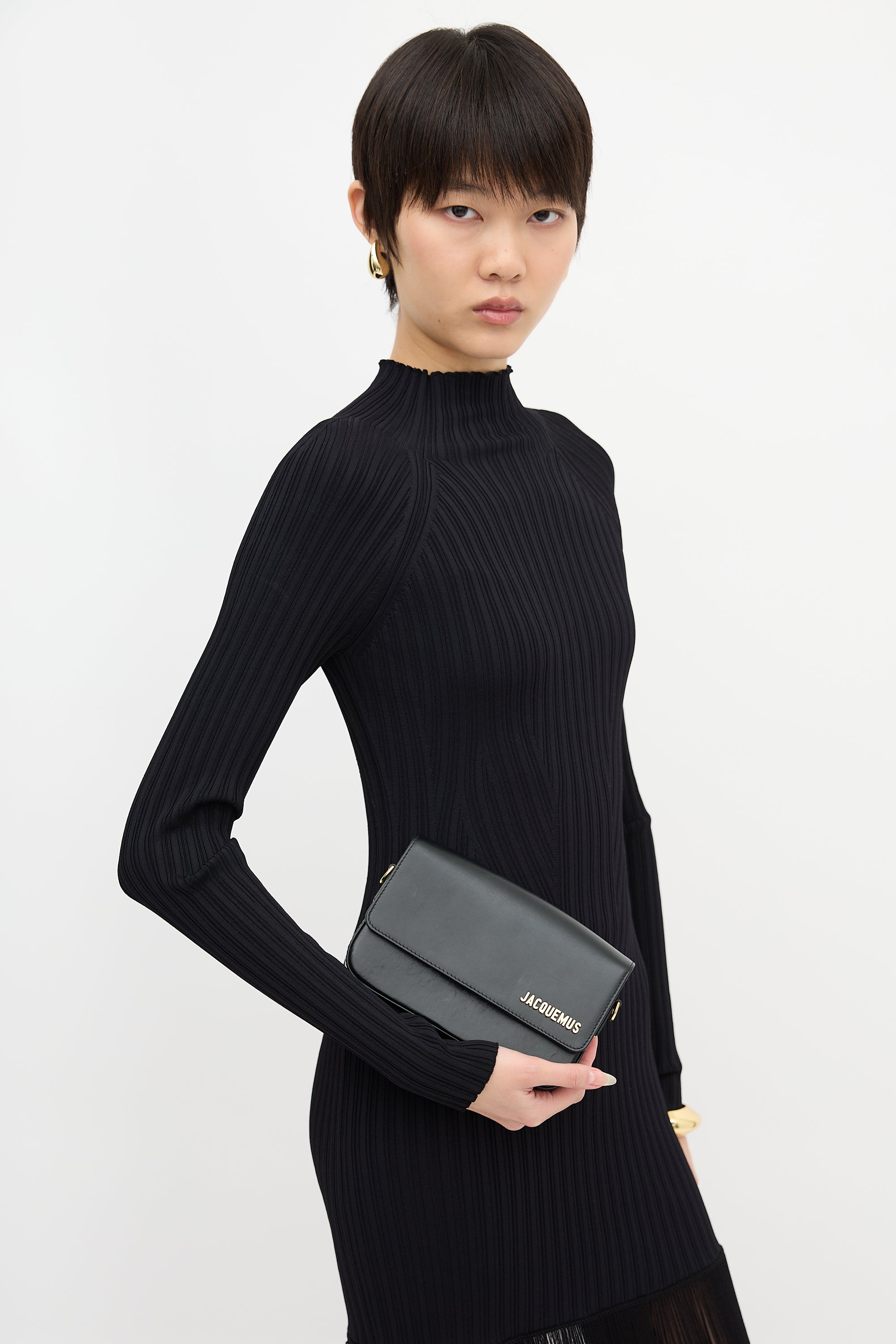 Pre-owned Jacquemus black leather Le Carinu shoulder bag featuring tonal stitching, gold tone logo embellishment at front flap, removable wide shoulder strap, magnetic closure, and one lined main compartment with one slip pocket. Comes with original dust bag.
