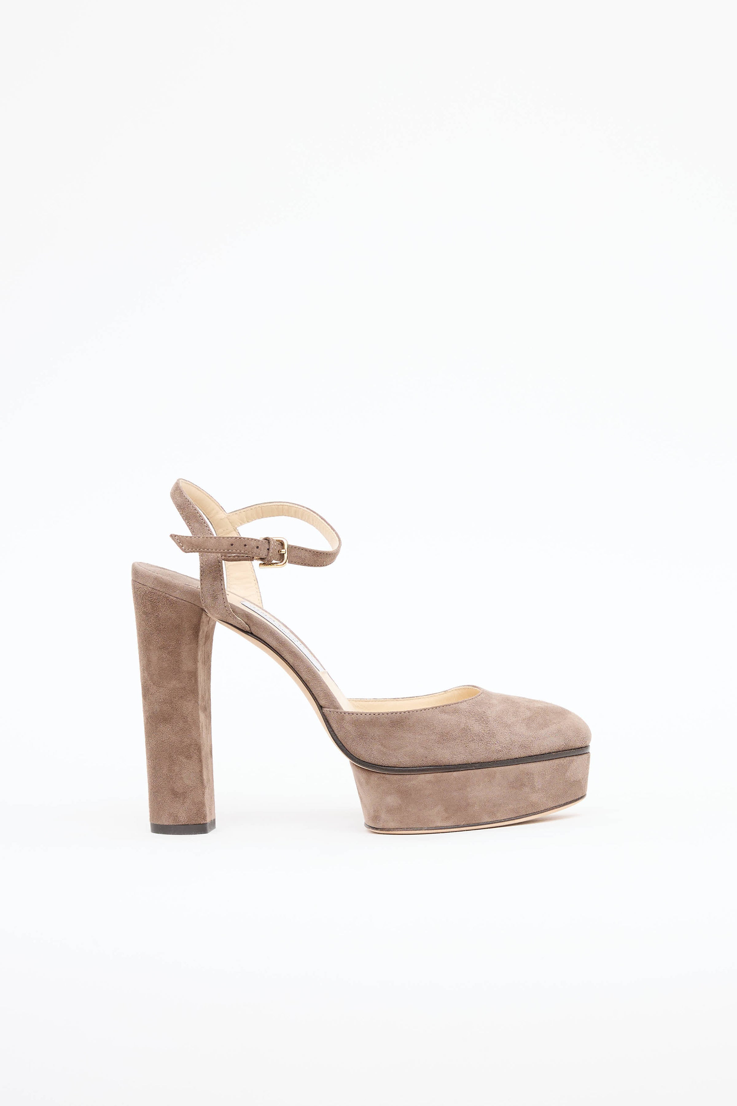 Pre-owned Jimmy Choo taupe platform pumps featuring round toe, platform midsole, covered block heel, suede upper with dark brown trim and ankle strap with silver toned buckle.