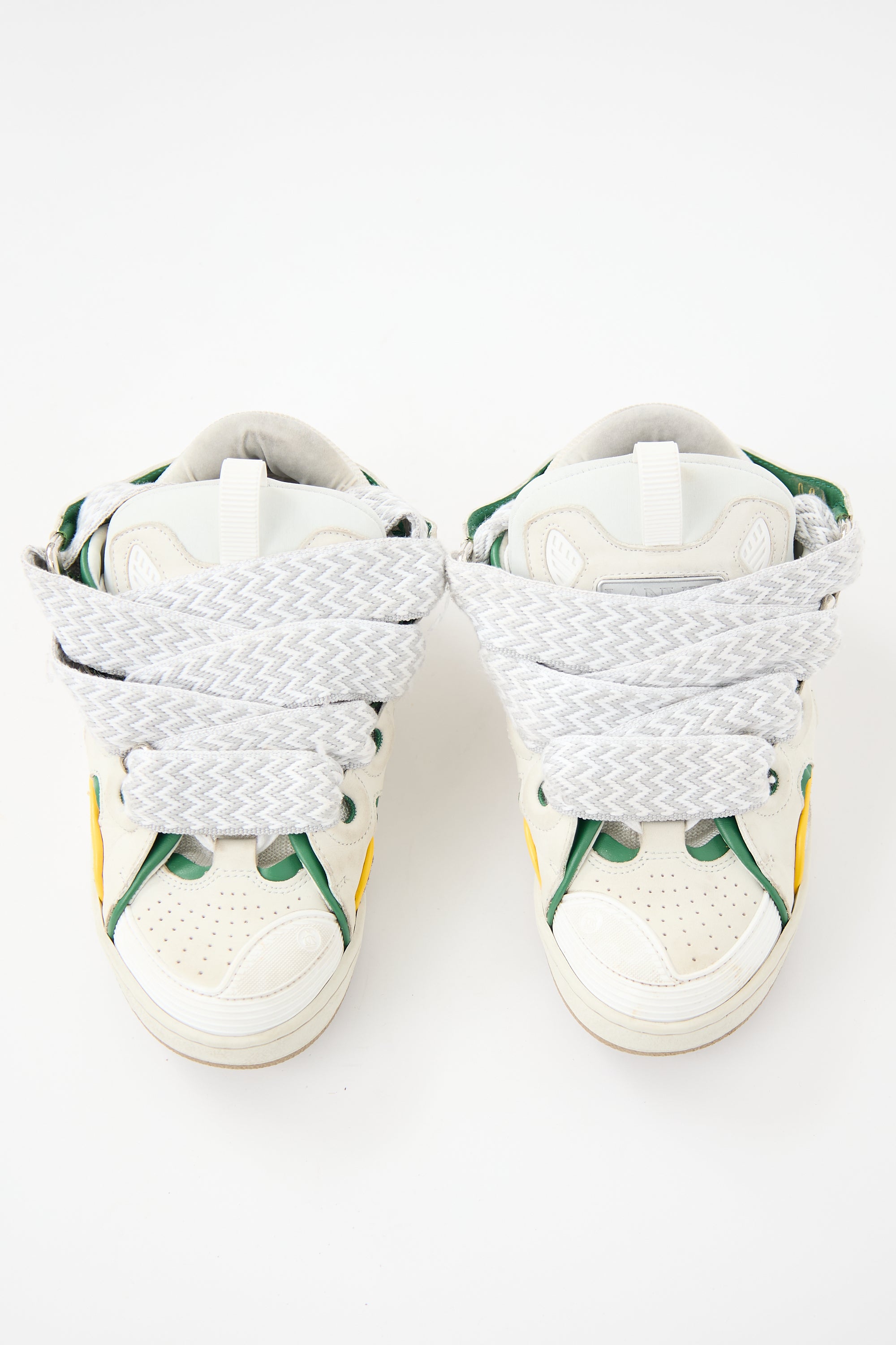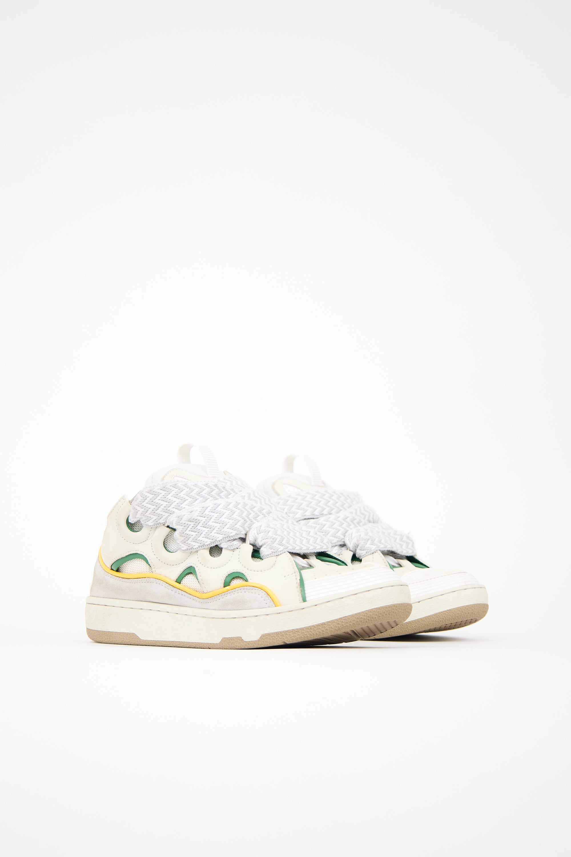 Pre-owned Lanvin beige and grey Curb sneakers featuring rounded toe, perforated toe box, suede panelled upper, wide shoelaces with chevron pattern, debossed logo and pull tab at tongue, and rubber sole.