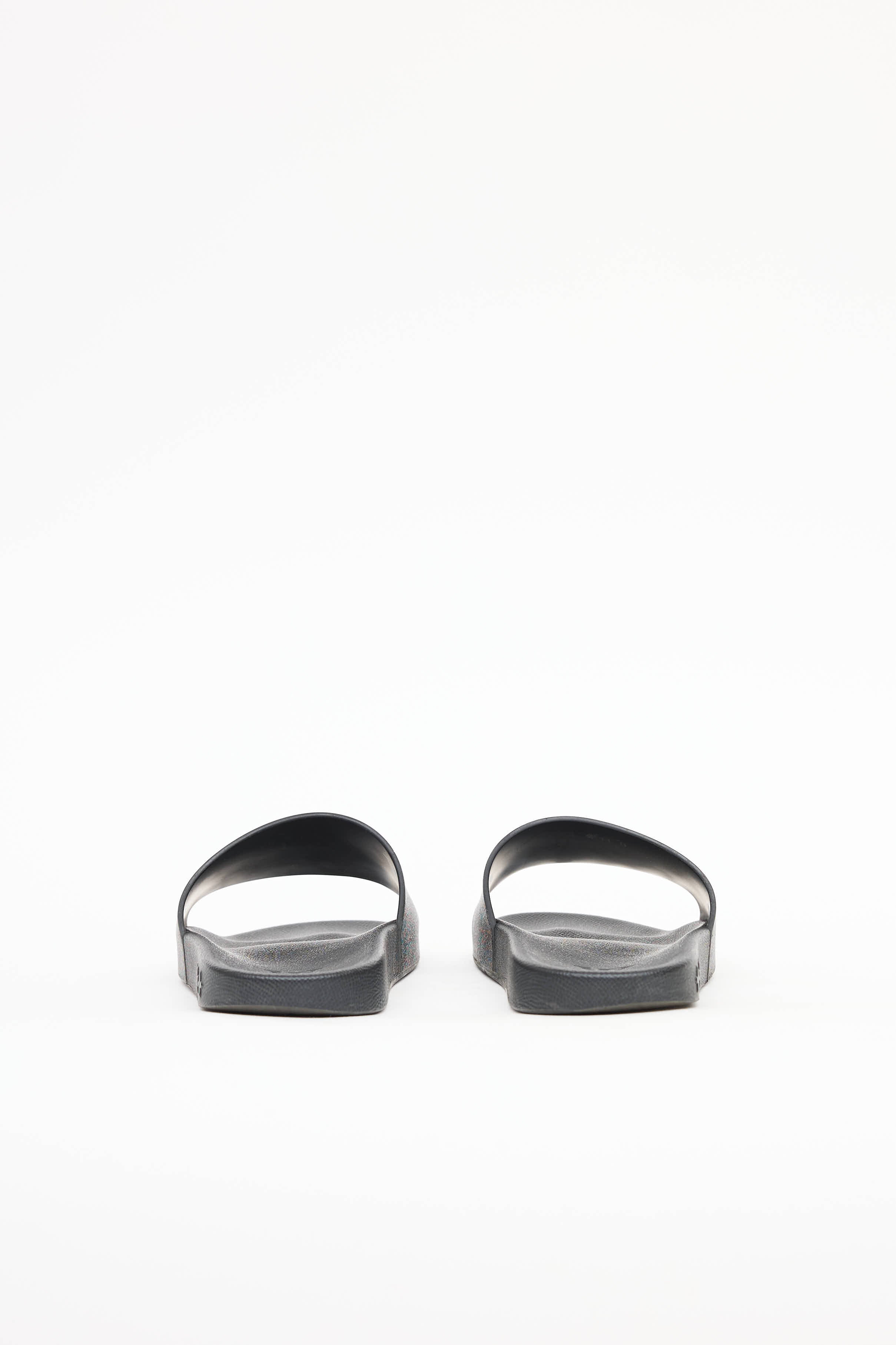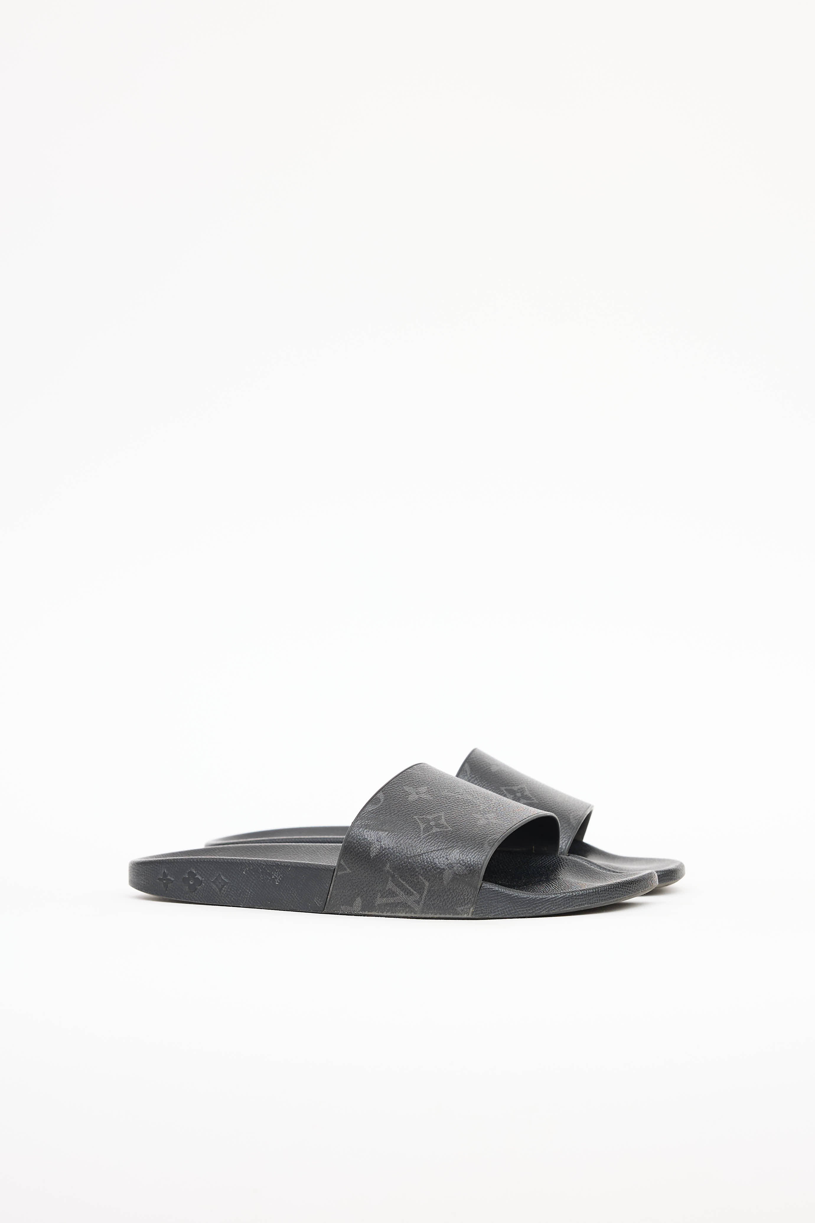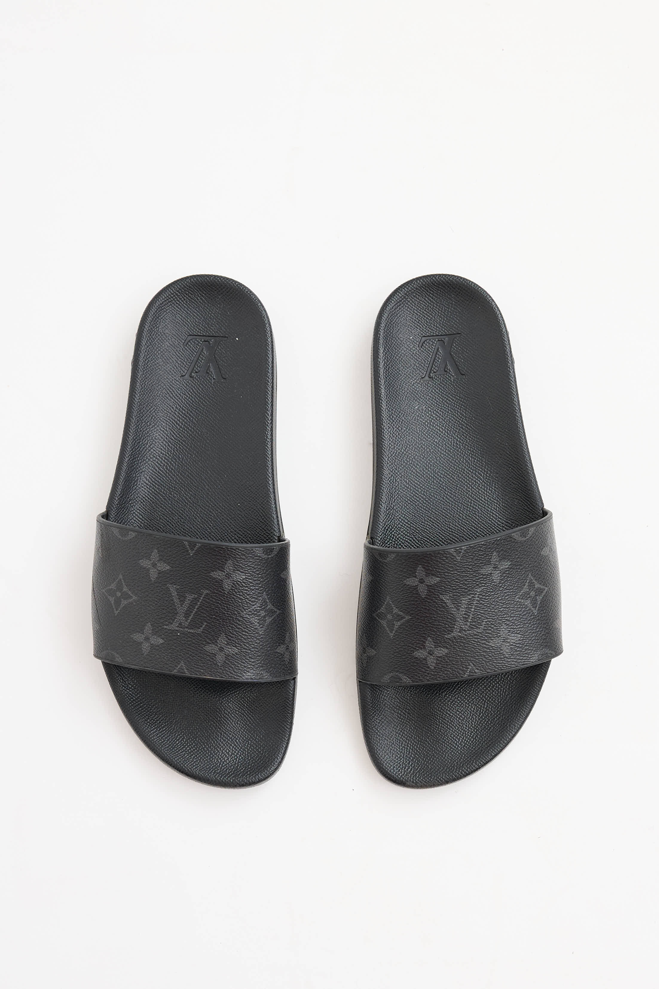 Pre-owned Louis Vuitton men's black Eclipse Waterfront slides featuring a open rounded toe, slip on entry grained rubber sole and monogram strap at vamp.