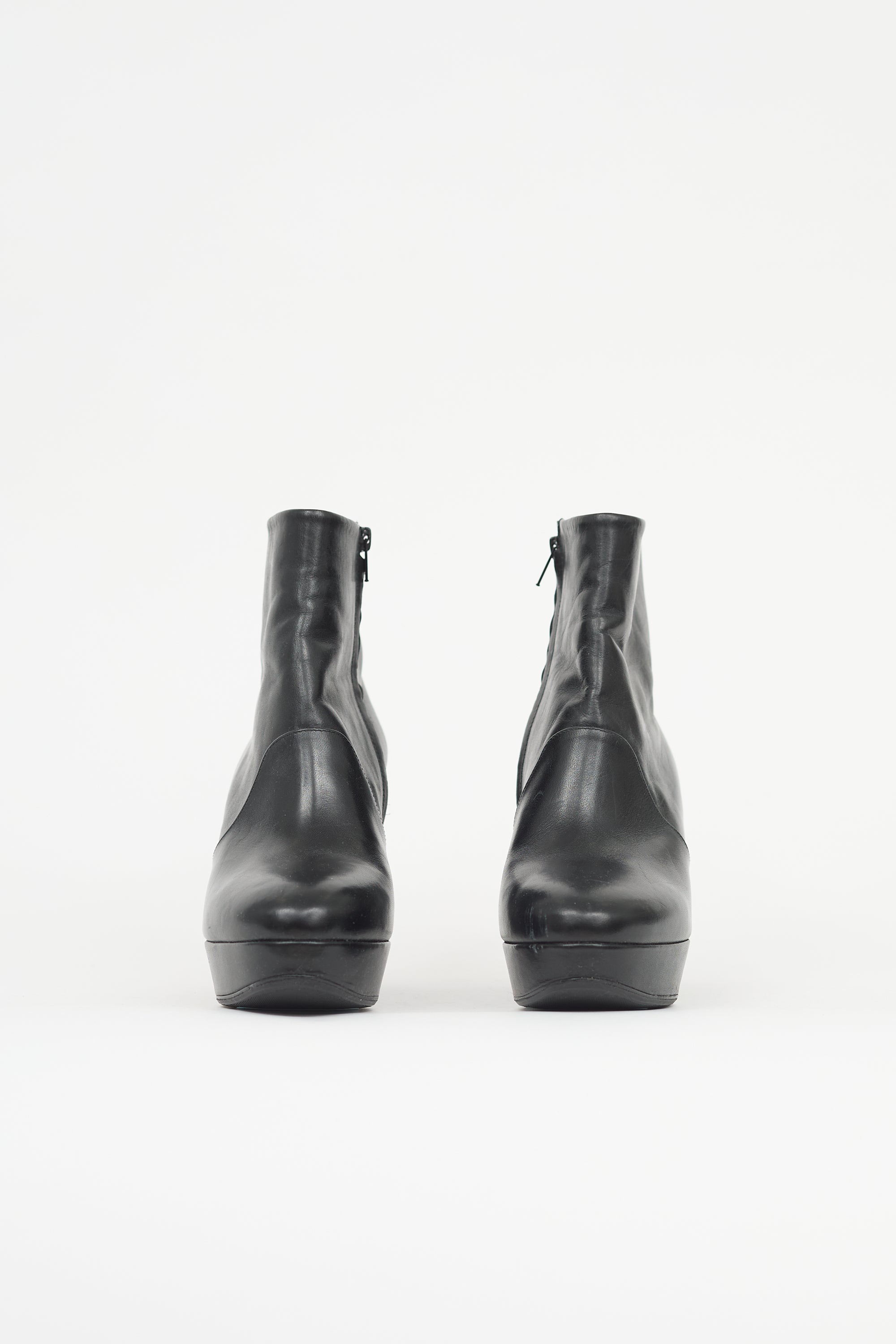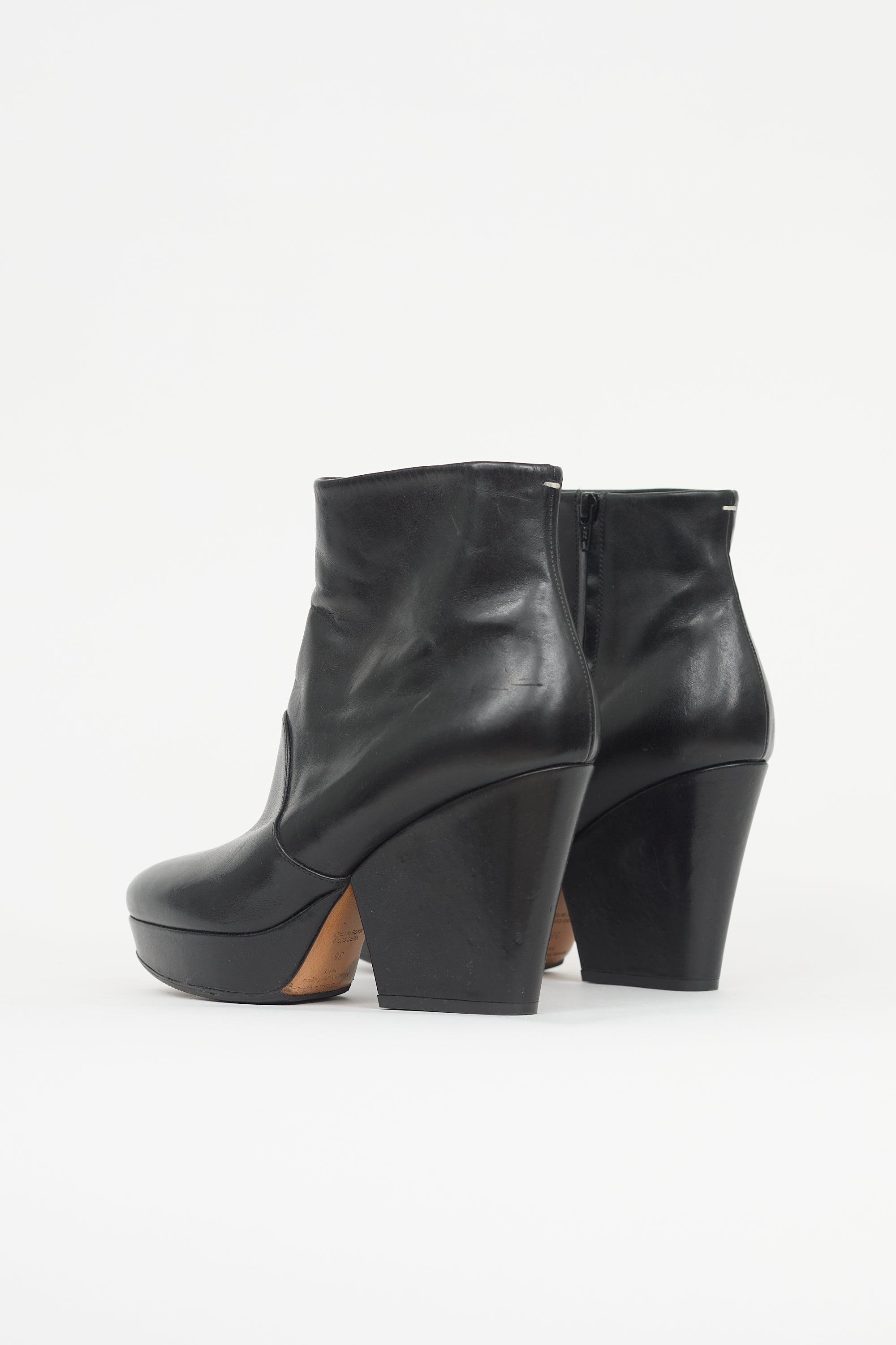 Pre-owned Maison Margiela black leather boots featuring rounded toe, side zip closure, platform toe box, wide heel, and signature single stitch at back. Includes original shoe covers.