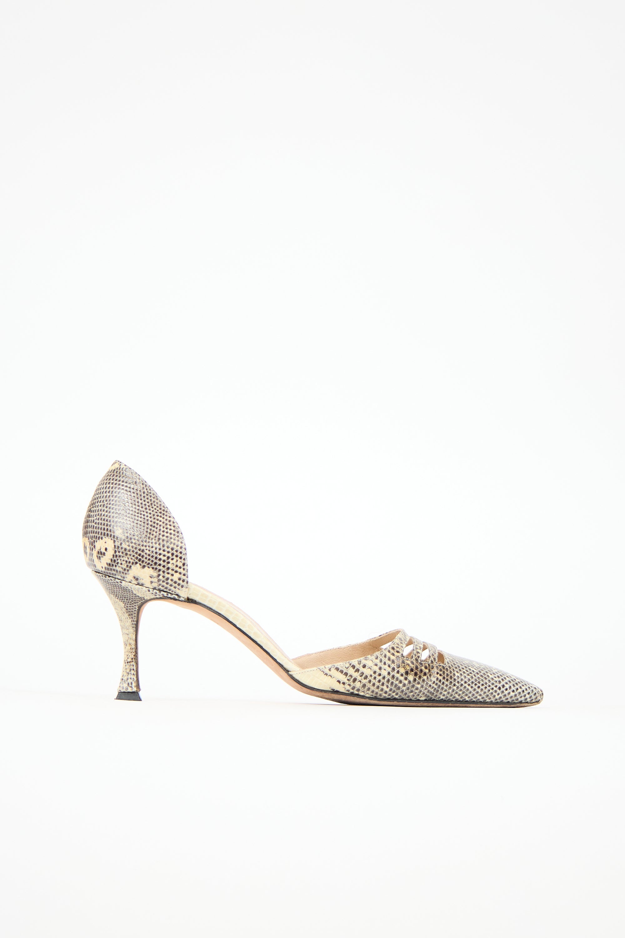 Pre-owned Manolo Blahnik cream and brown leather pumps featuring pointed toe, python upper, cut out vamp detail, D'Orsay design, and covered stiletto heel. Comes with original dust bags.