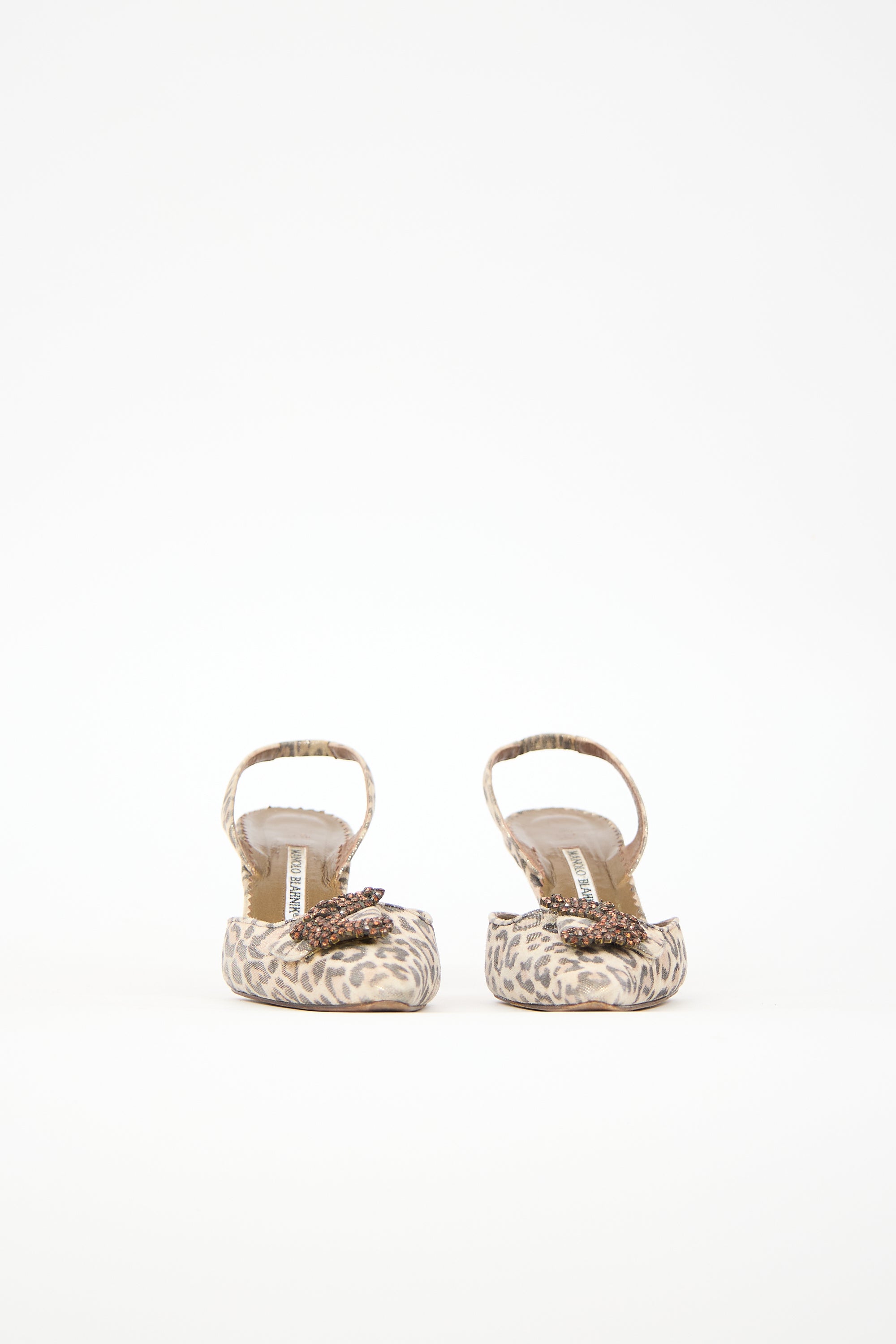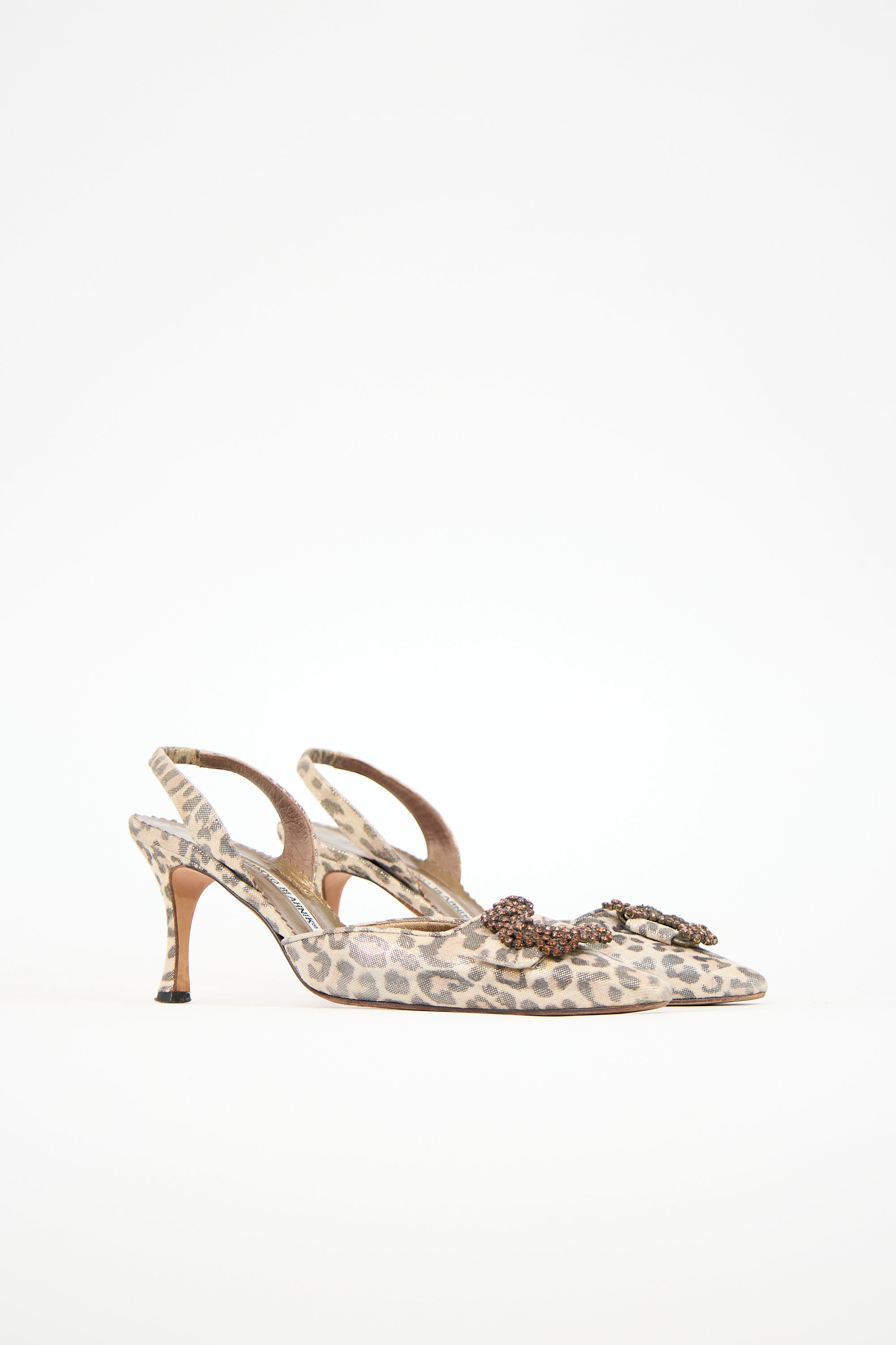 Pre-owned Manolo Blahnik beige and grey suede pumps featuring pointed toe, sparkly leopard print upper, brown crystal encrusted embellishment at vamp, elasticized slingback strap, and covered continental heel.