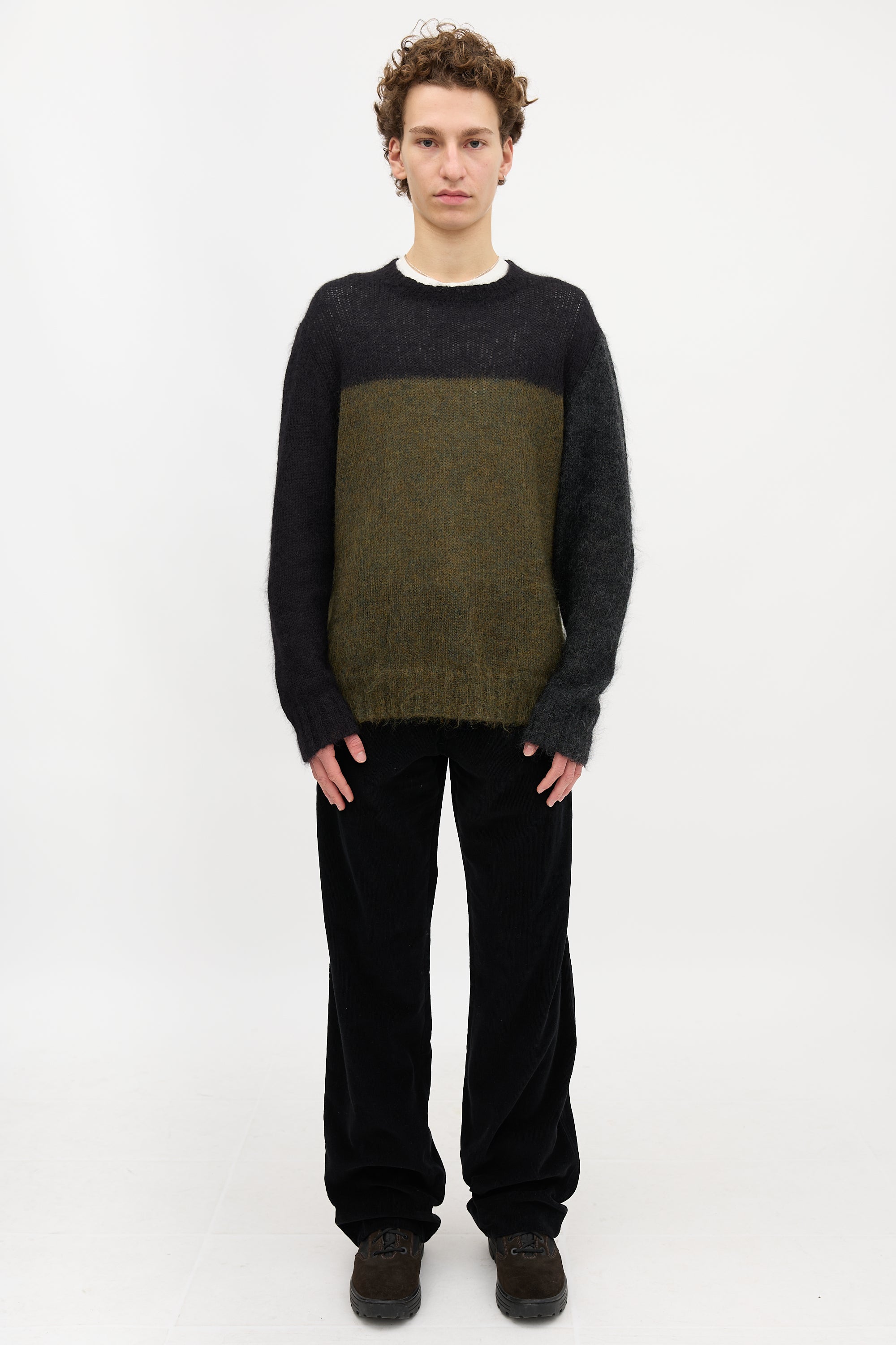 Pre-owned Marni black and green mohair blend colour block sweater featuring a crew neckline, one dark grey sleeve, and a ribbed hem and cuffs.