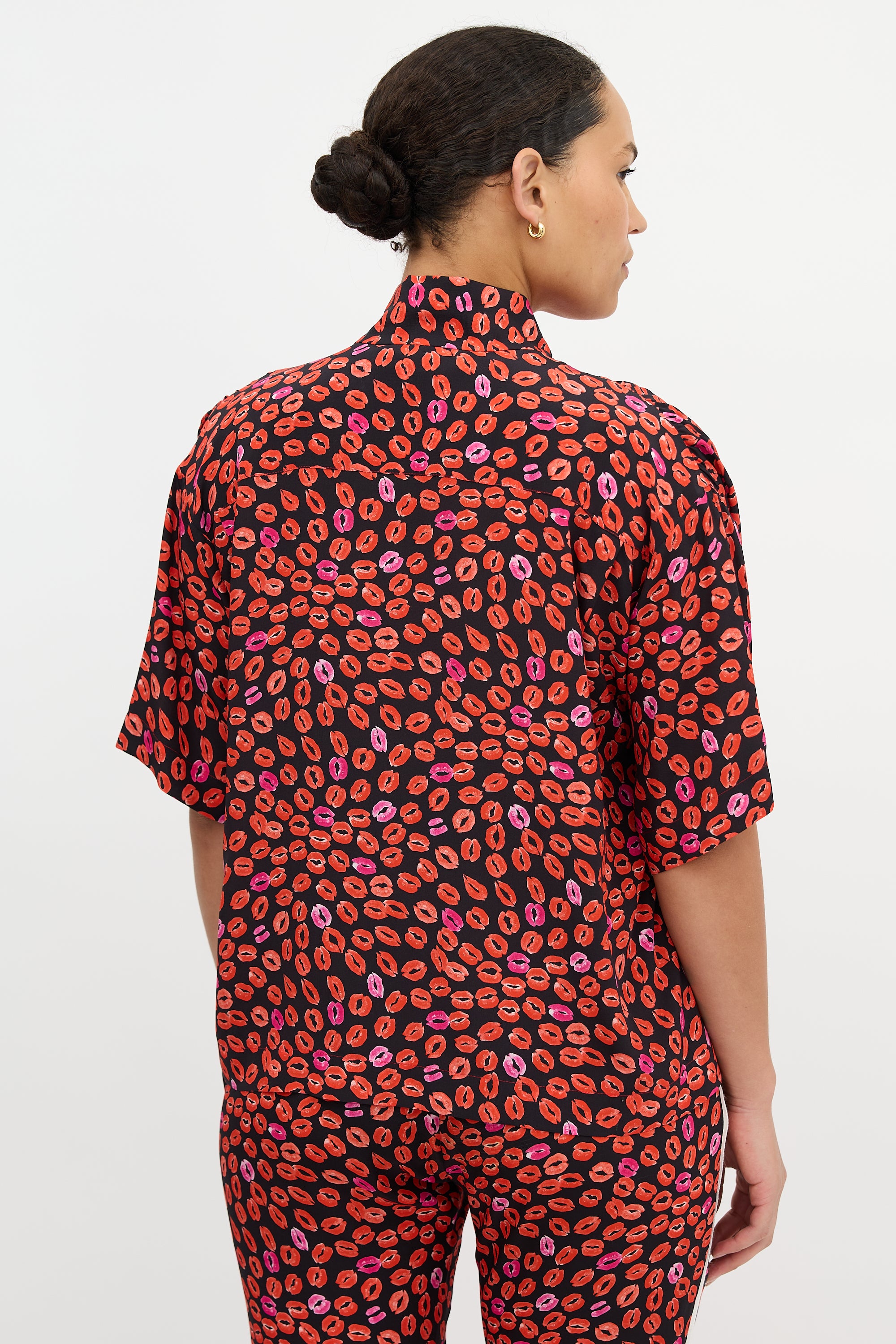 Pre-owned Marni red, pink, and black silk lip printed blouse featuring a mock neck with self-tie, button front, and gathered yoke.