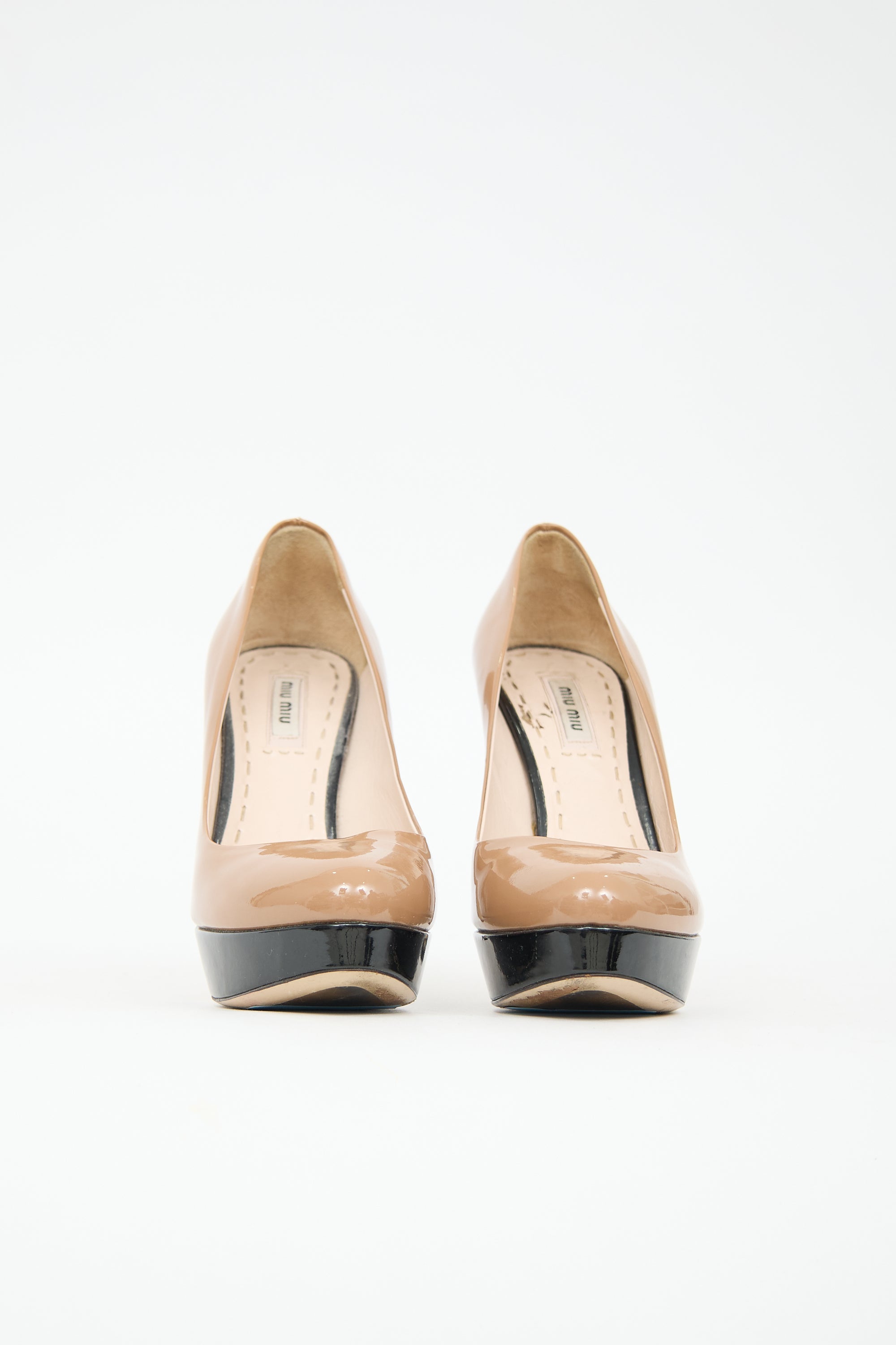 Pre-owned Miu Miu beige and black patent leather pumps featuring almond toe, covered platform, and straight heel.