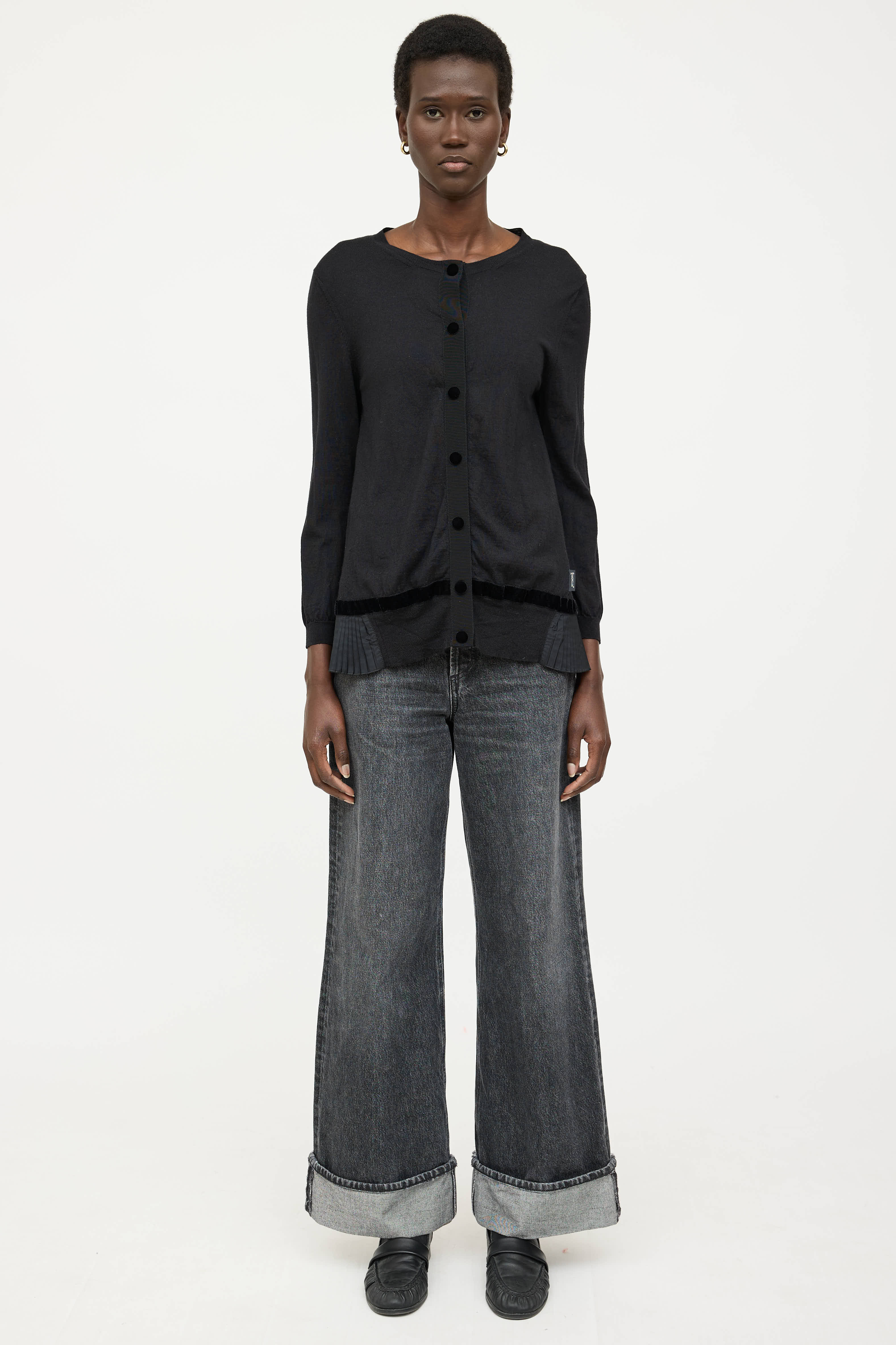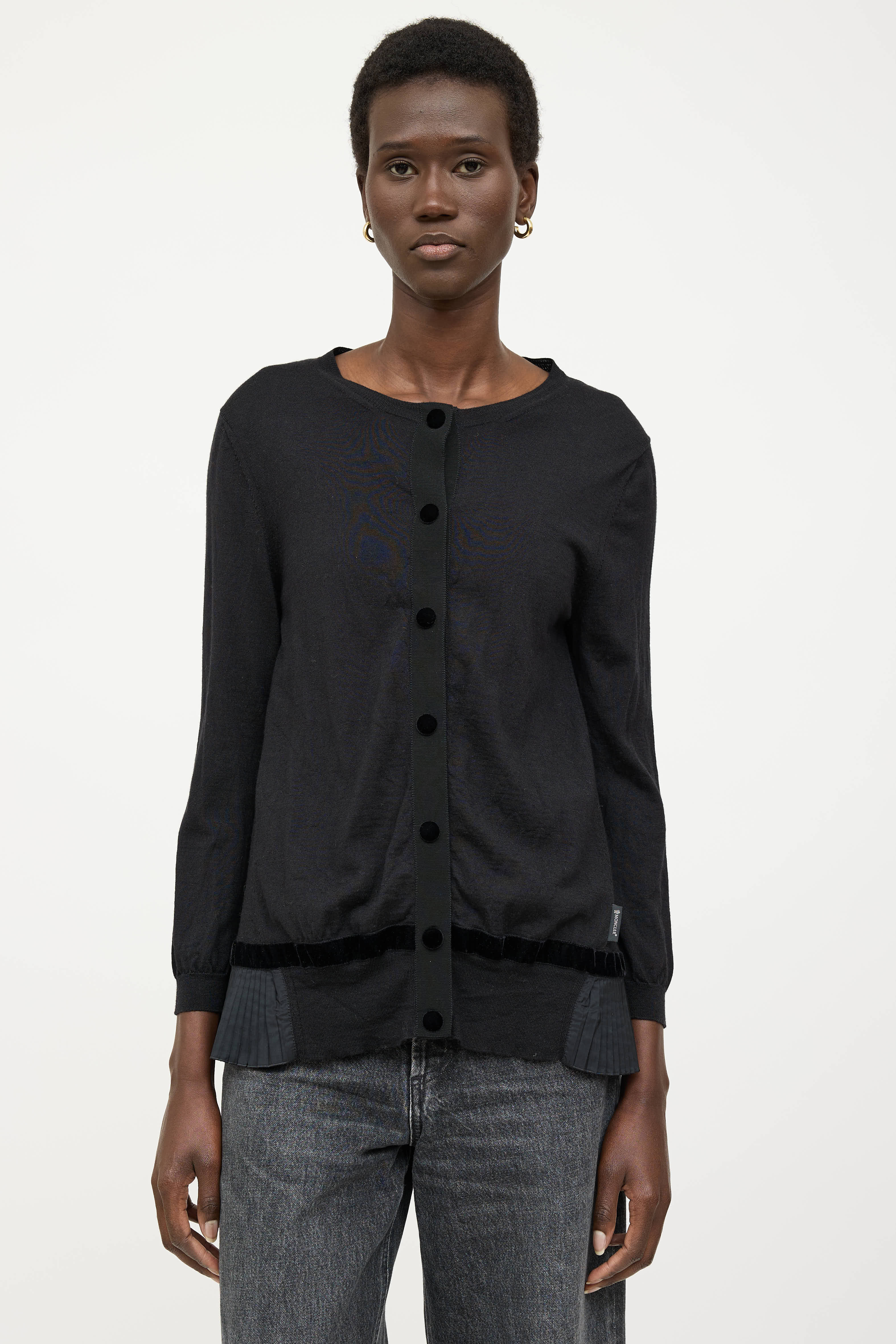 Pre-owned Moncler black Tricot wool knit cardigan featuring a round neckline, long sleeves, pleated hem, logo patch at hip, and snap button closure.