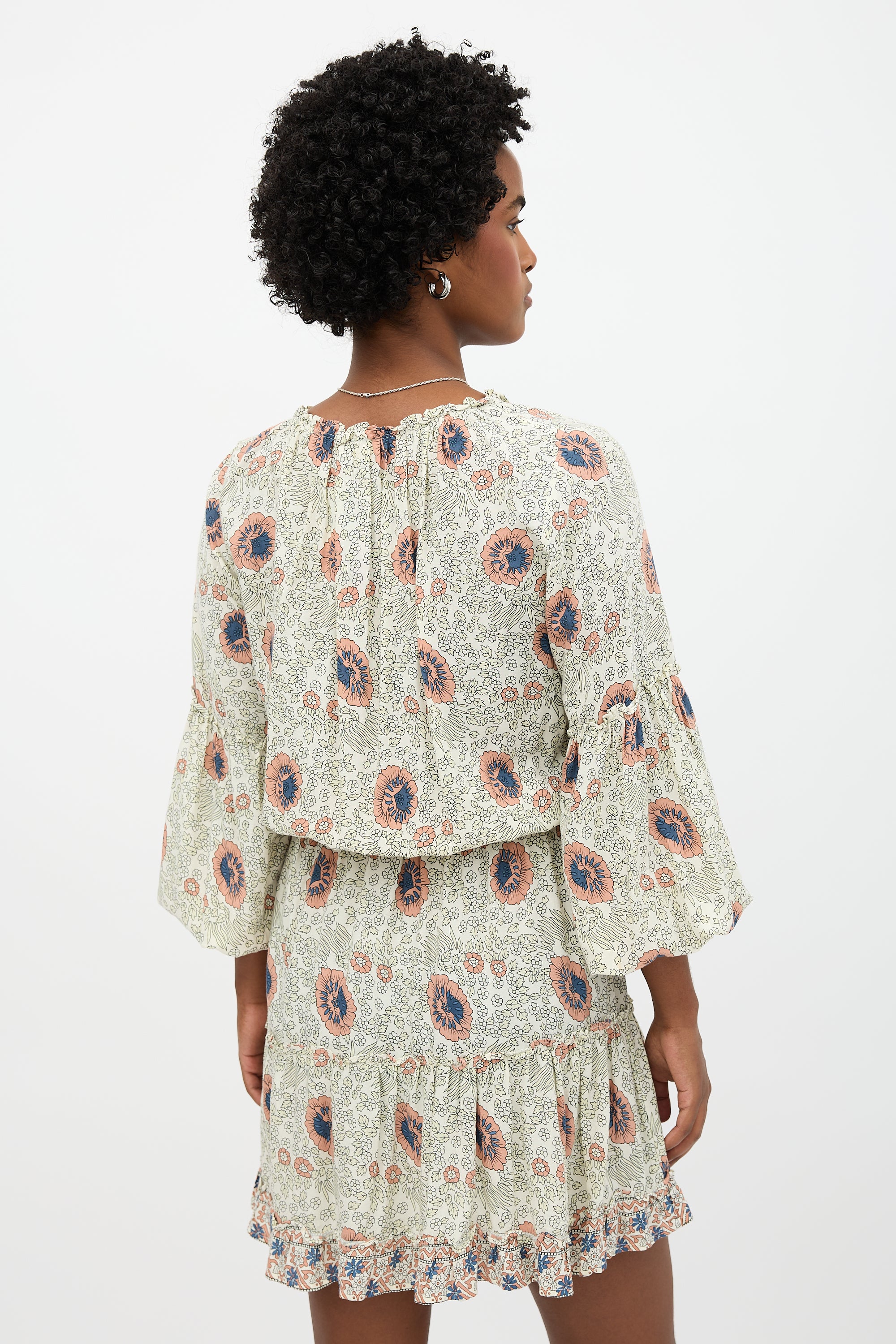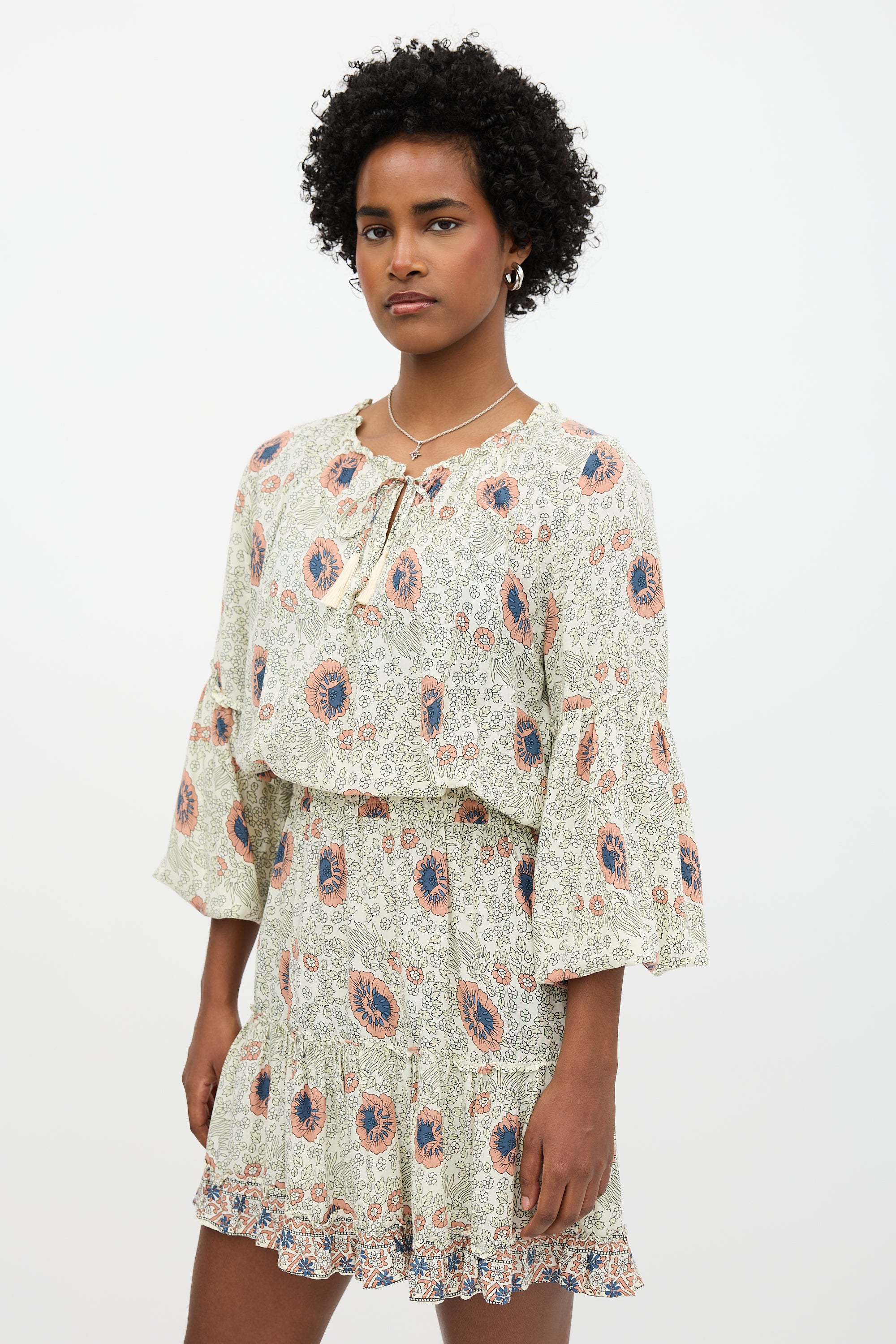 Pre-owned Natalie Martin cream and multicolour Maggie mini dress featuring floral print, split neckline, front tie with tassels, elasticized waist bad, ruffle trim, and elasticized cuffs.