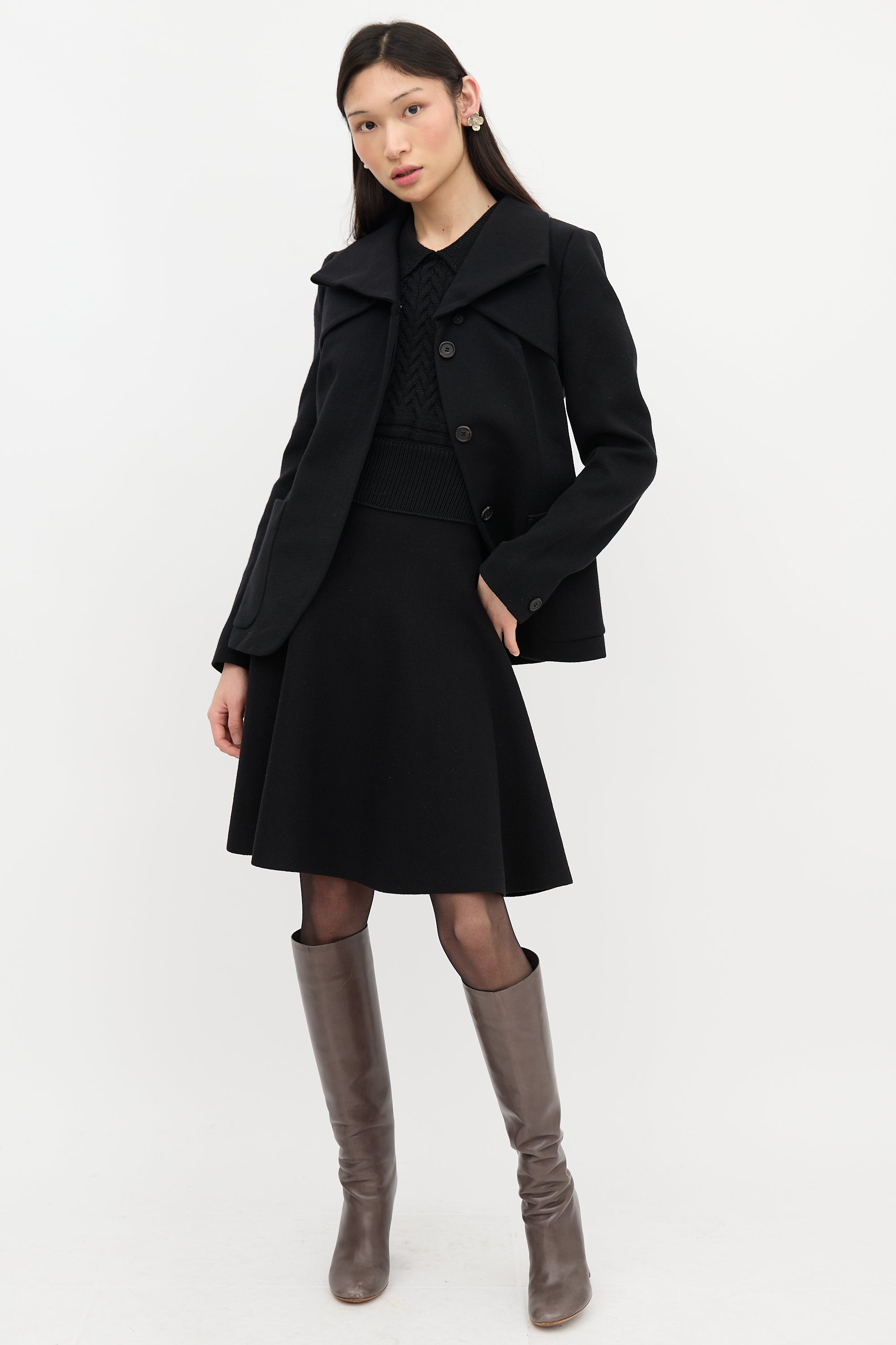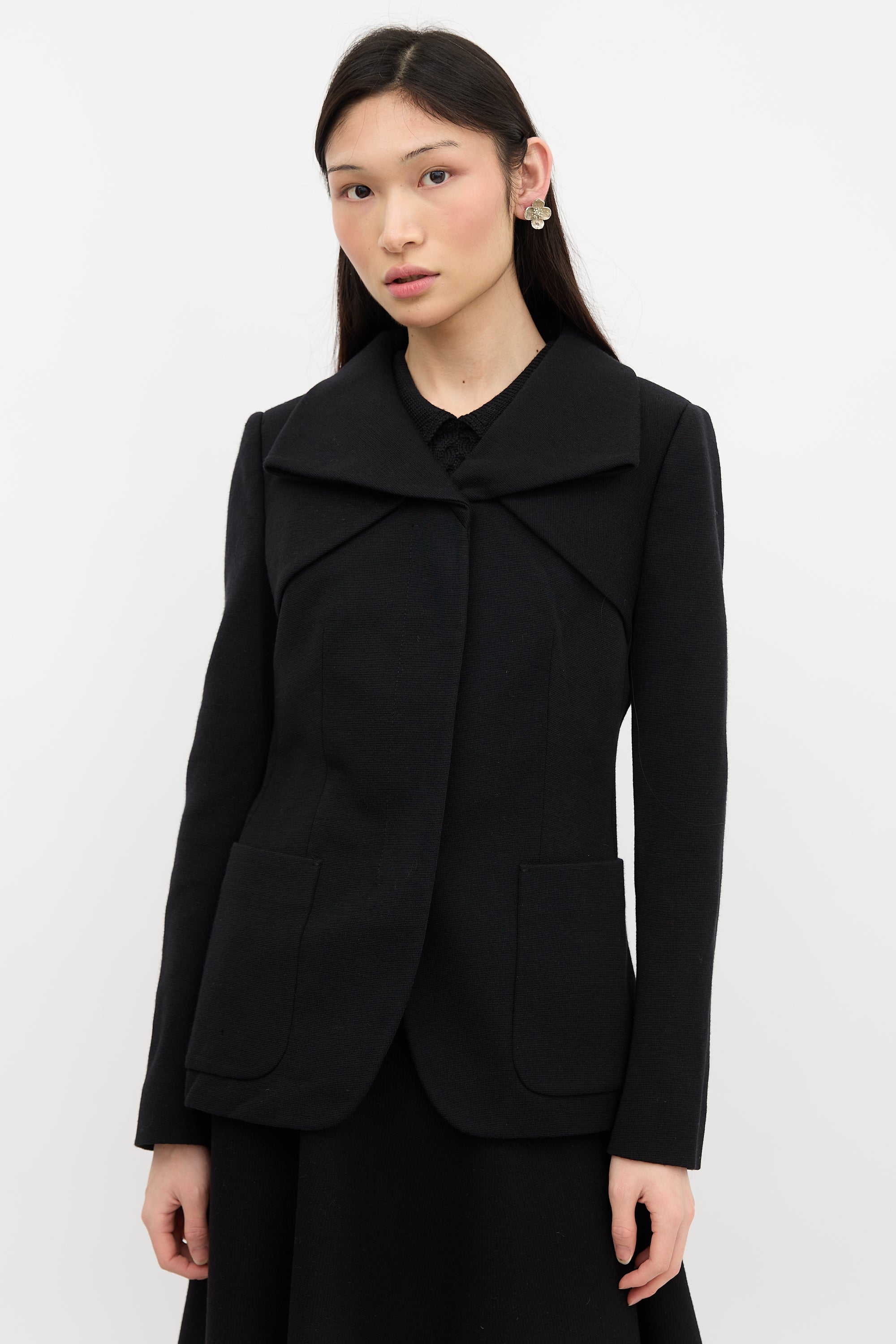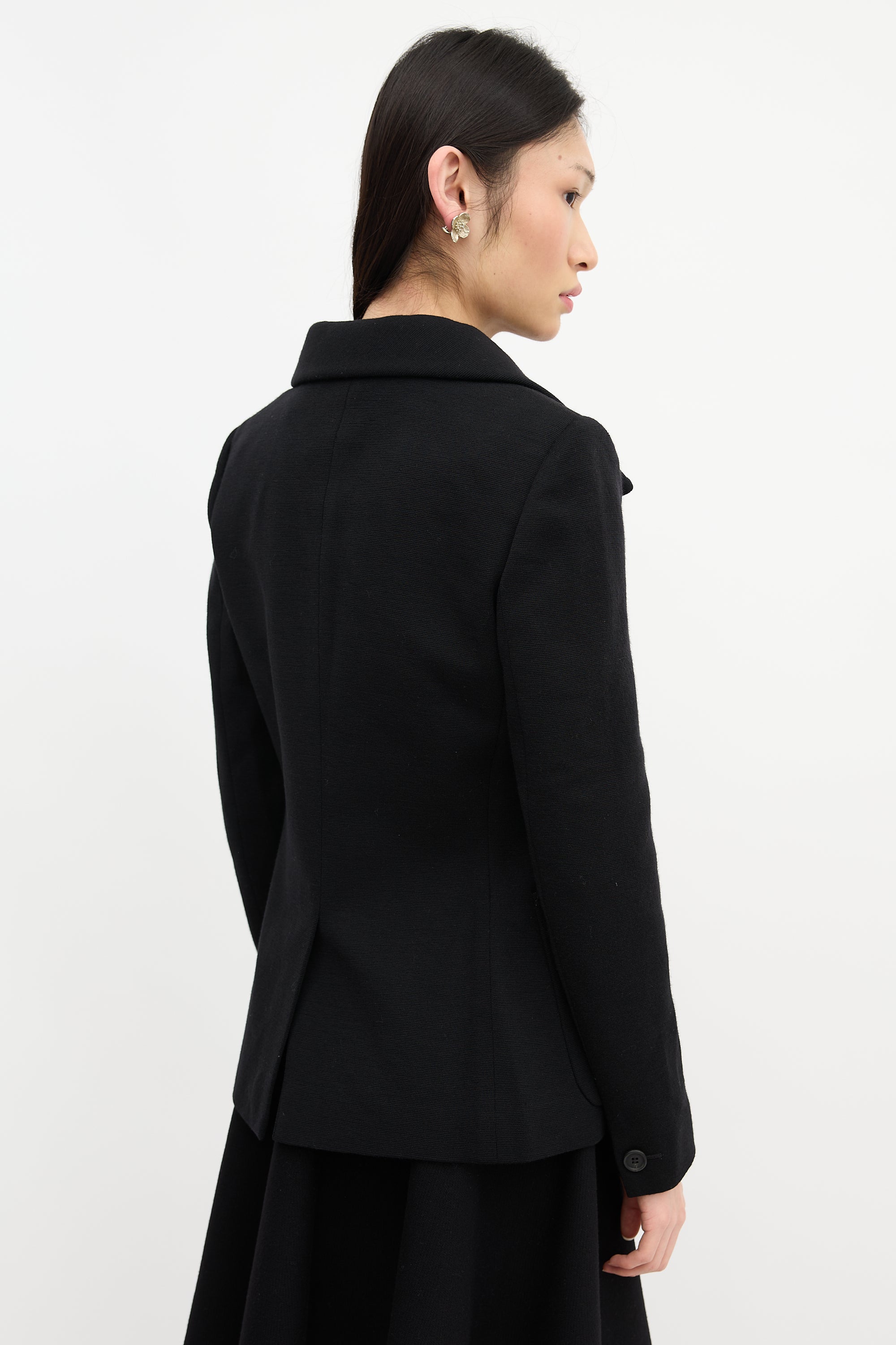 Pre-owned Prada 2009 black wool jacket featuring wide folded collar, concealed button up front, two front patch pockets, back vent, padded shoulders, and buttoned cuffs. Lined.