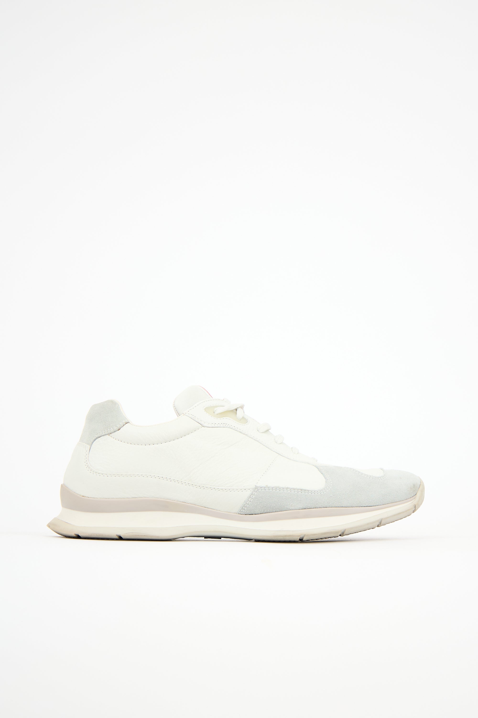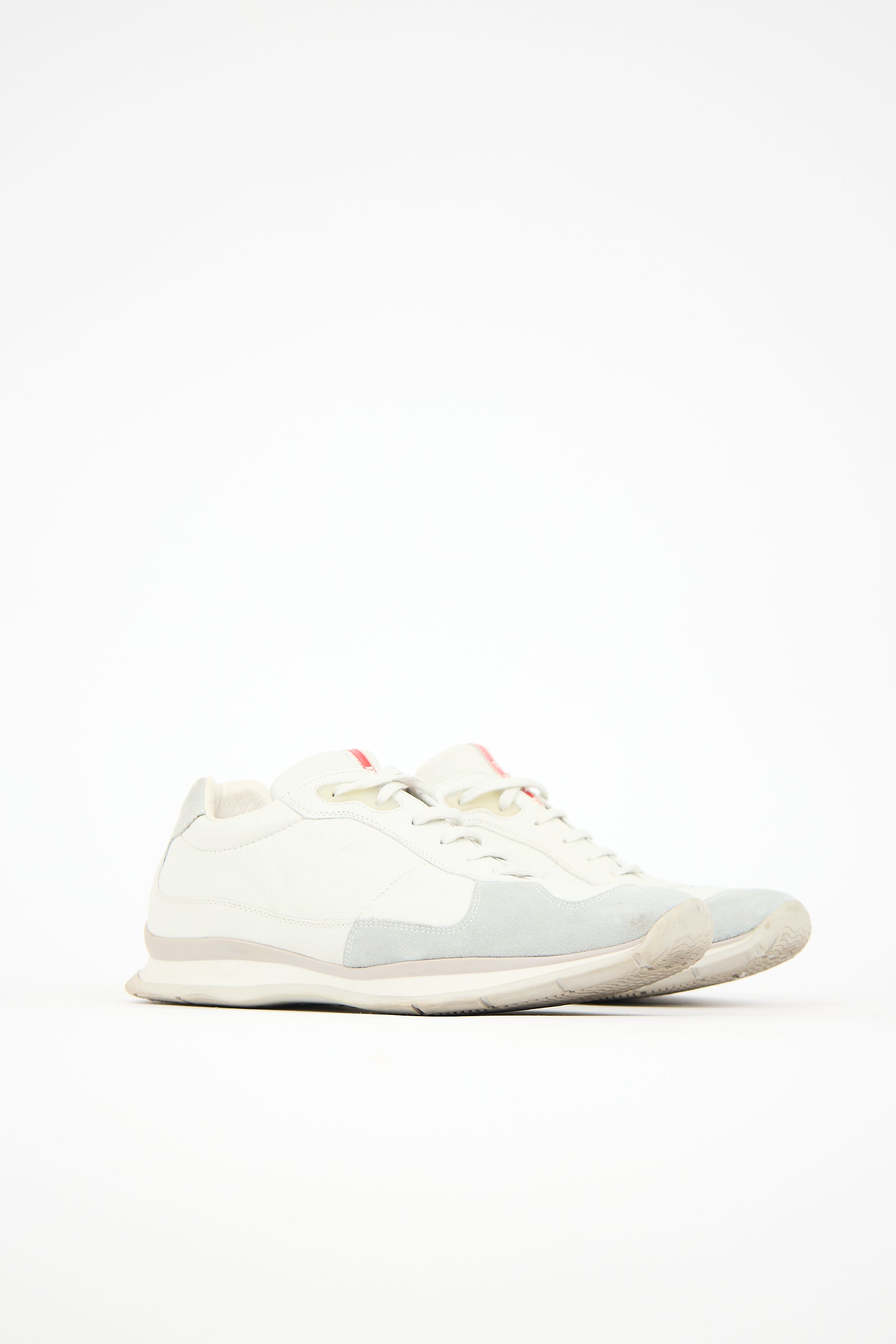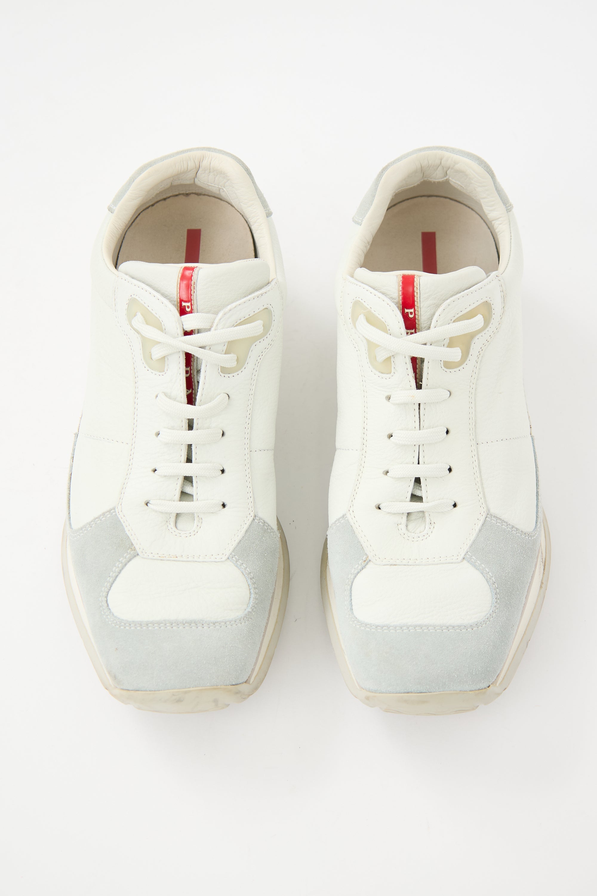 Pre-owned Prada Sport green leather sneakers featuring square toe, lace up front, suede and leather upper, and rubber outsole.