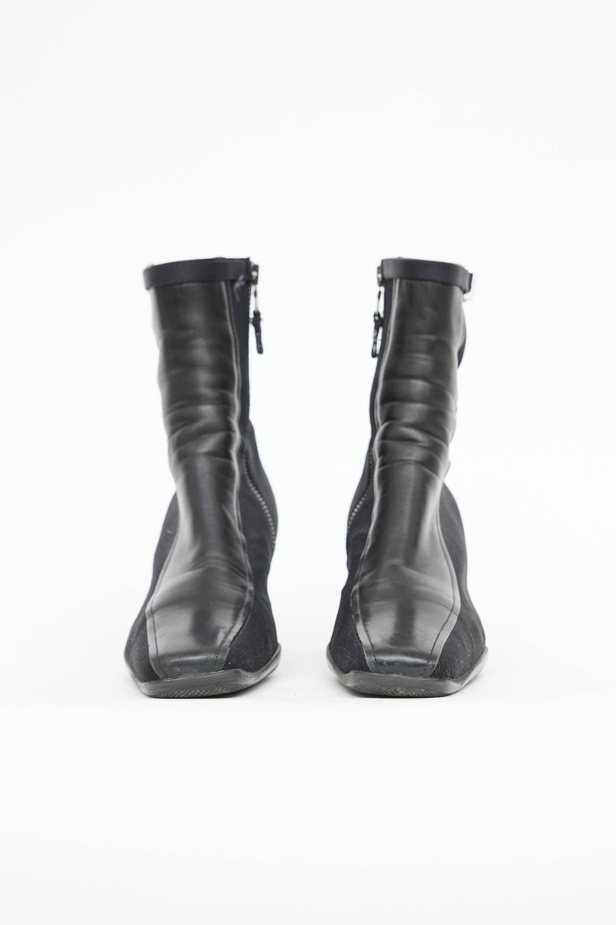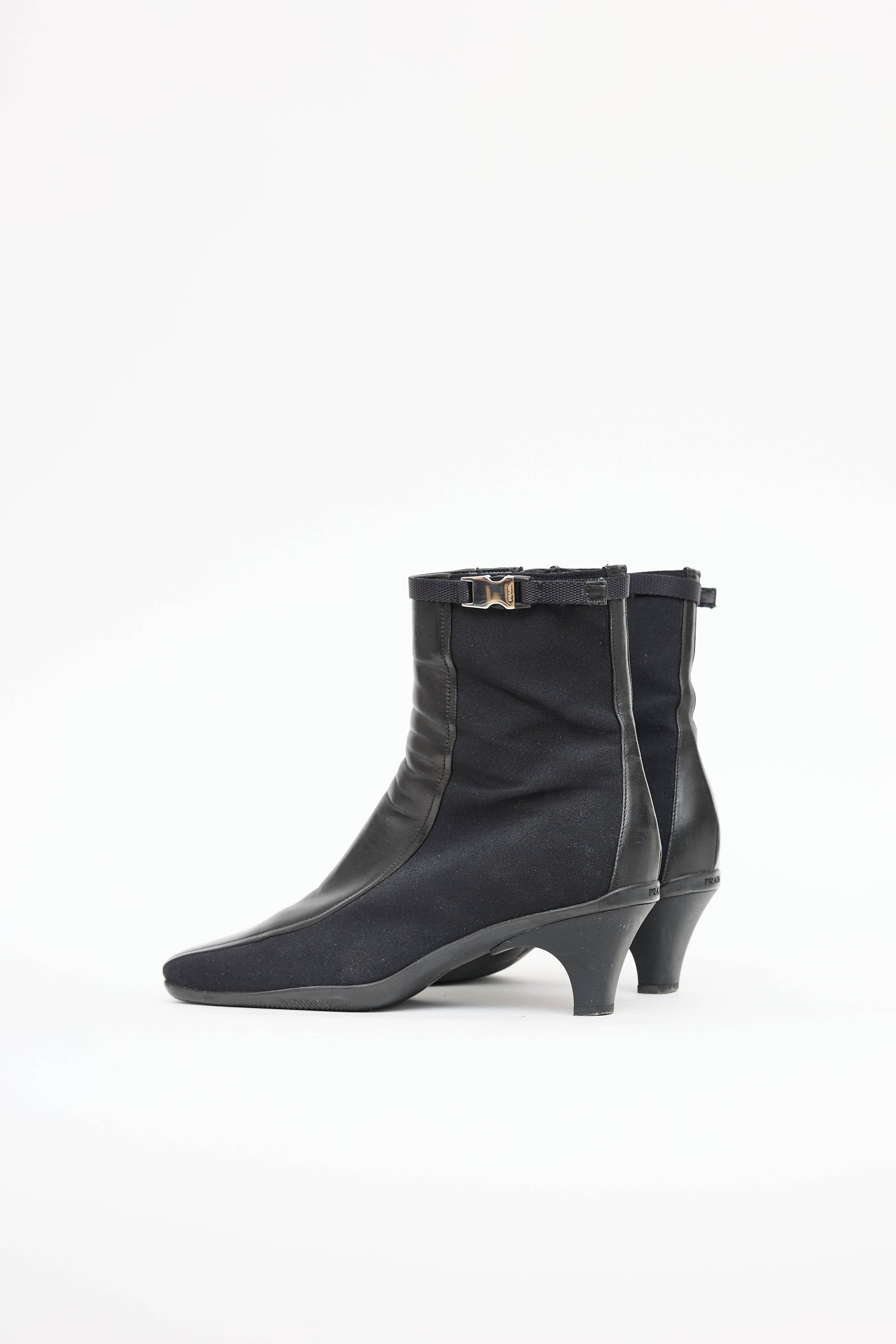 Pre-owned Prada Sport black ankle boots featuring a square toe, leather and canvas panelled upper, debossed logo at counter, side zip entry and webbed strap at opening with silver toned logo debossed buckle.