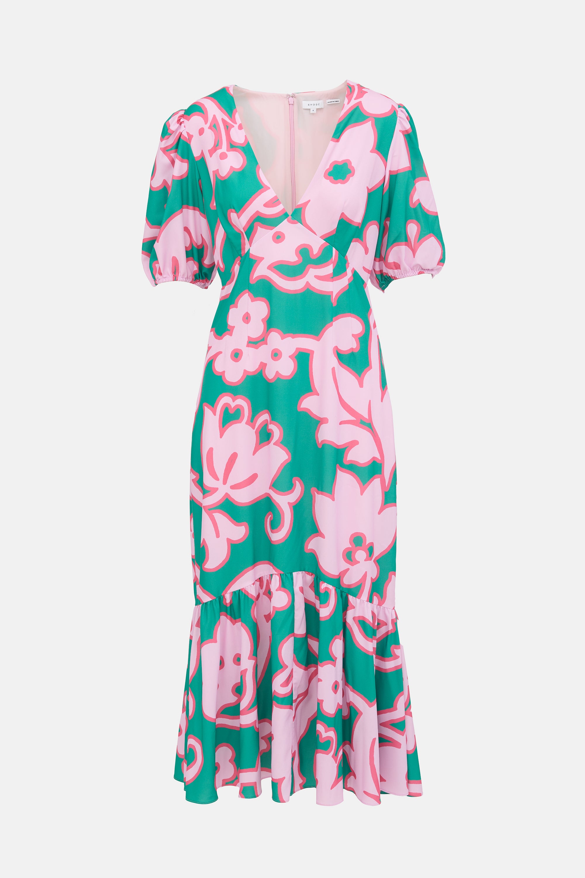 Pre-owned Rhode green and pink floral printed Ester dress featuring a V-neckline, back zip closure, short puff sleeves with elasticized cuffs, and a flounce hem. Lined.