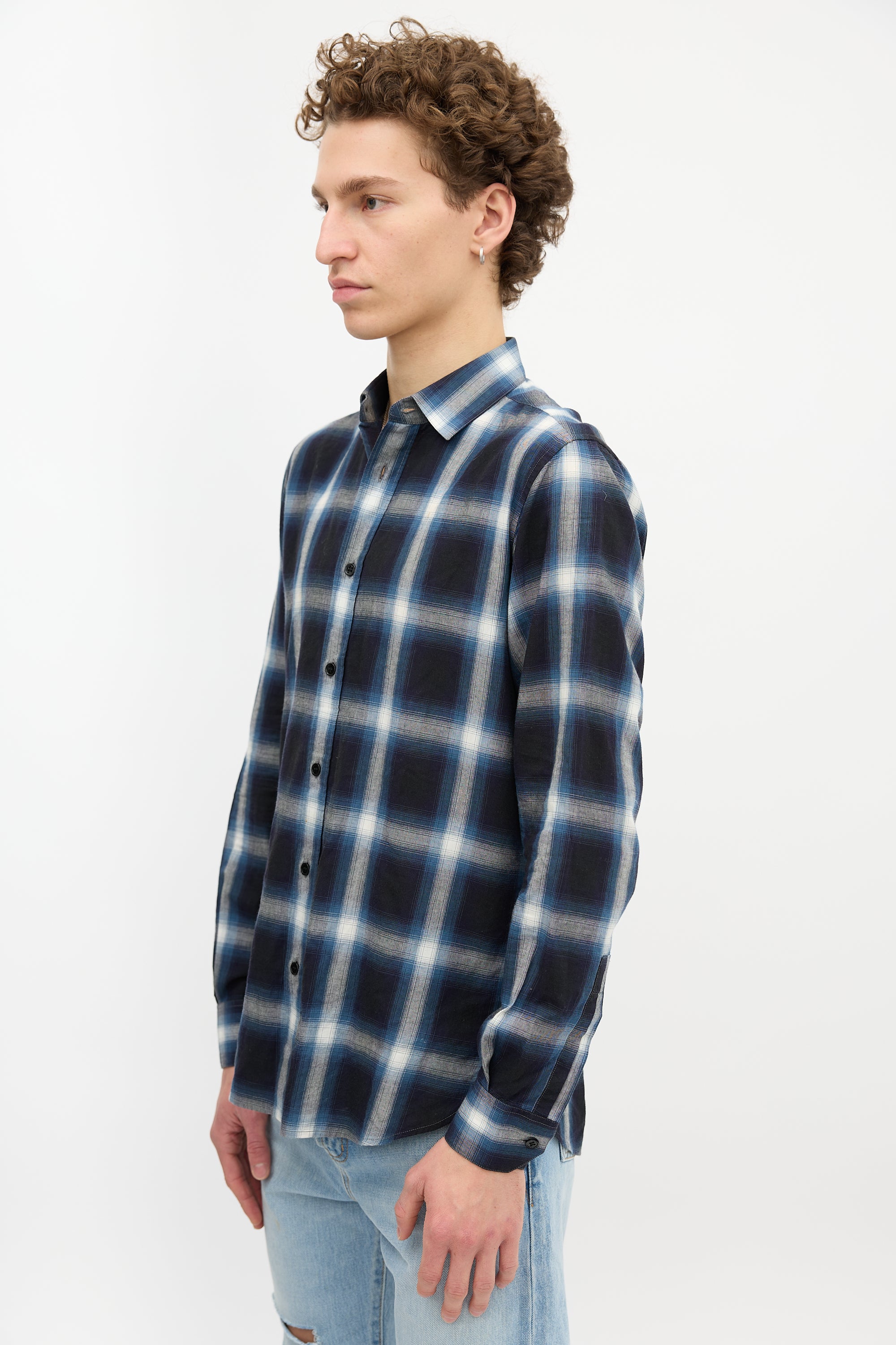 Pre-owned Saint Laurent 2014 blue and white plaid flannel shirt featuring a point collar, button front, and buttoned cuffs. Hedi Slimane era design.