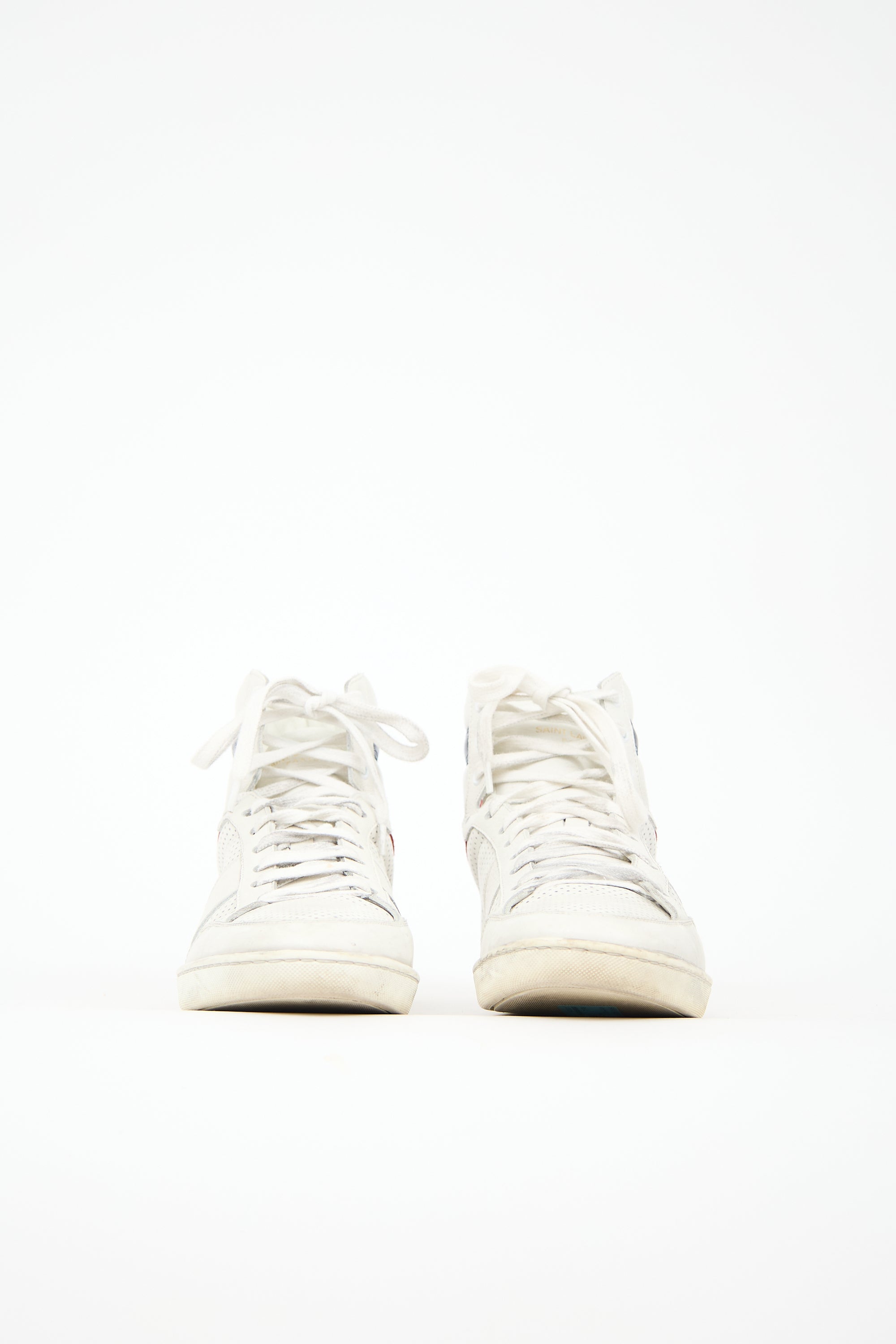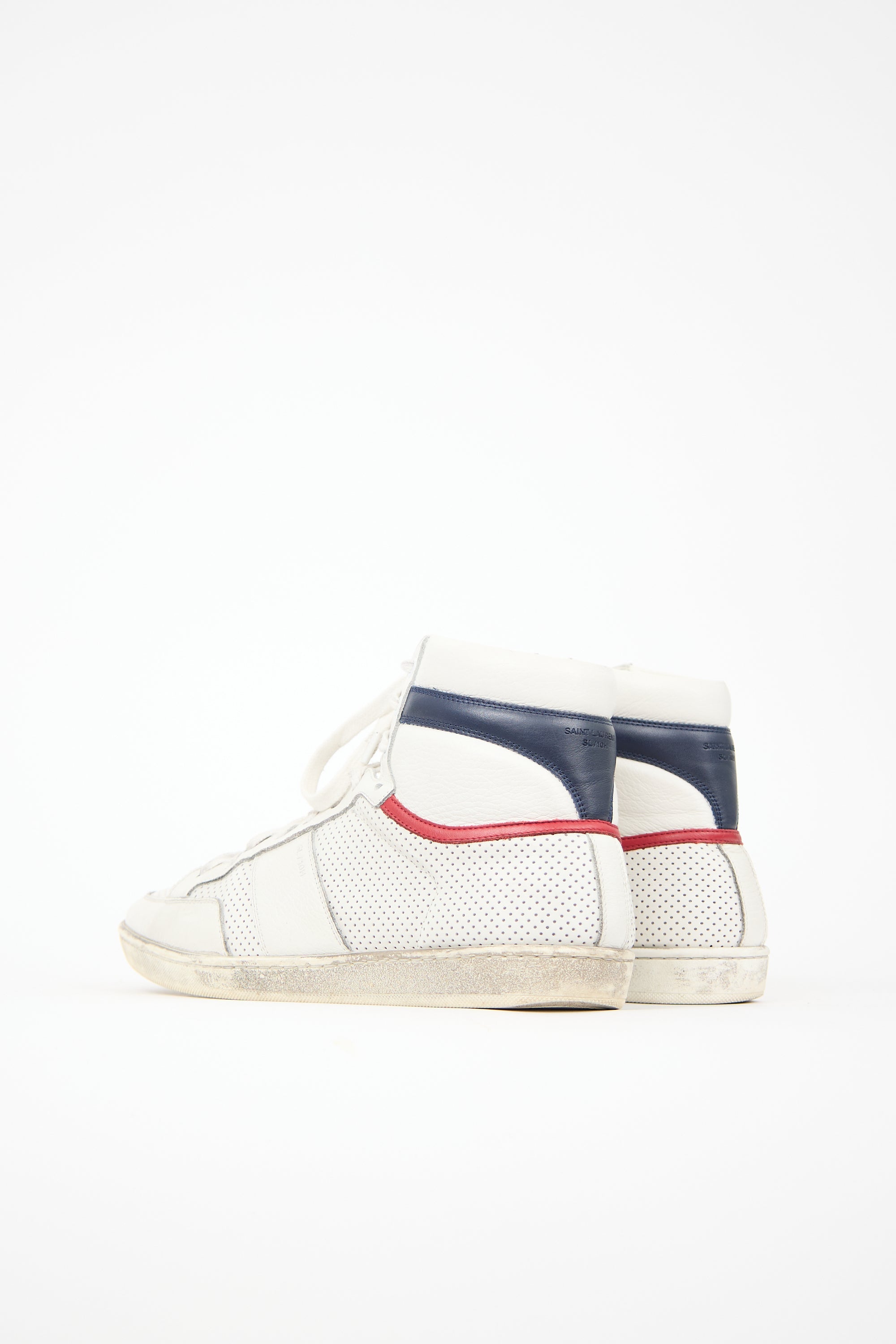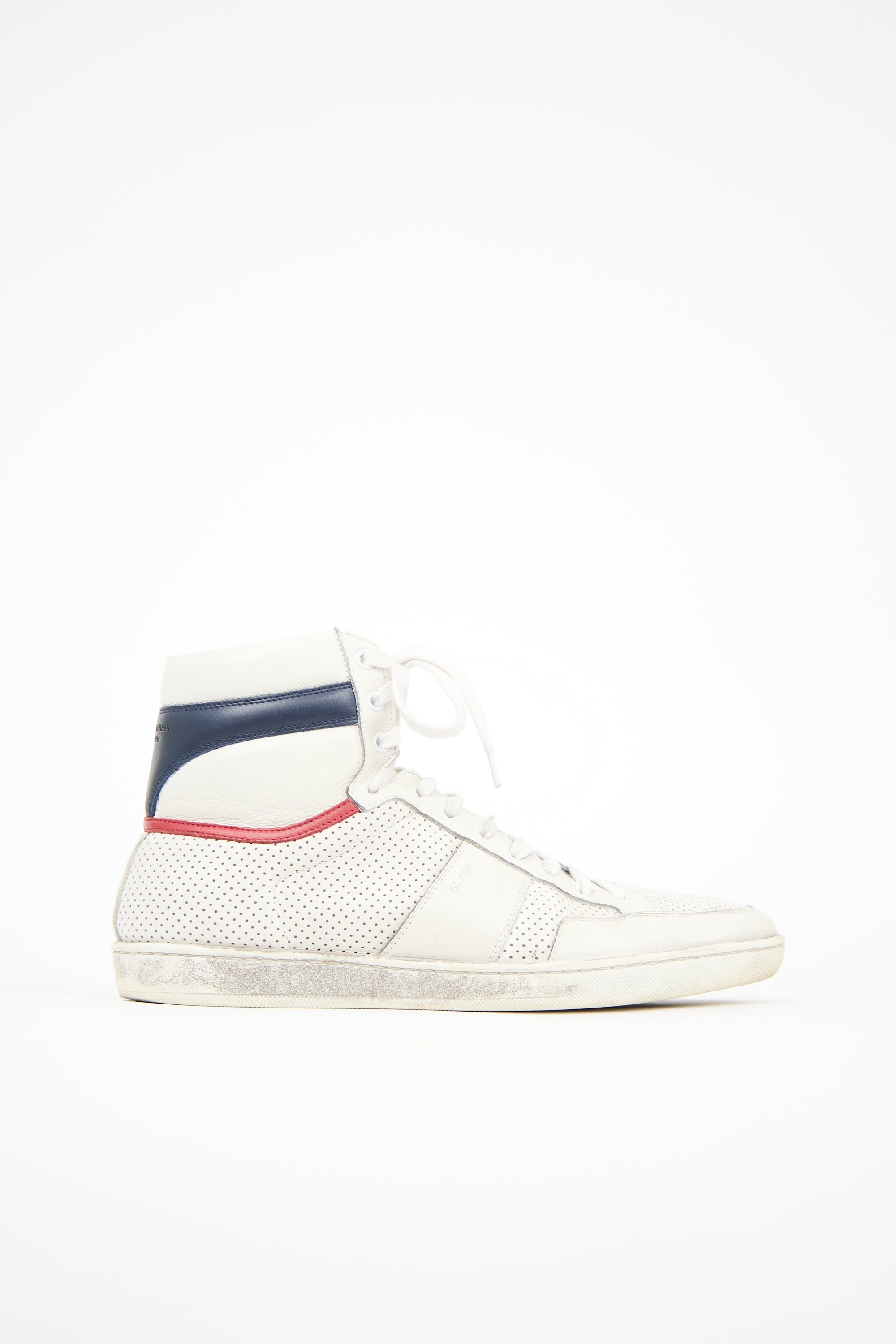 Pre-owned Saint Laurent white leather SL10H sneakers featuring rounded toe, lace up front, perforated leather upper, navy and red trim at back, and rubber outsole.