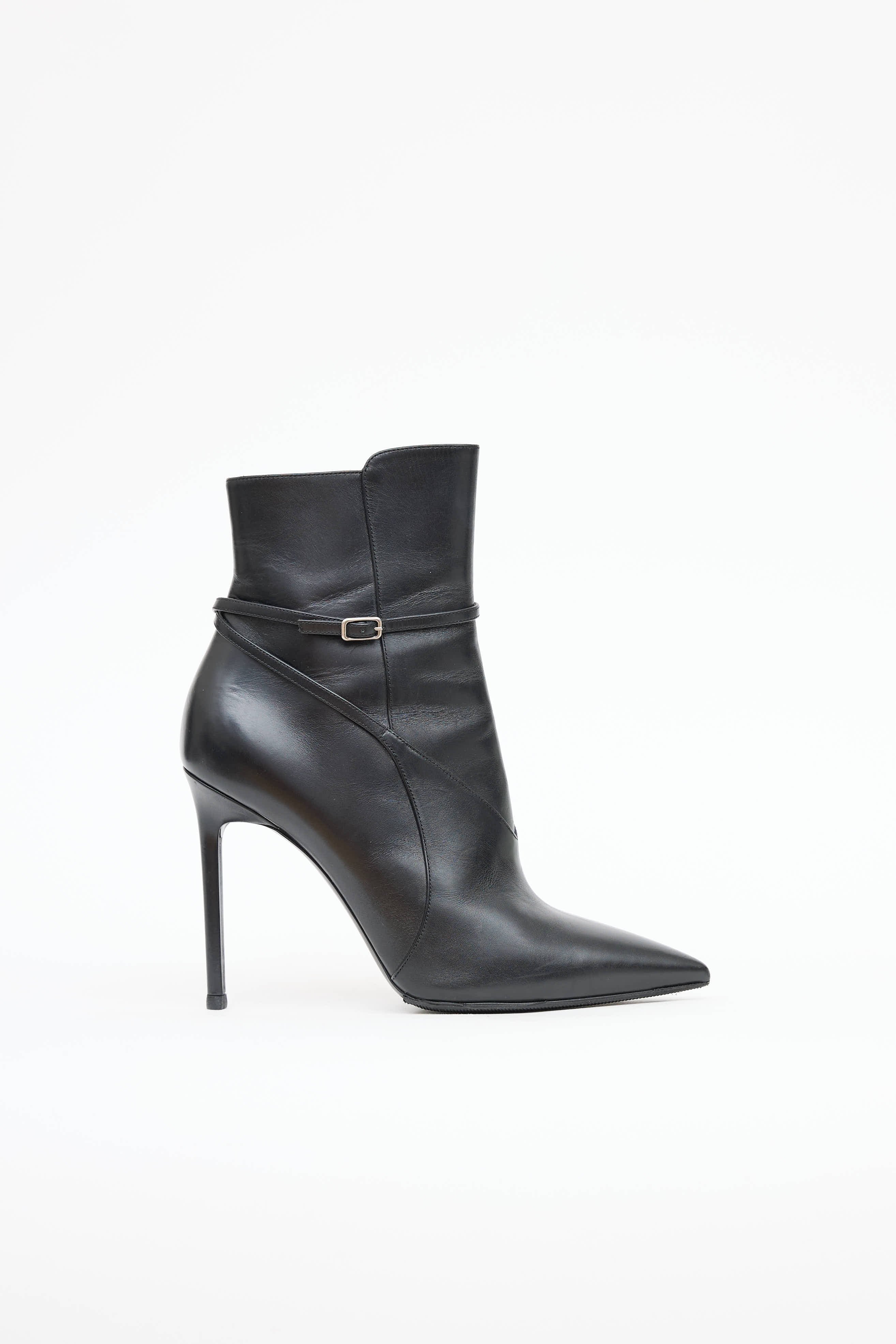 Pre-owned Saint Laurent black Mica ankle boots featuring a pointed toe, panelled leather upper, side zip entry, wrapped strap at ankle with silver toned buckle and covered stiletto heel.