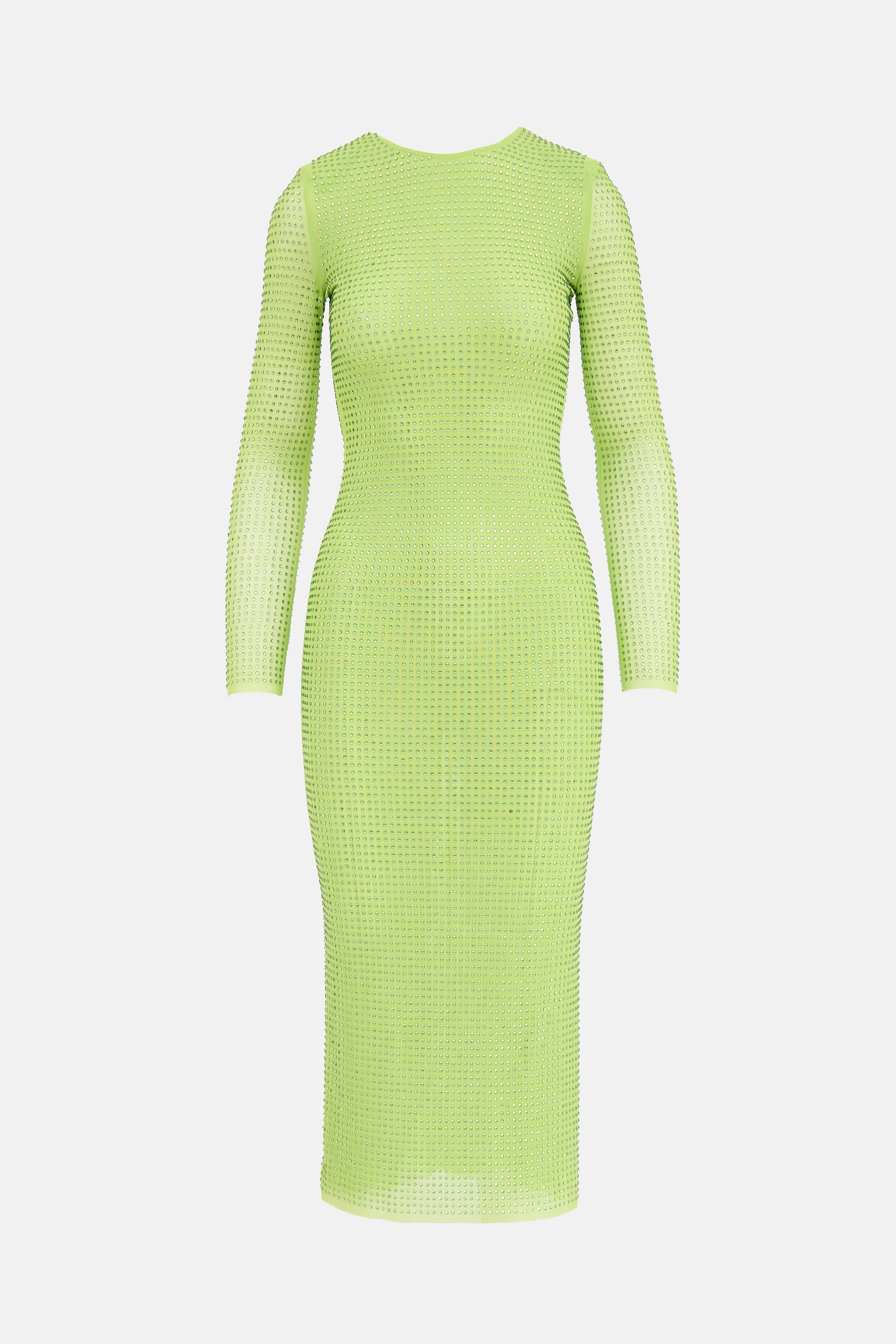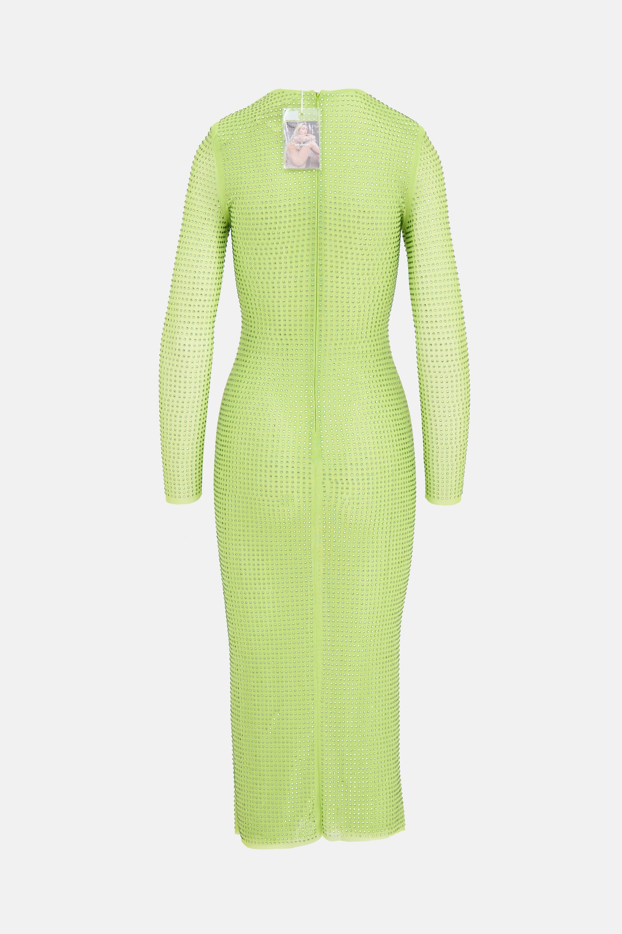 Self-Portrait green Hot Fix Midi mesh dress featuring sequin embellishment, padded shoulders, rounded neckline, and zip closure at back.