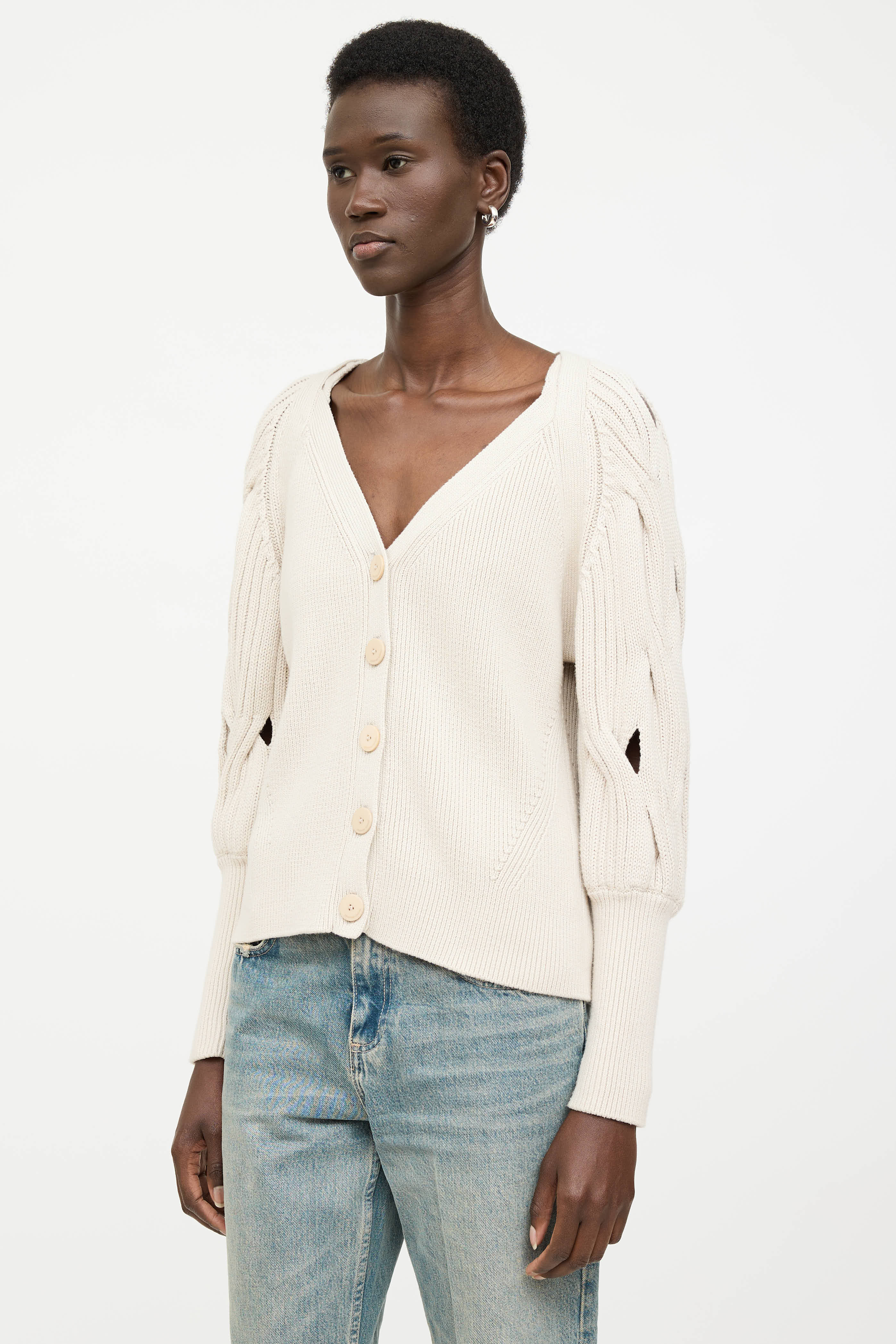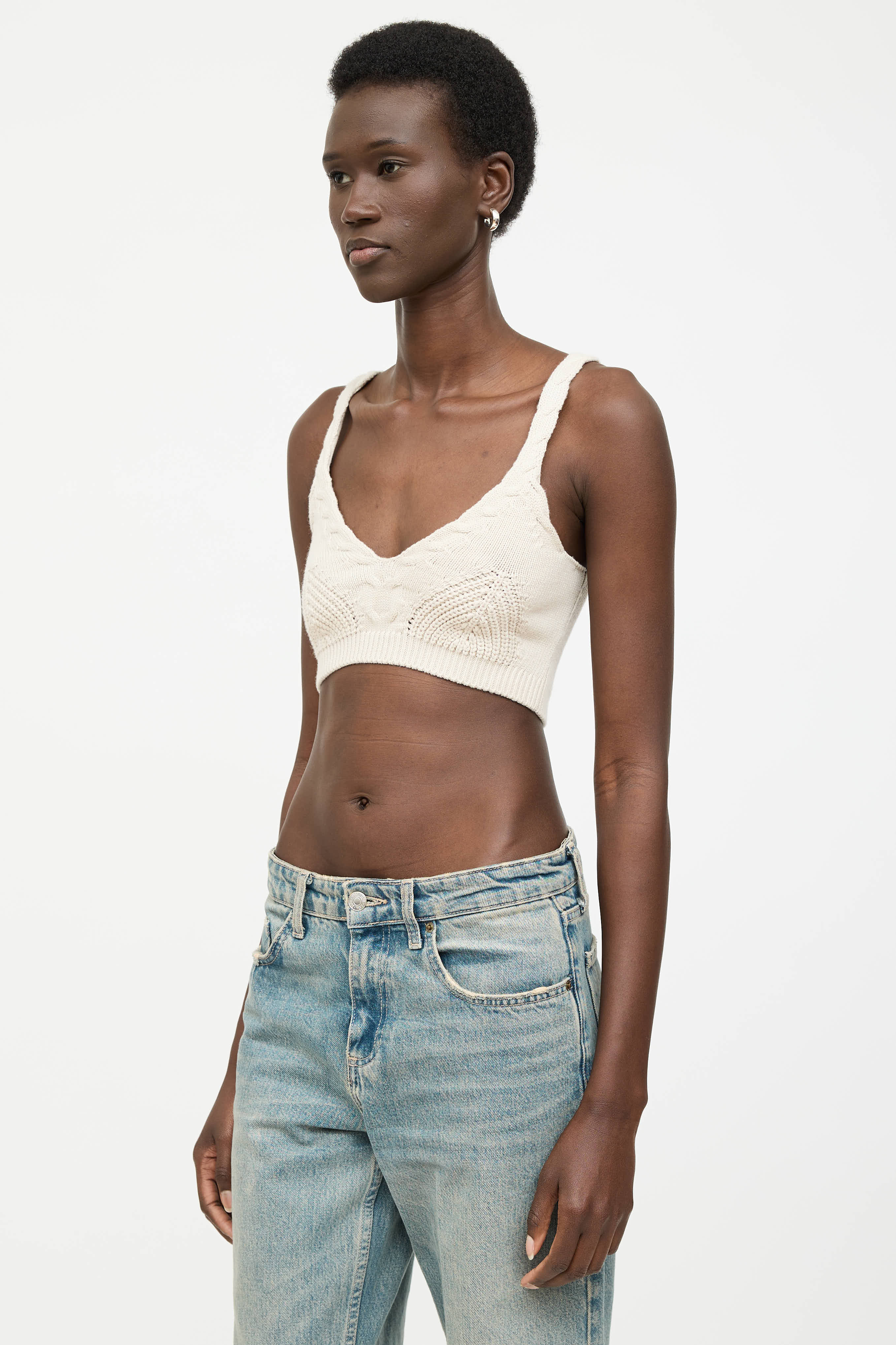 Pre-owned Simkhai beige knit sweater featuring a V-neckline, long cable knit sleeves with extended cuffs, ribbed hem, and button up closure. Matching bralette features a V-neckline, cableknit detailing, and ribbed hem.