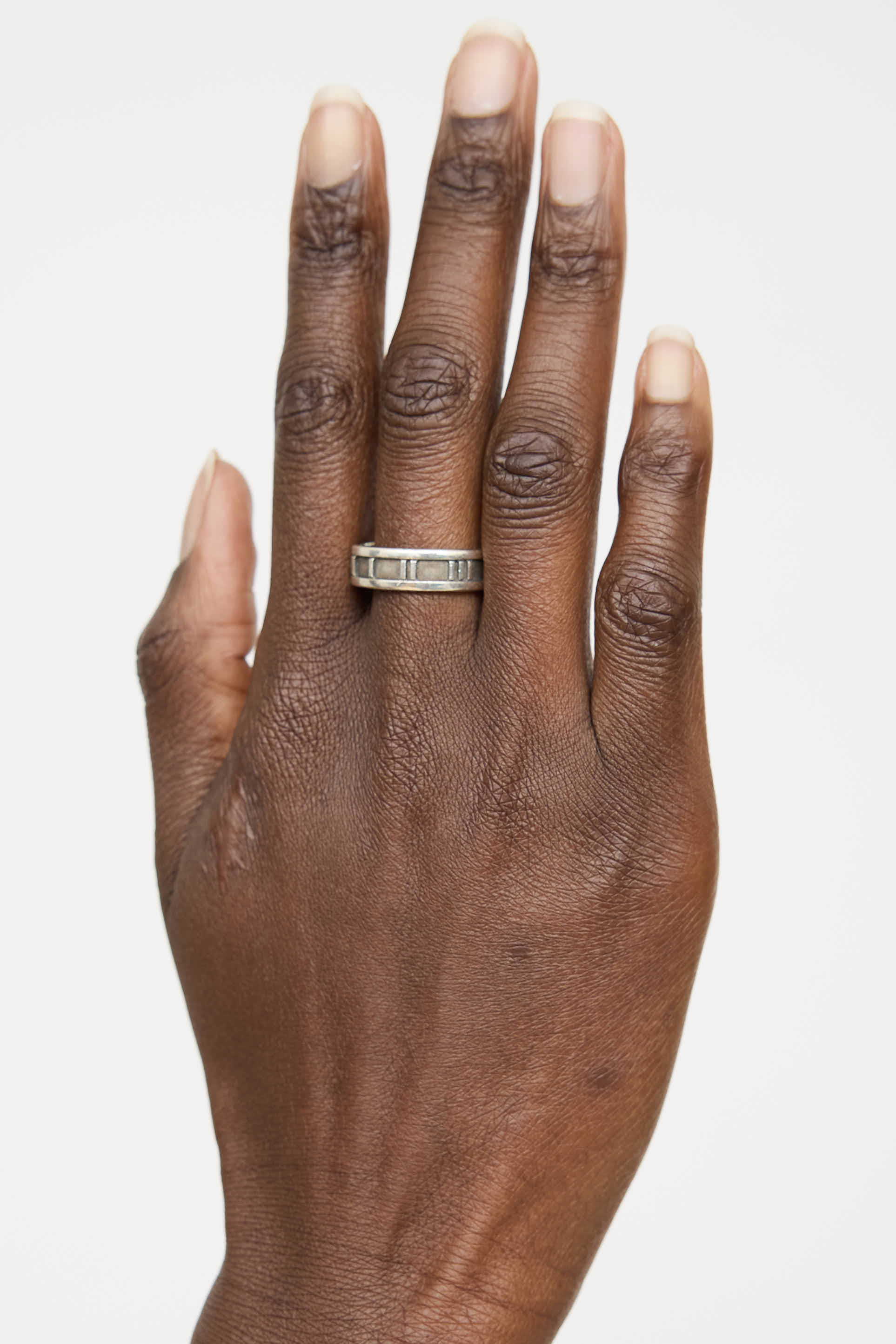 Pre-owned Tiffany & Co. sterling silver Atlas 1995 Groove ring featuring a double striped band, embossed roman numerals at face, and "925" stamping at interior.