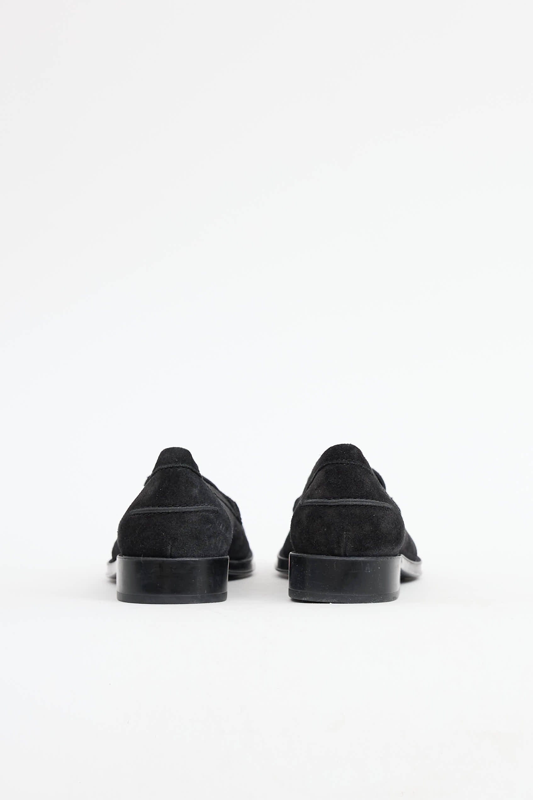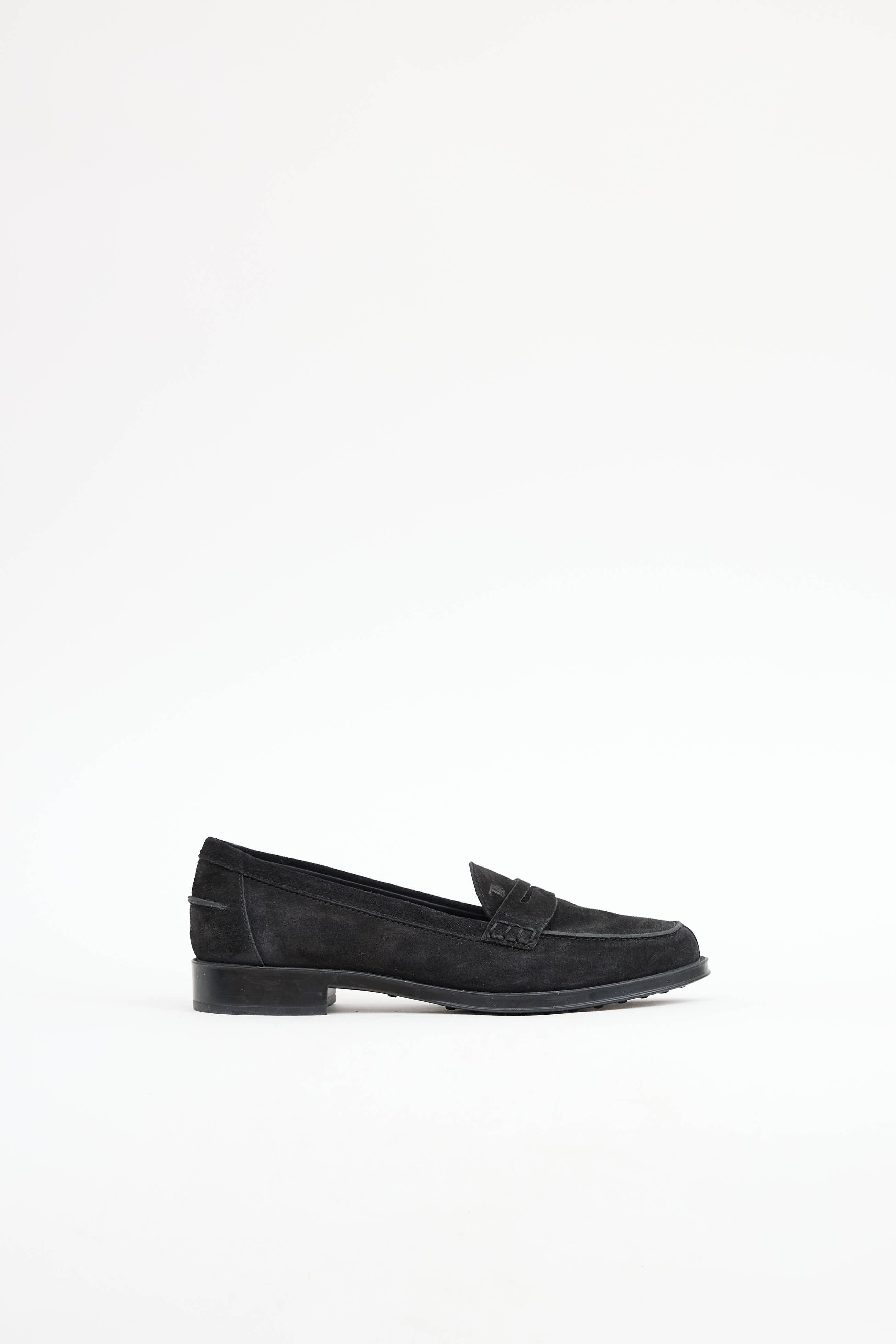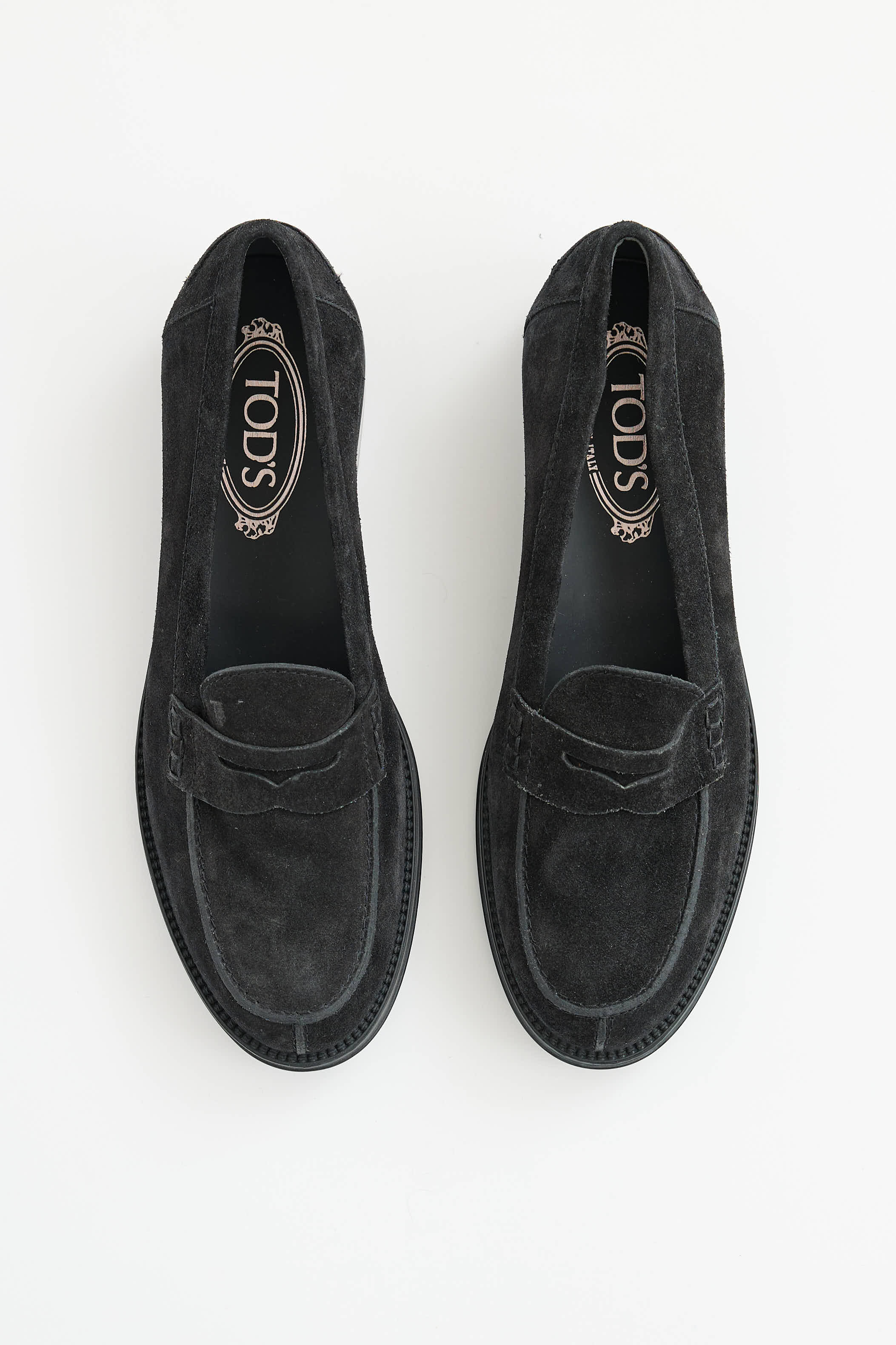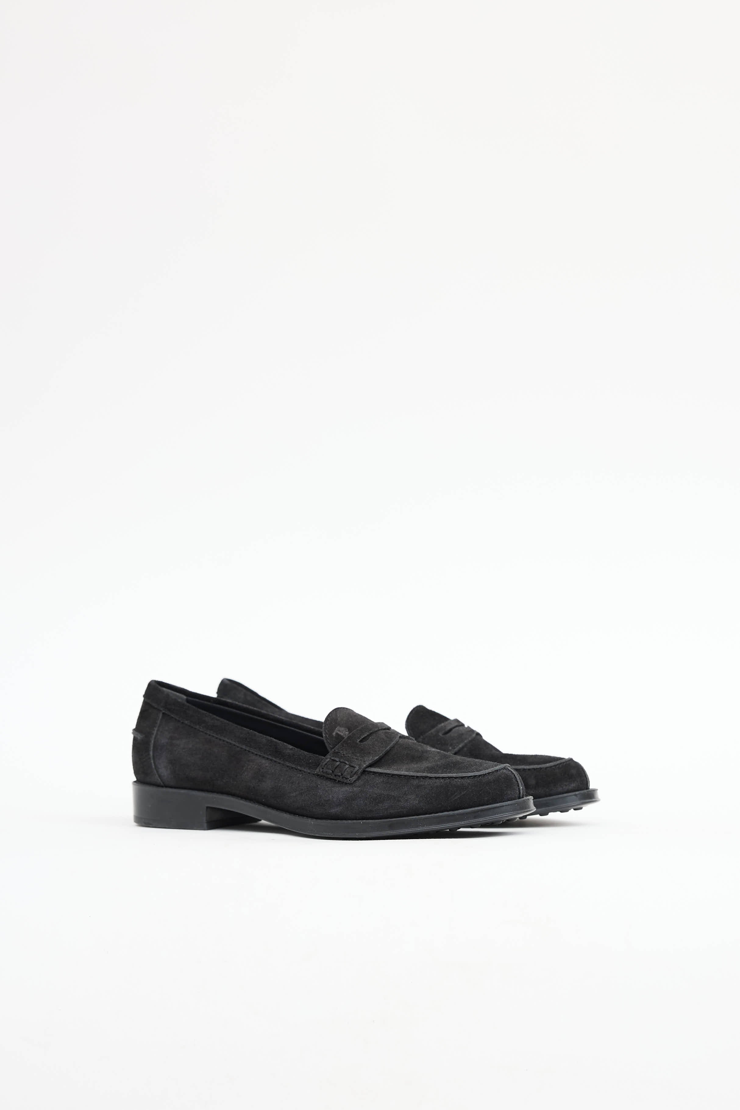 Pre-owned Tod's black loafers featuring a rounded toe, suede upper, slip on entry and penny bar strap at vamp.