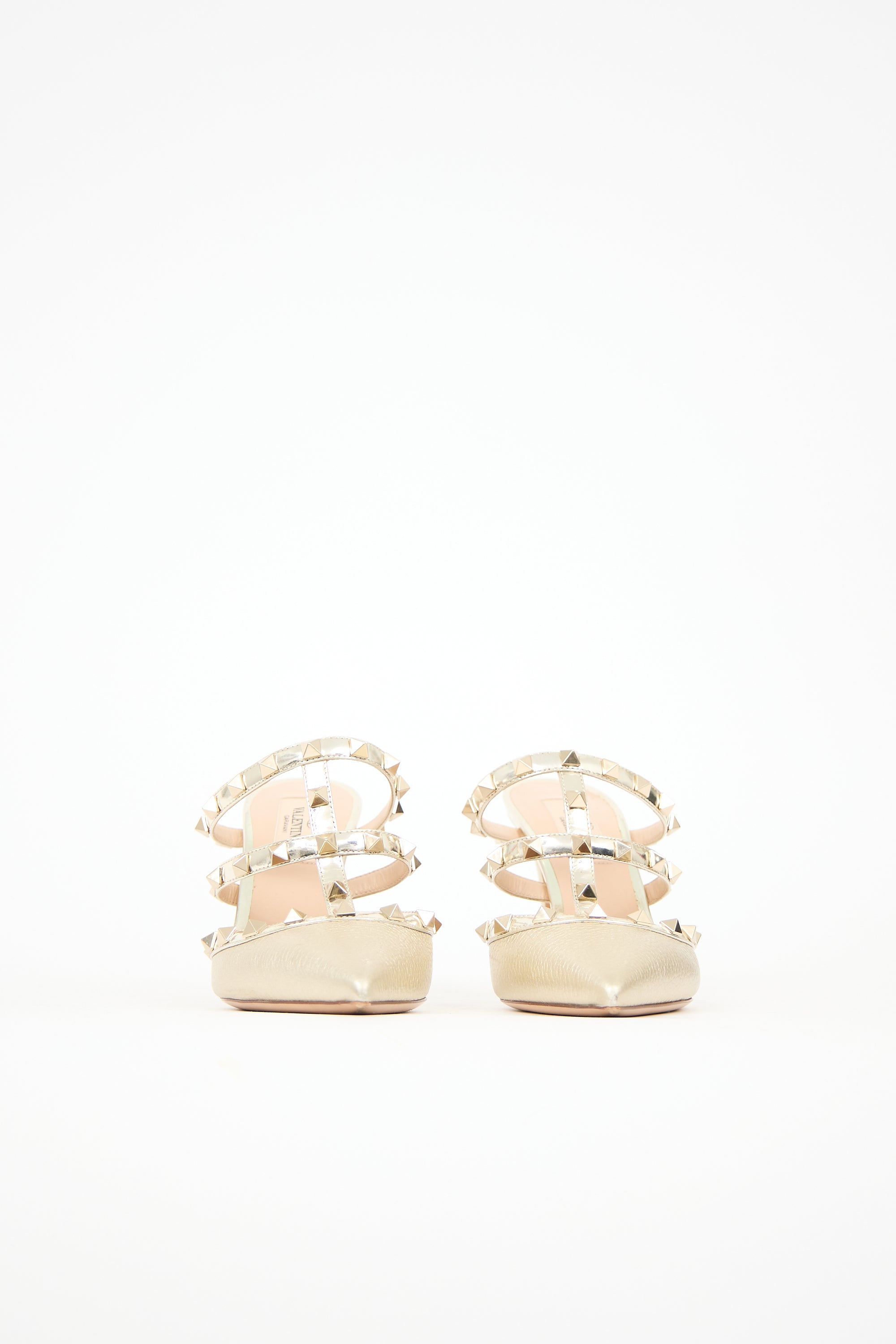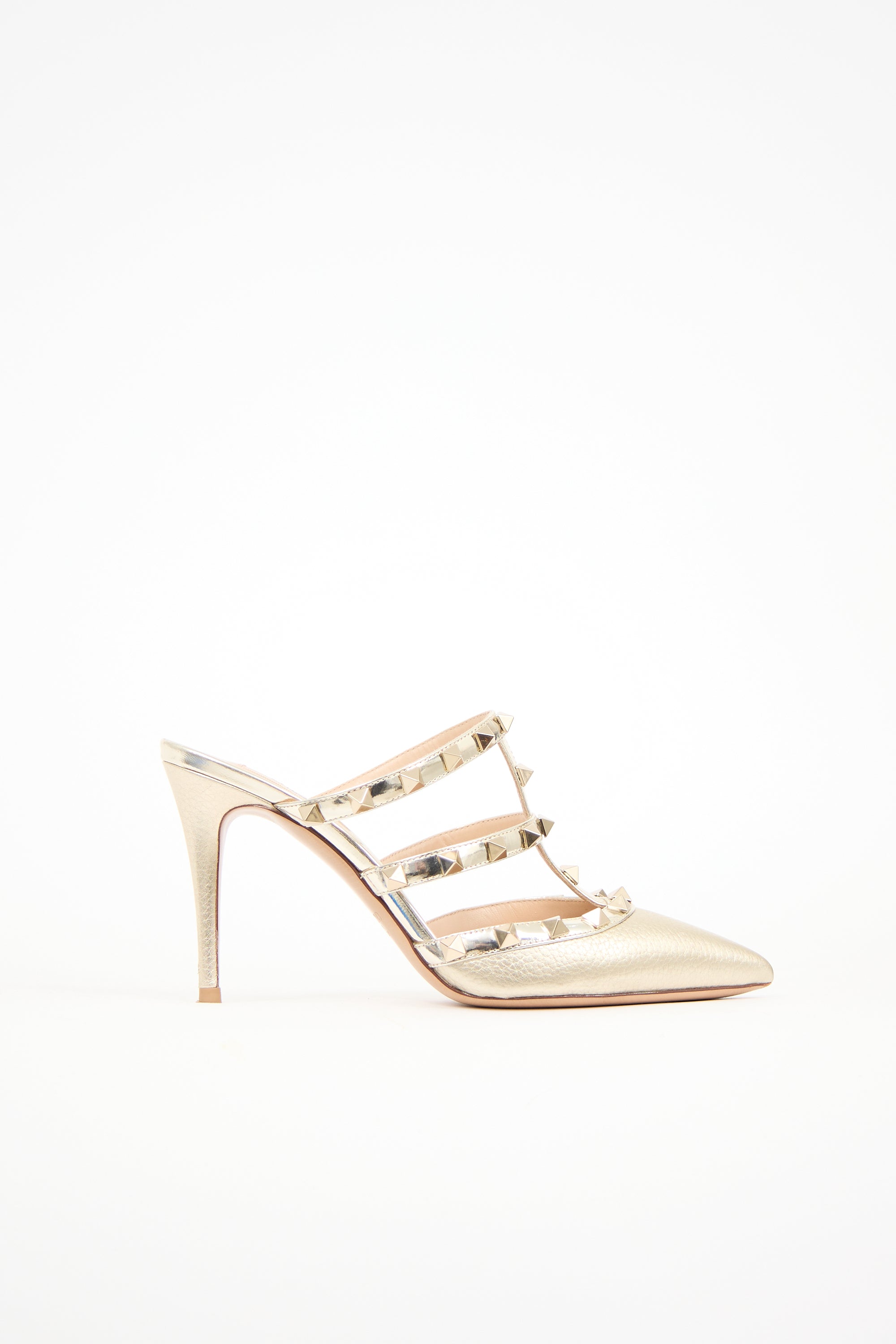 Pre-owned Valentino gold tone leather mules featuring pointed toe, metallic leather instep cage with tonal Rockstud trim, and covered stiletto heel.