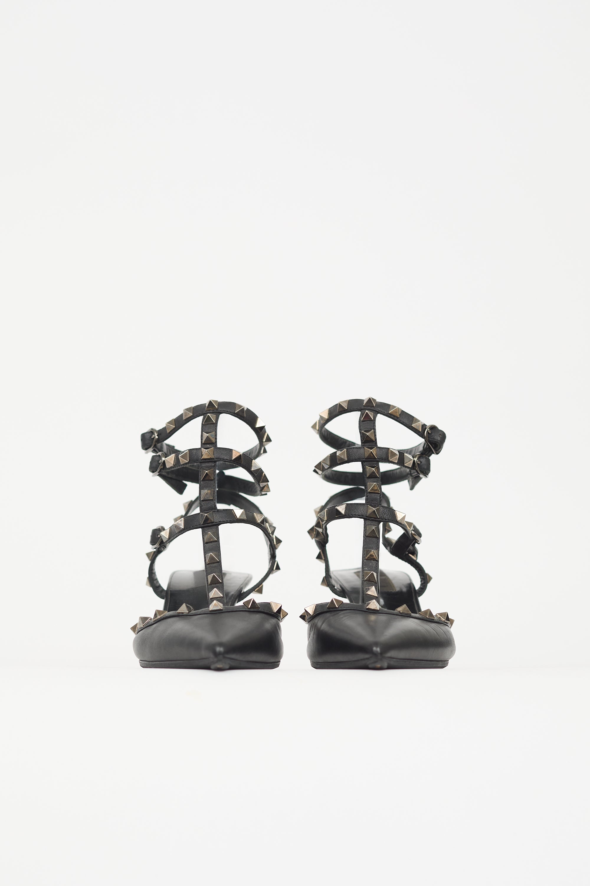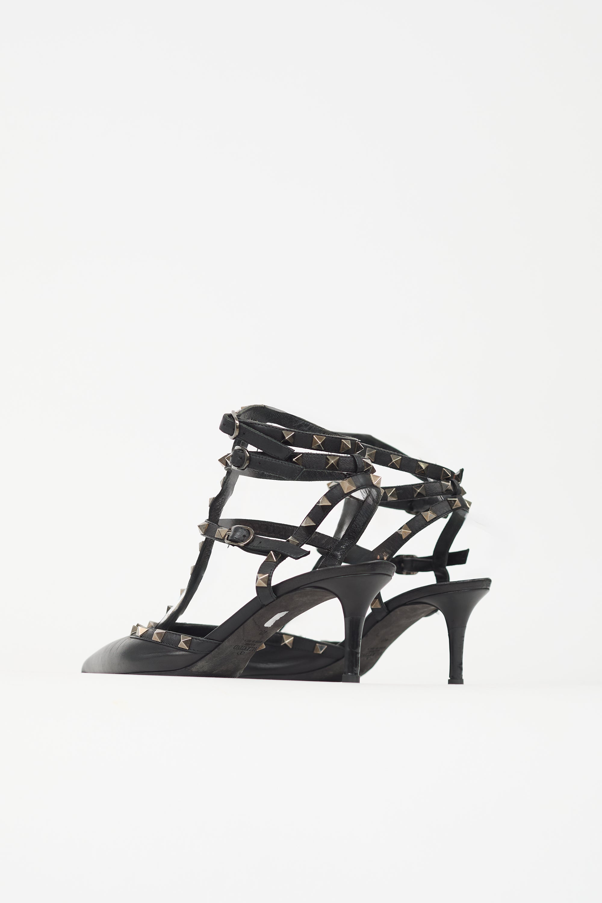 Pre-owned Valentino black leather pumps featuring a pointed toe, gunmetal tone Rockstuds throughout, strappy uppers with three adjustable straps, and a covered stiletto heel.