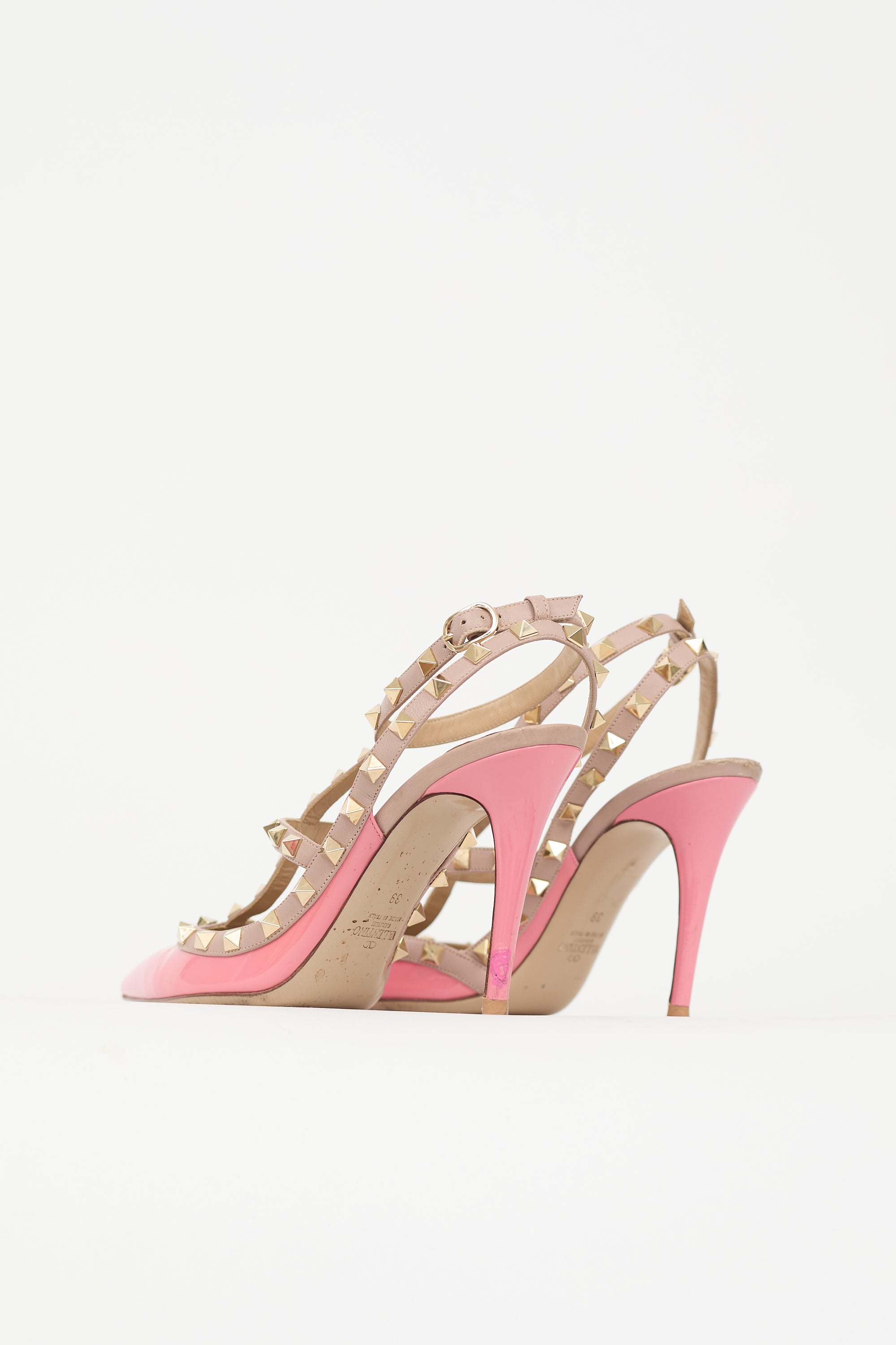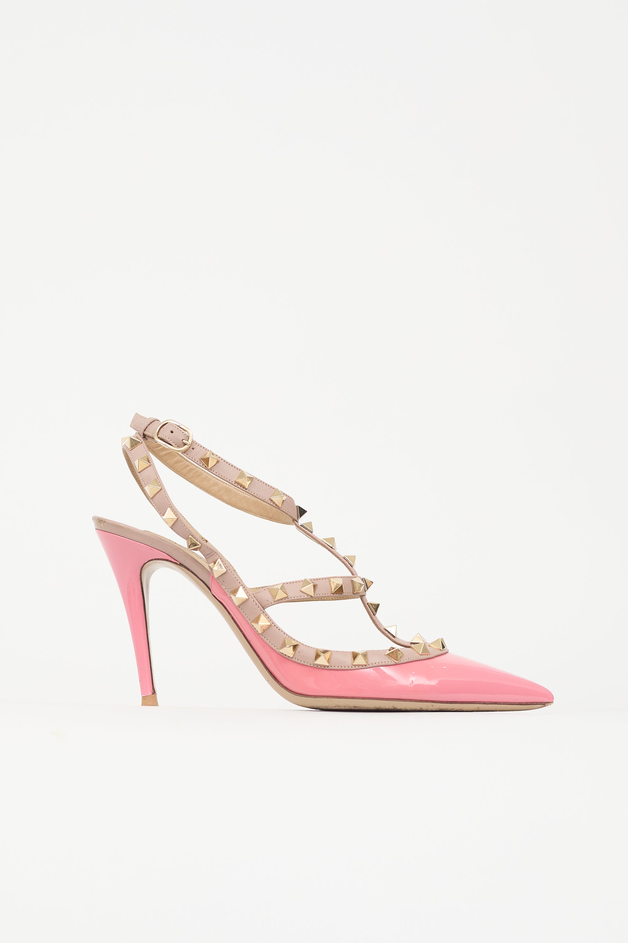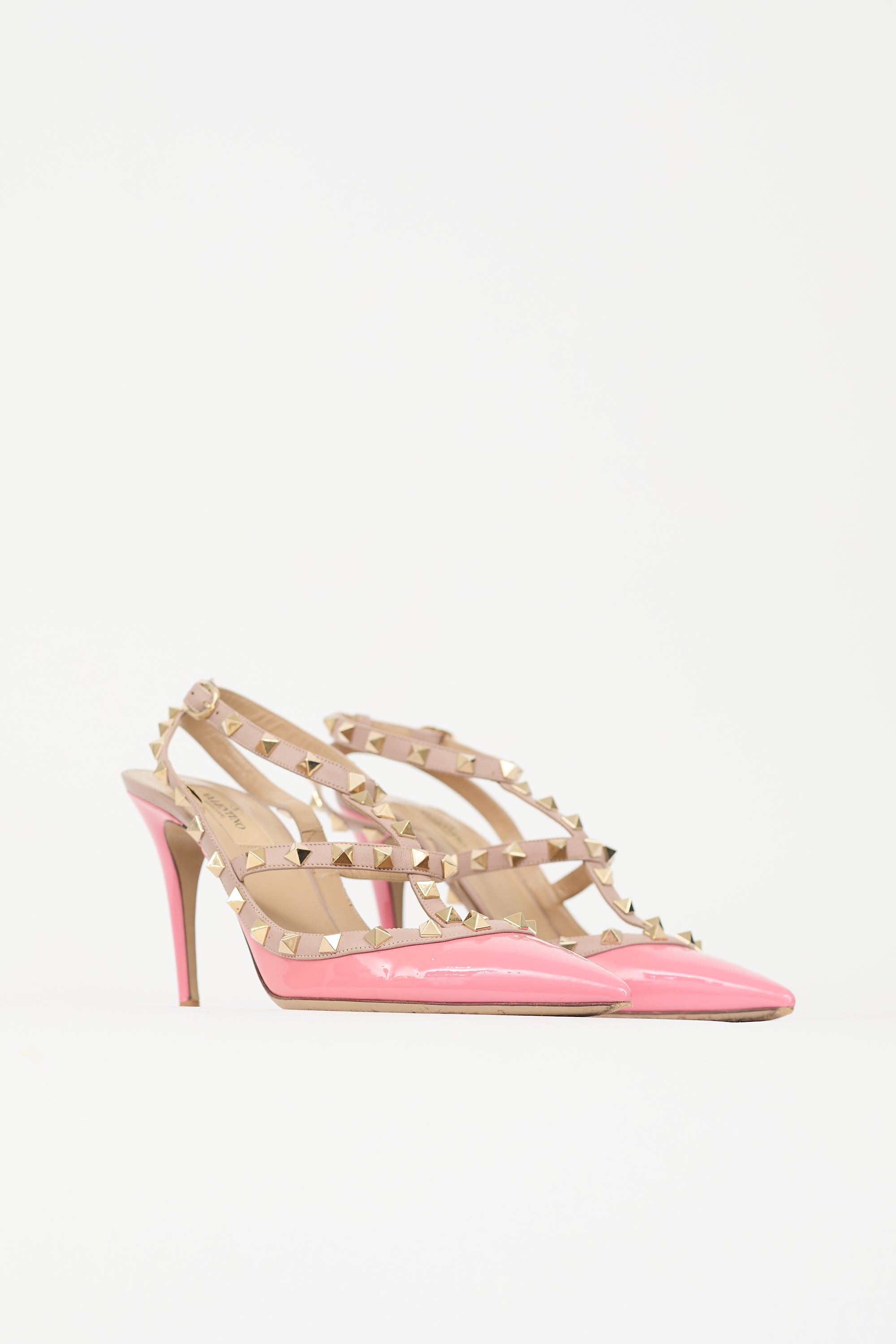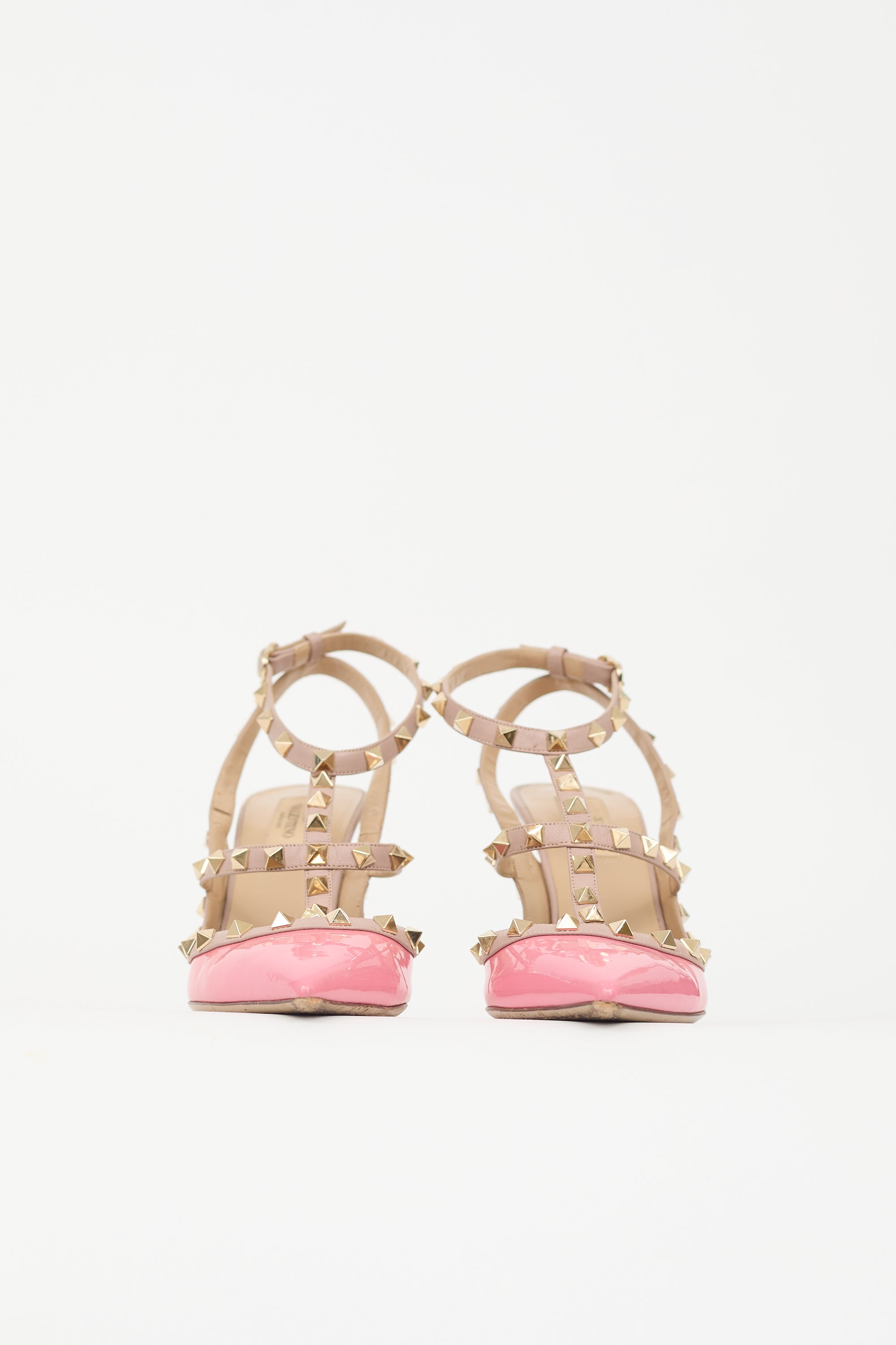 Pre-owned Valentino pink patent leather pumps featuring a pointed toe, purple soft leather strappy uppers with gold tone Rockstuds, adjustable ankle strap, and a covered stiletto heel.