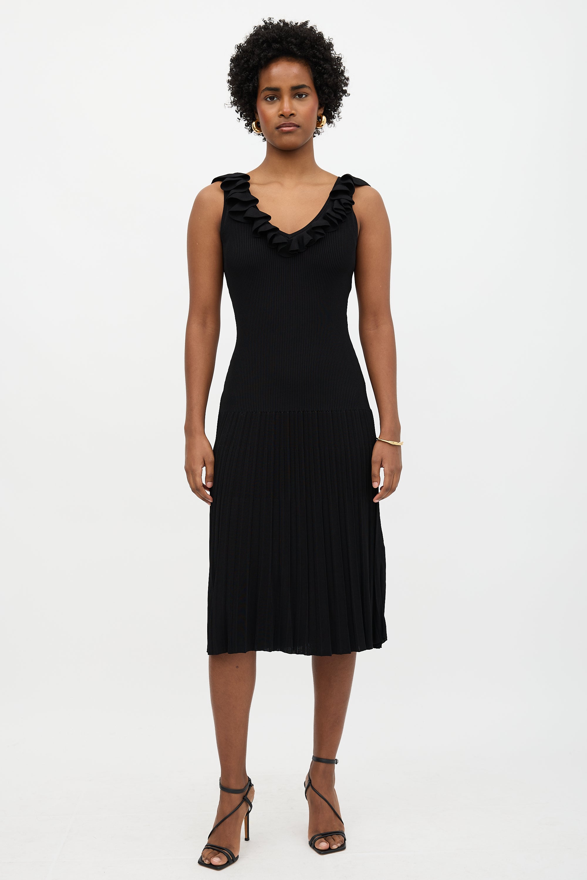 Pre-owned Zimmermann black midi dress featuring ruffled V-neckline, ribbed knit, and drop waist.
