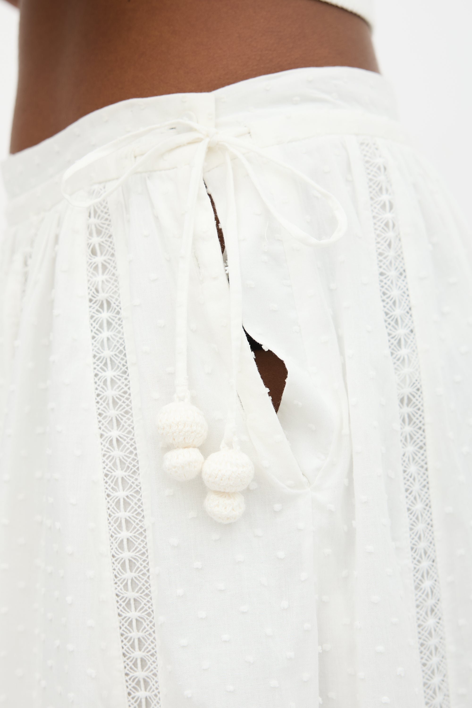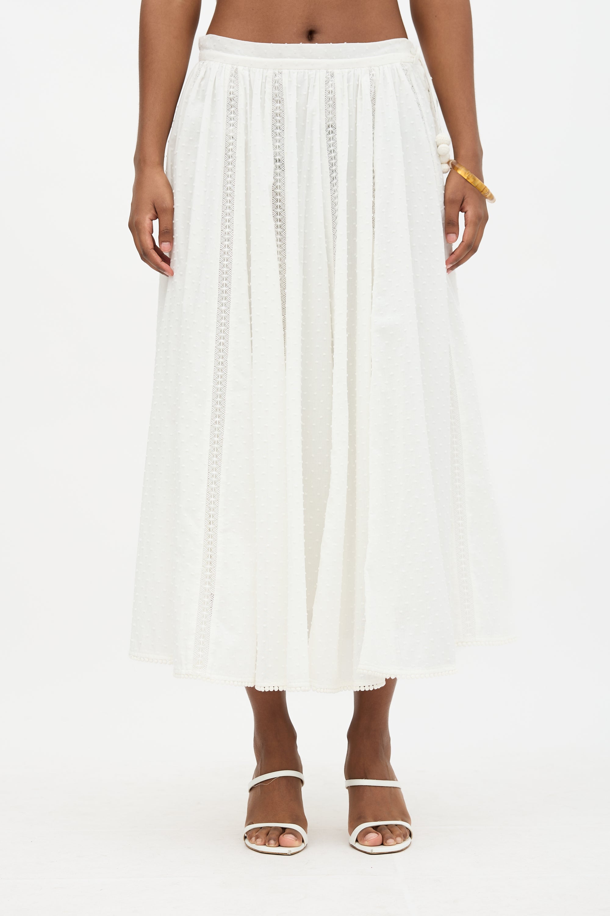 Pre-owned Zimmermann white Suraya midi skirt featuring Swiss dots, lace stripes, hook and eye side closure, and tie with crochet ball detail. Lined.