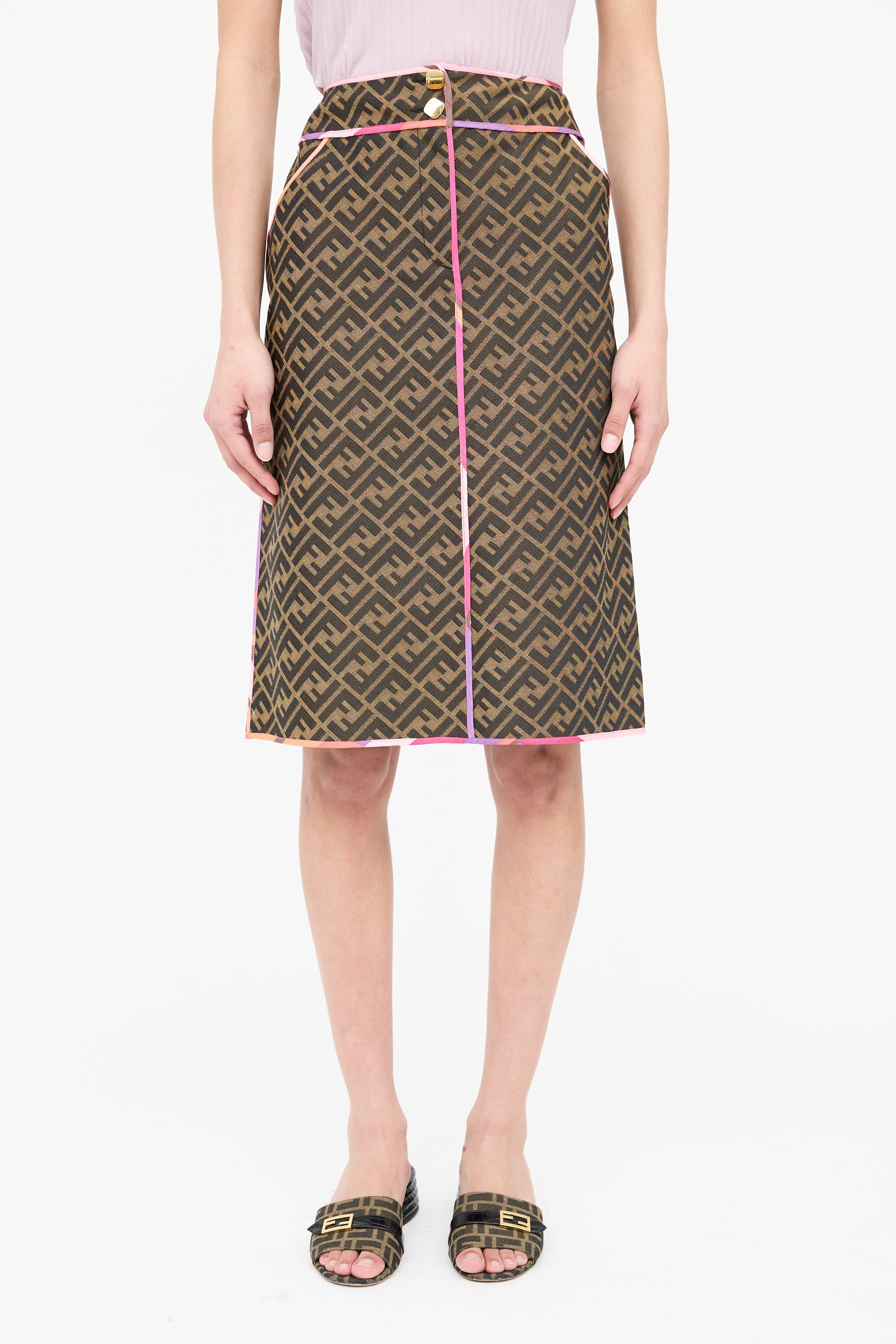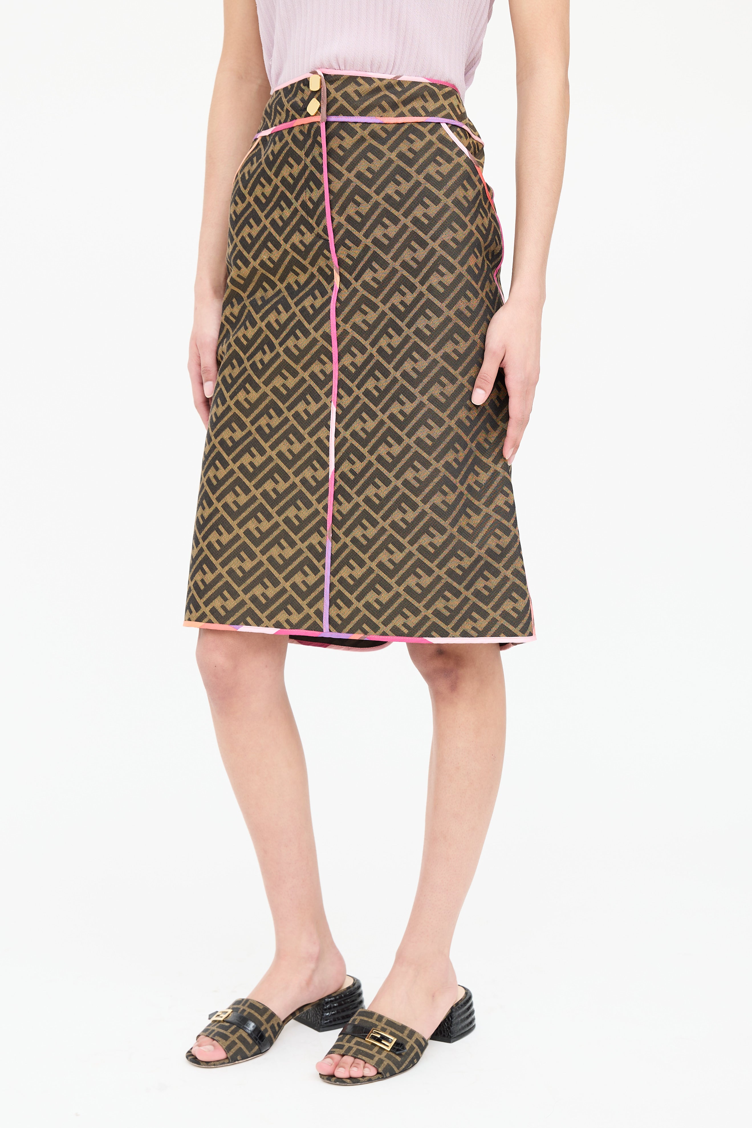 Pre-owned Fendi 2000 brown midi skirt featuring a woven Zucca monogram pattern throughout, pink piped trim, two slip pockets at hip, slit at hem, and zip fly with gold tone button closure. Karl Lagerfeld era design.