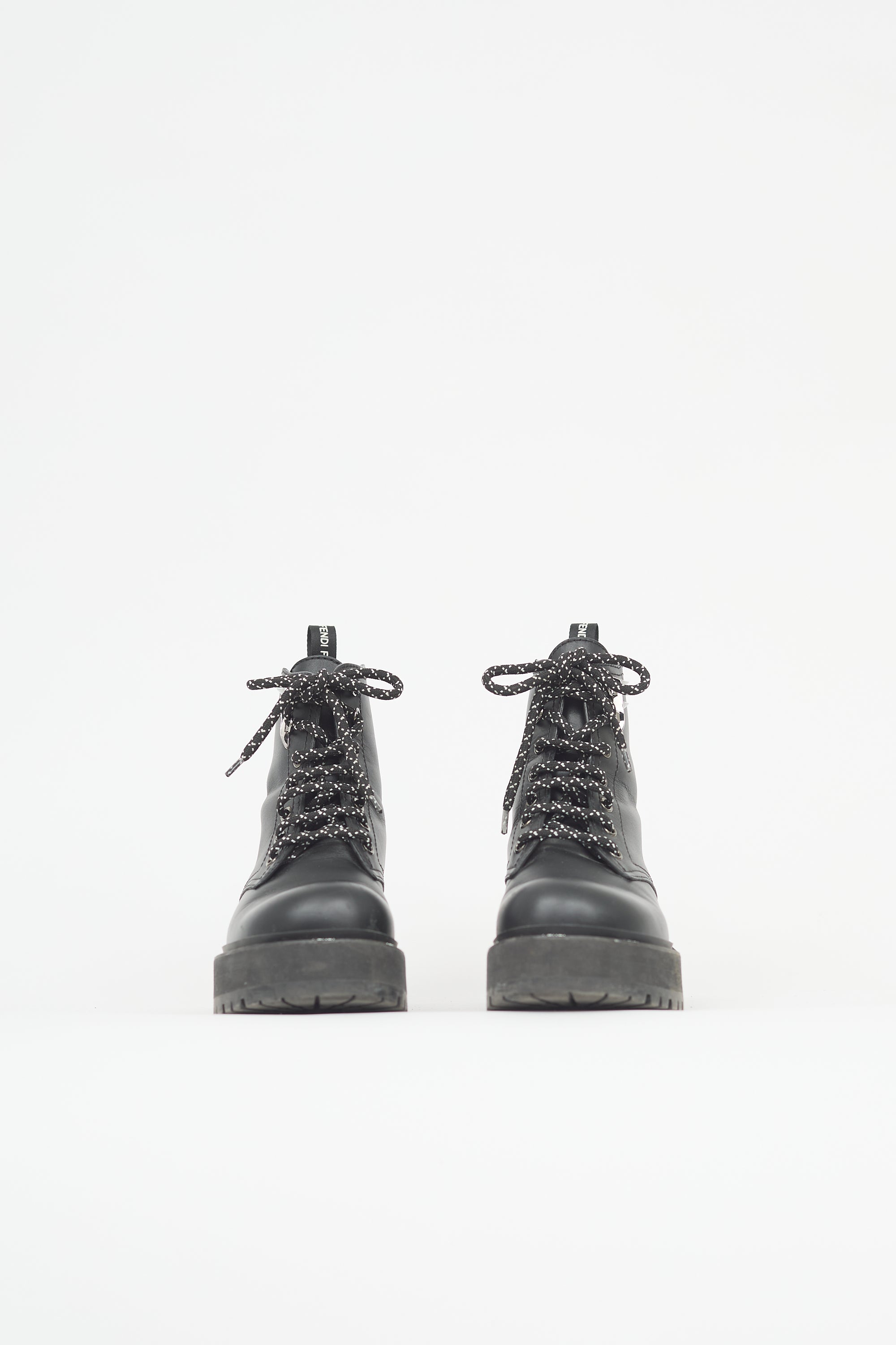 Pre-owned Fendi black leather FFreedom biker boots featuring rounded toe, lace up front, logo pull tab at counter, and treaded rubber platform and block heel with logo trim. Comes with original dust bag.