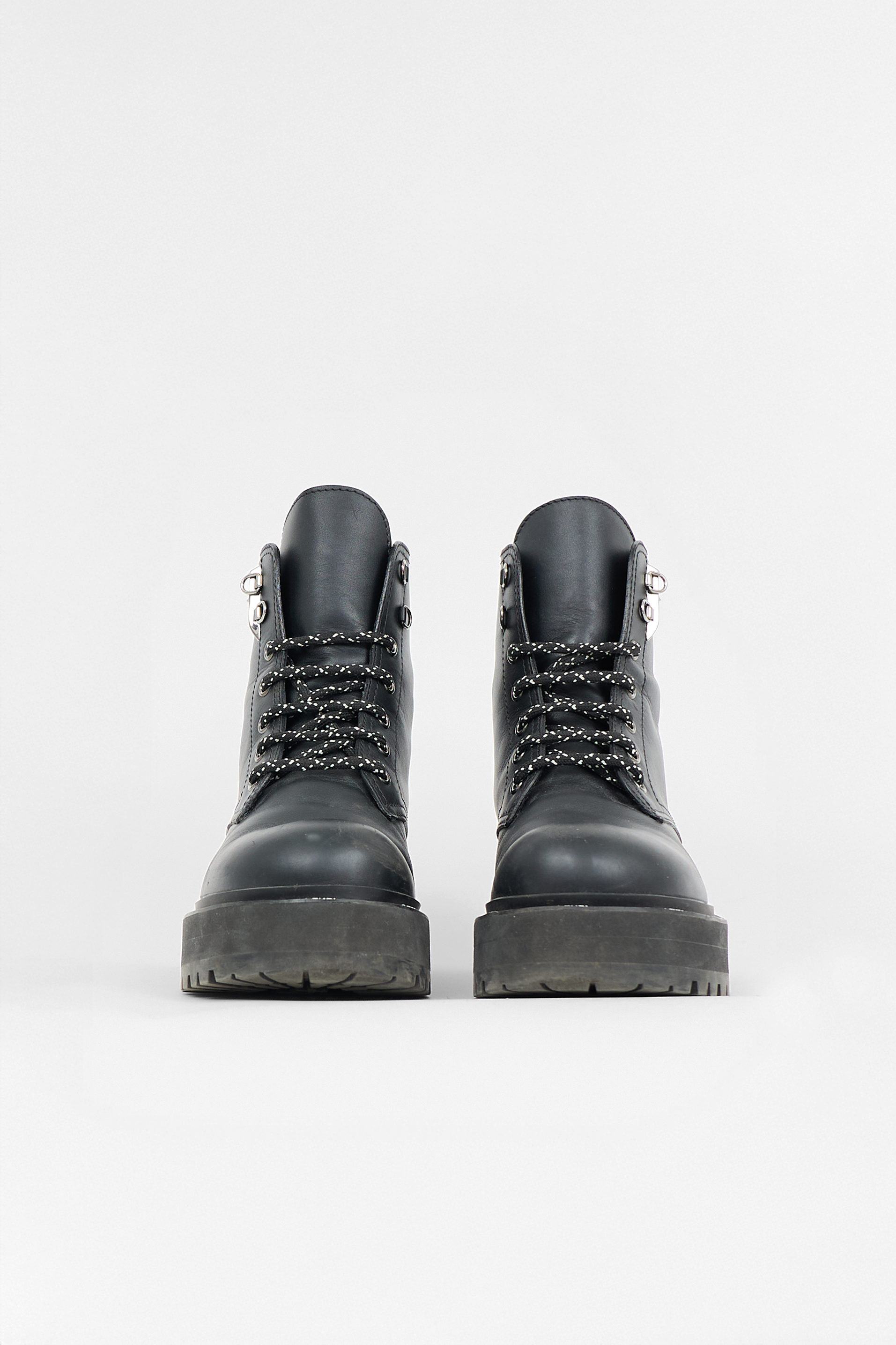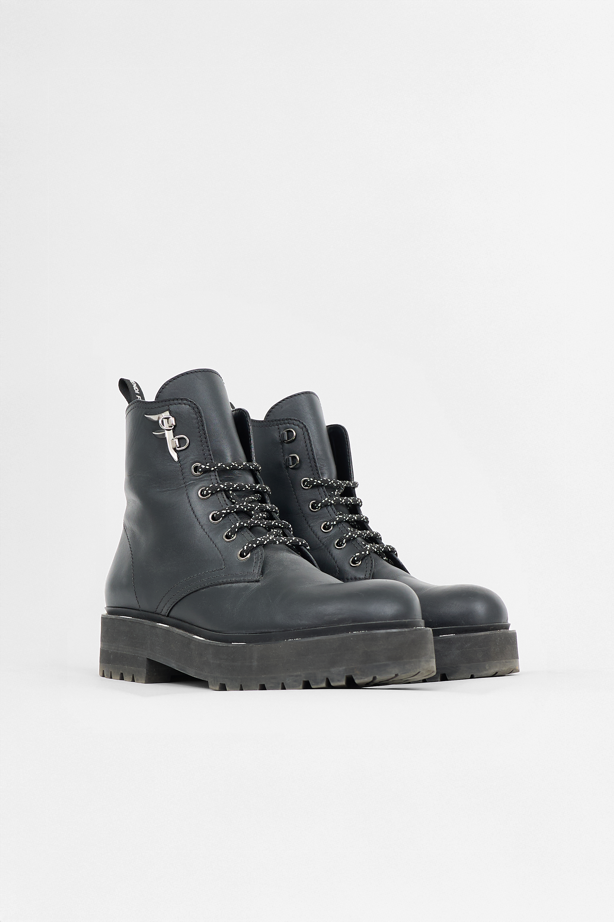 Pre-owned Fendi black leather Freedom Biker boots featuring a rounded toe, lace up front, gunmetal F logo hardware at eyestay, logo pull tab at counter, and treaded rubber sole with logo trim.