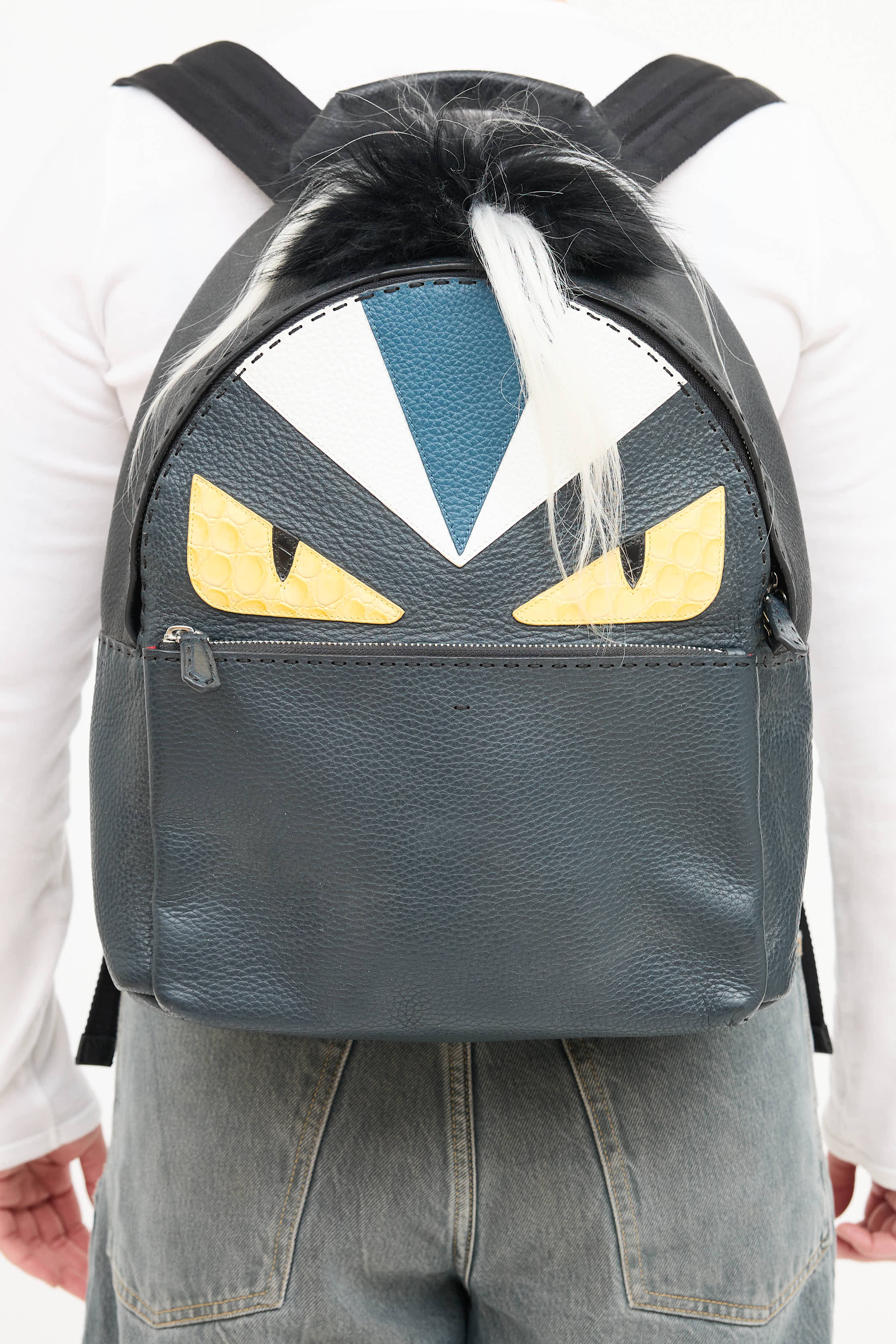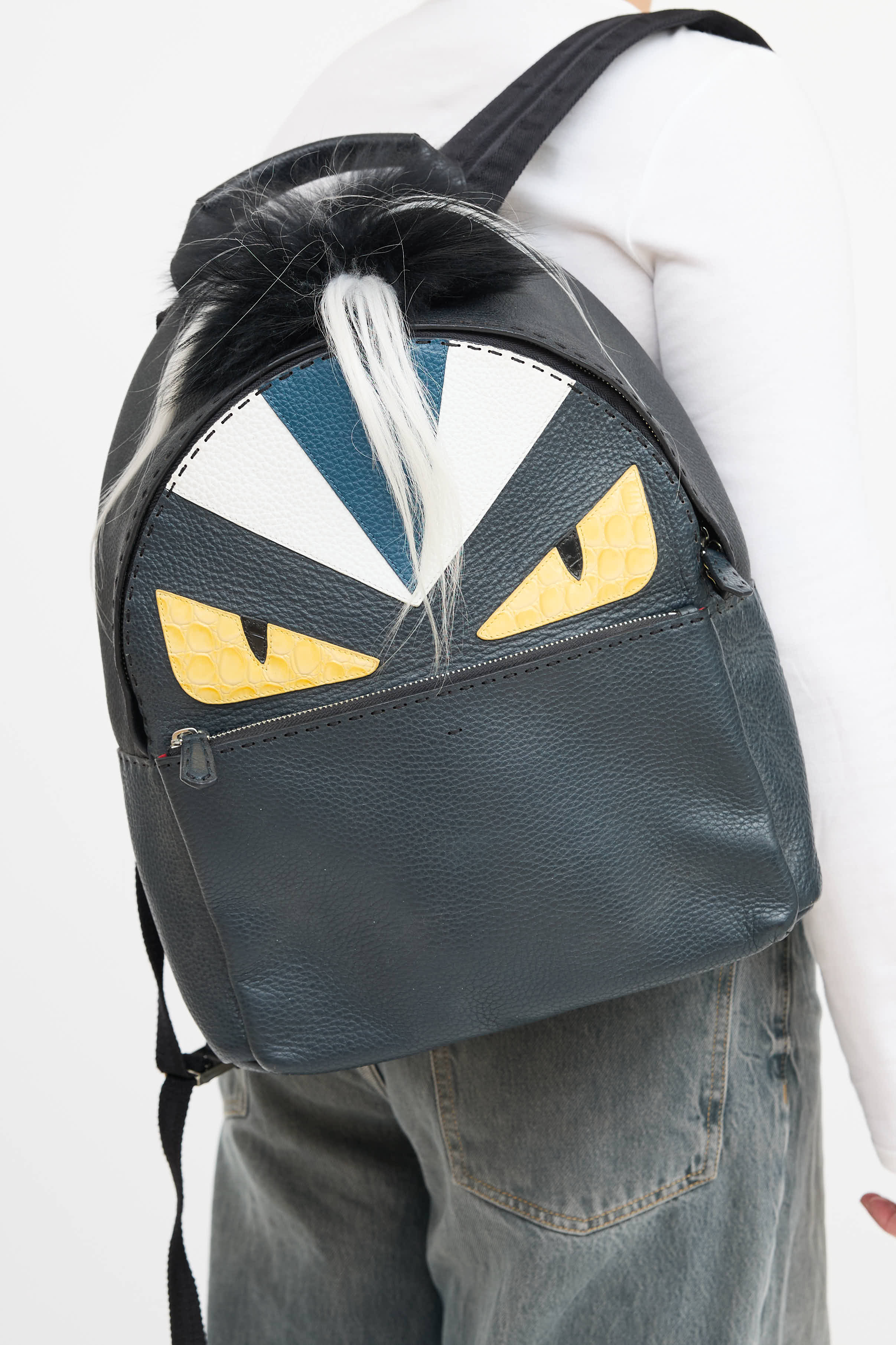 Pre-owned Fendi black leather Selleria Monster backpack featuring flat top handle, webbed adjustable backpack straps, fur top, zip pocket at front, top zip, and one main compartment with one zip pocket.