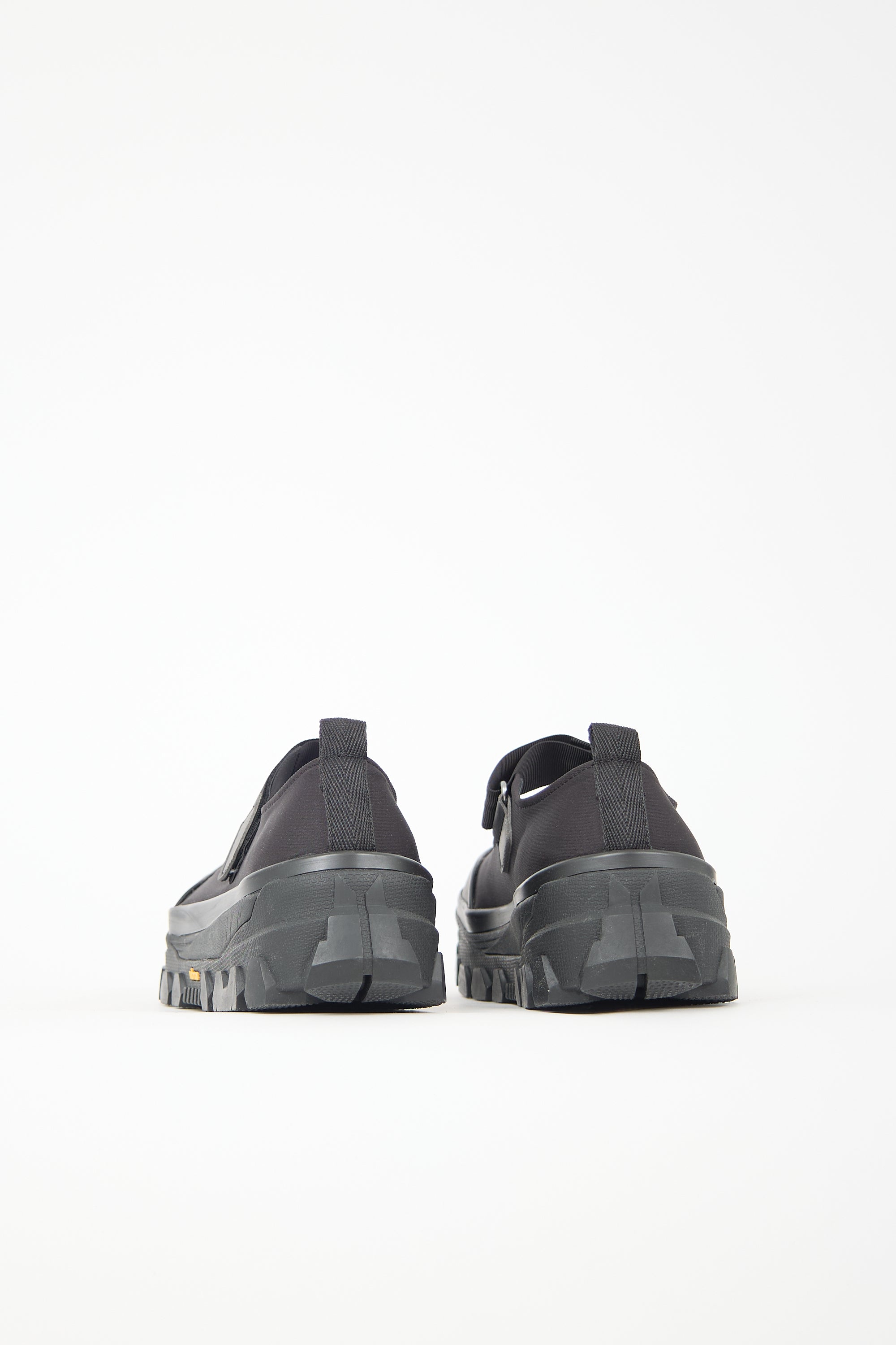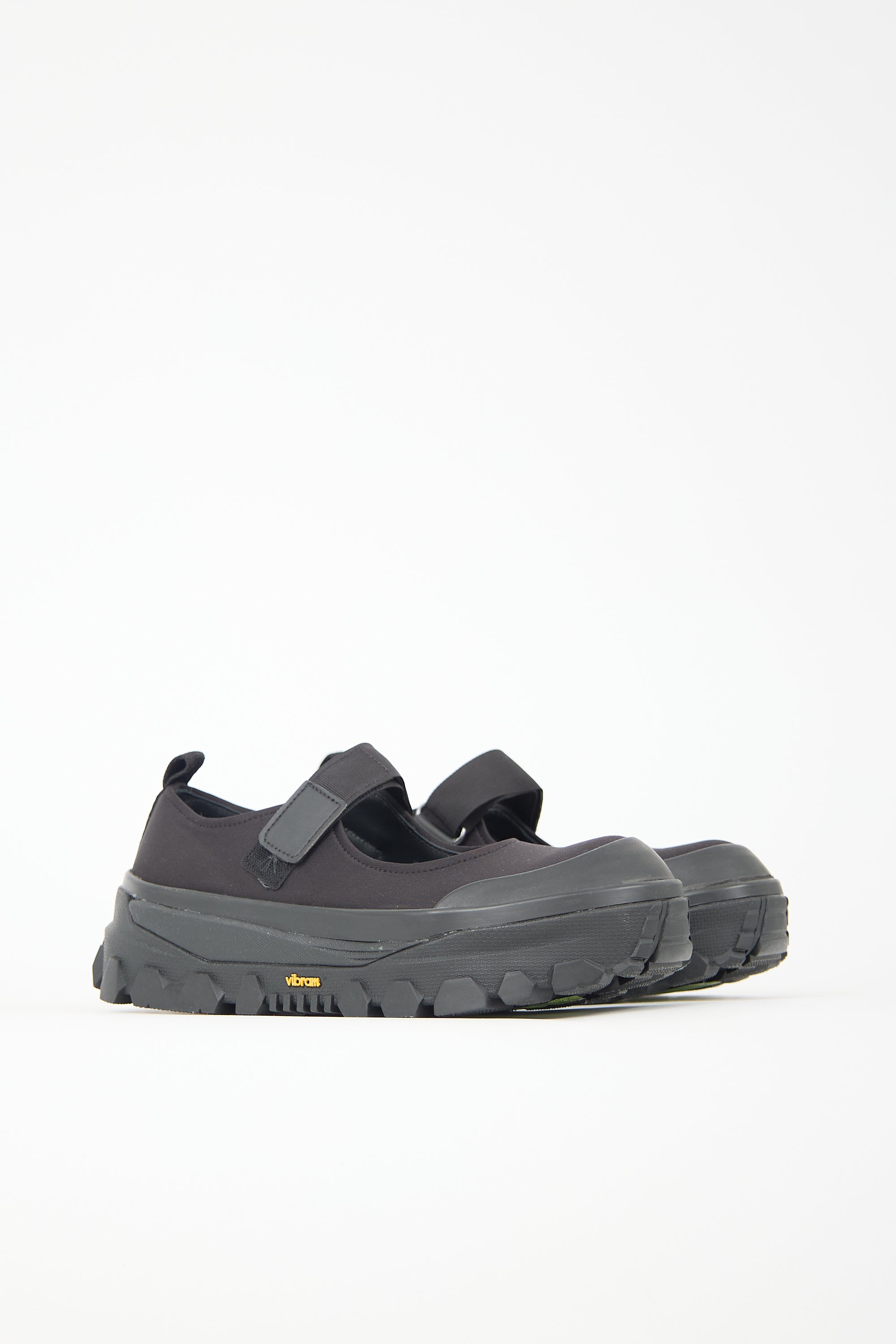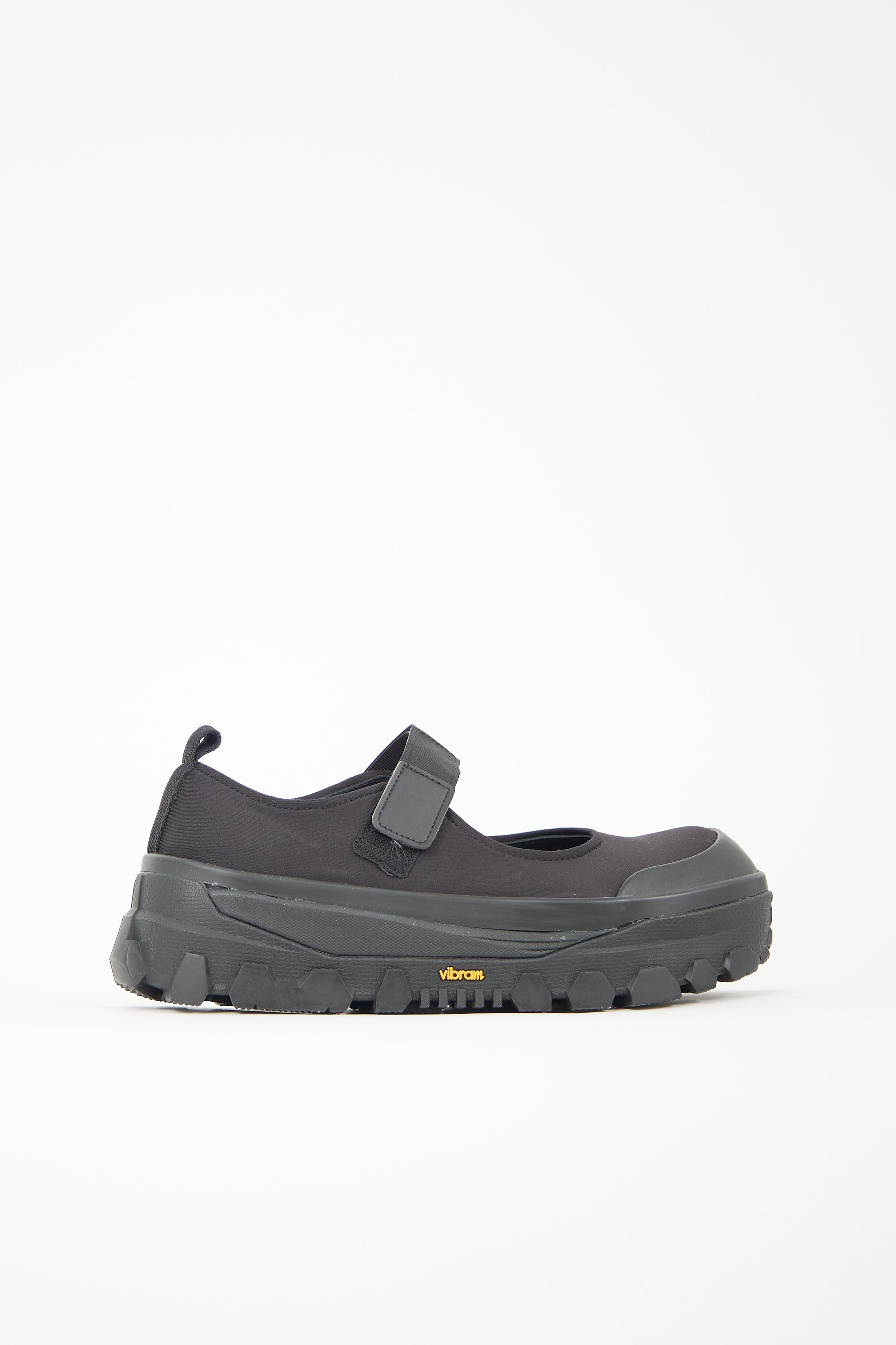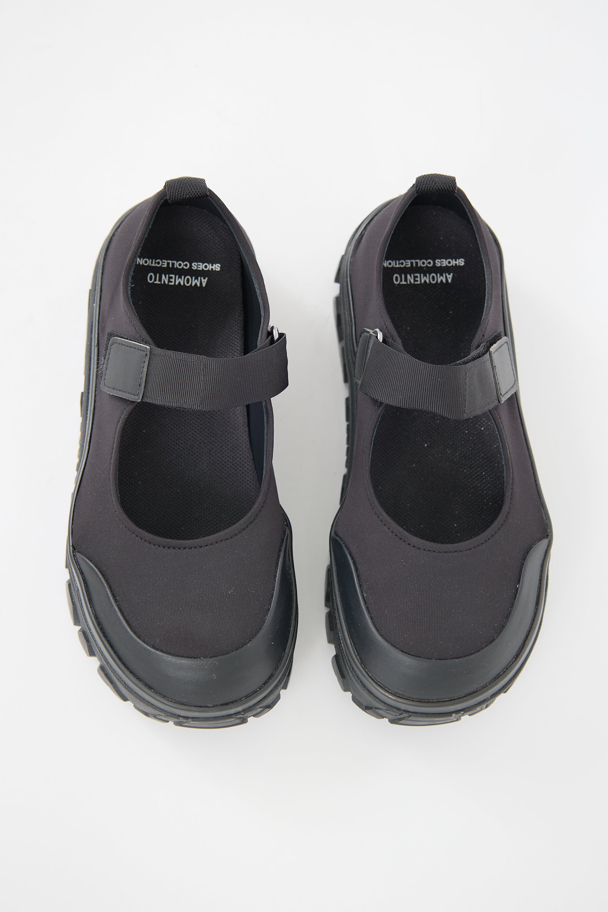 Pre-owned Amomento black neoprene Mary Jane flats featuring rounded toe, Velcro instep strap, pull tab at counter, and black Vibram treaded rubber sole. Comes with original dust bag.