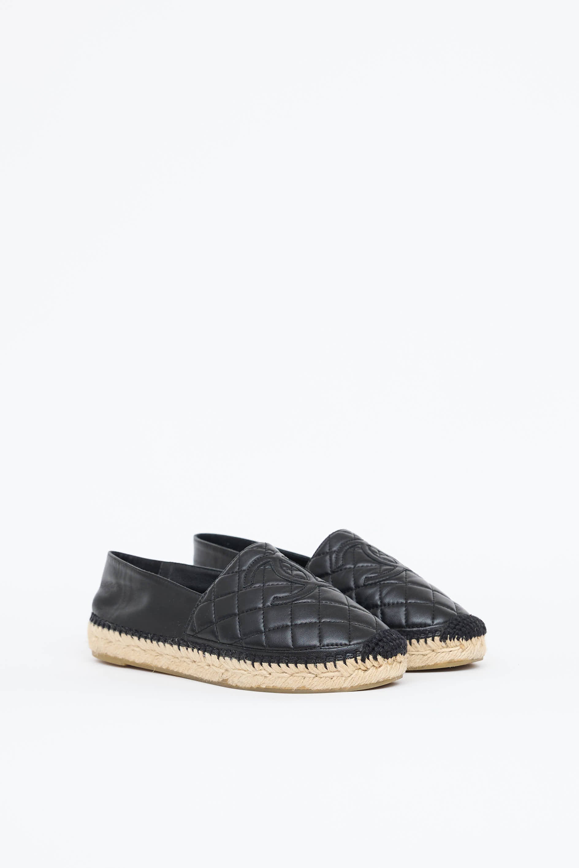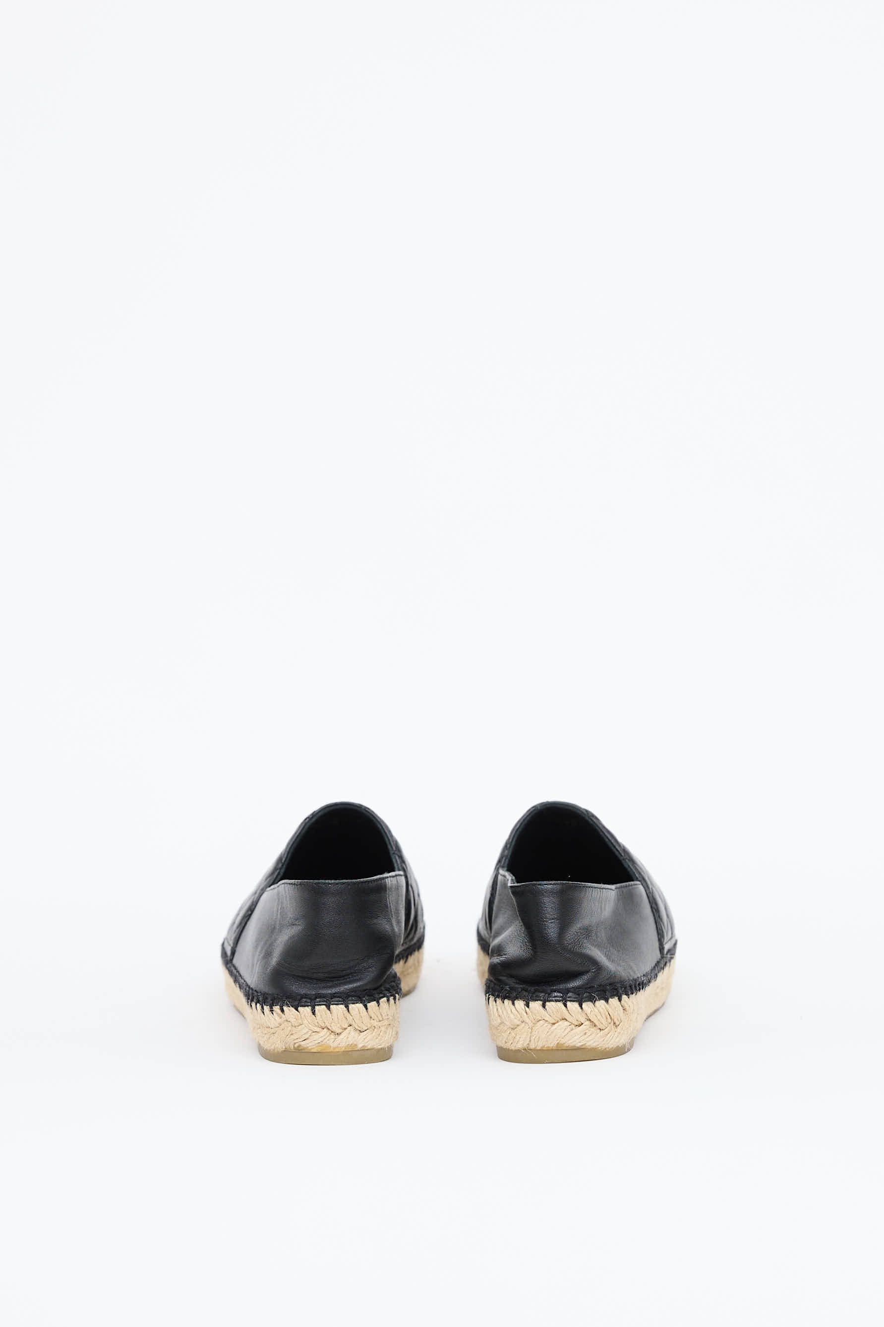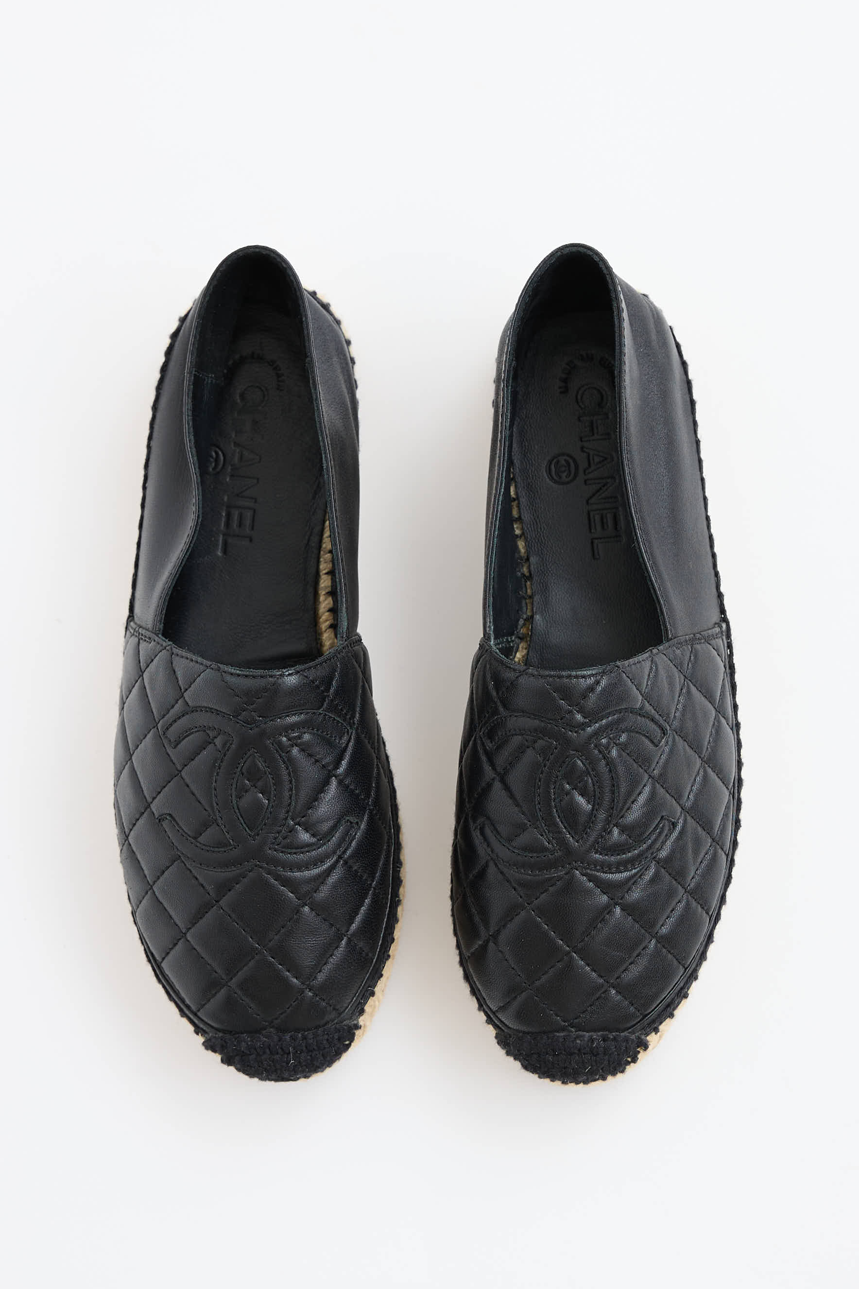 Pre-owned Chanel black leather espadrille featuring round toe, signature quilted leather upper with CC logo at front, and braided jute midsole.