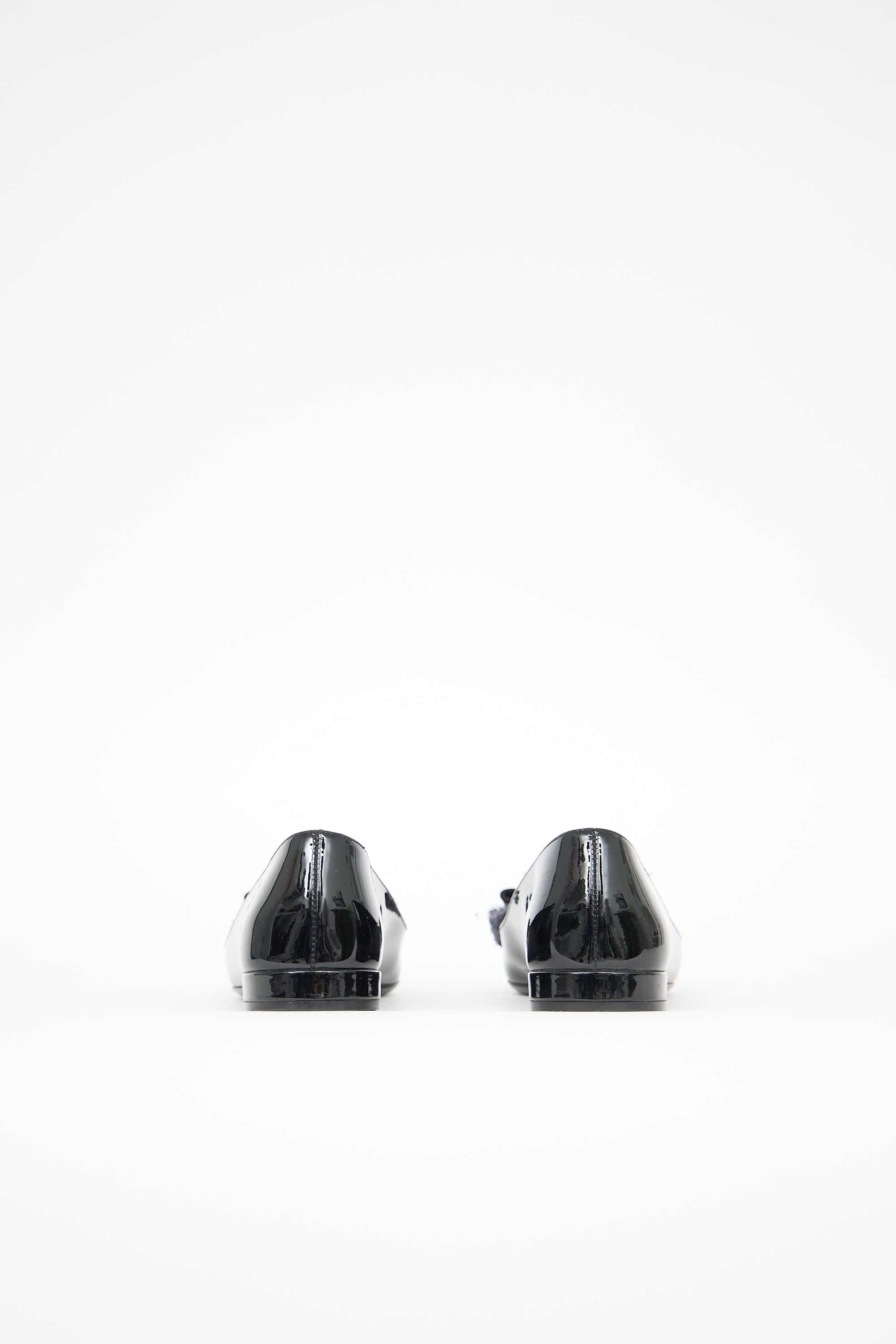 Pre-owned Ferragamo navy patent leather Marlia flats featuring rounded toe, frayed bow with etched logo plaque at vamp, and short covered heel. Comes with original dust bag.