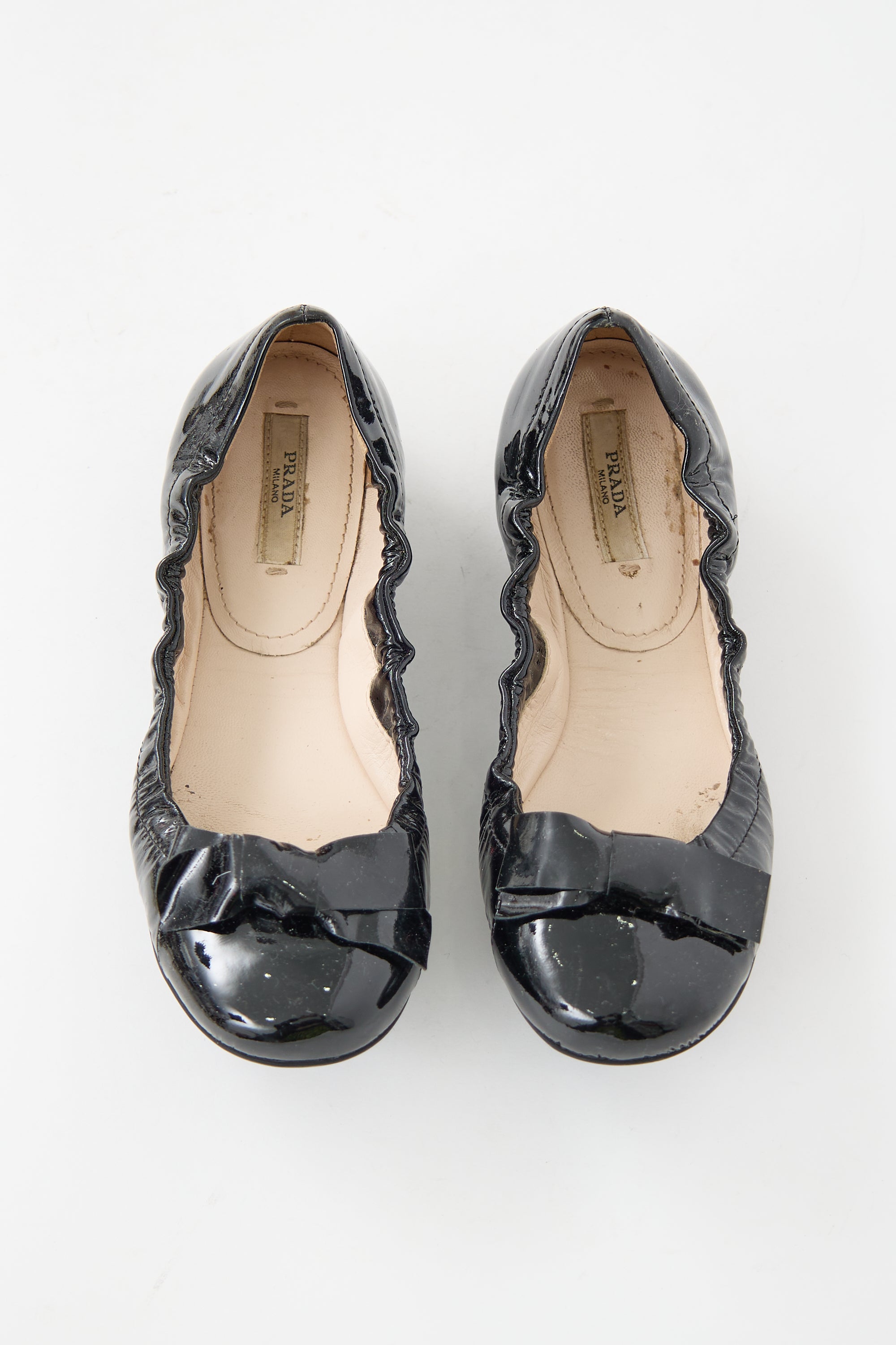 Pre-owned Prada black patent leather ballet flats featuring rounded toe, elasticized topline, and bow at vamp.