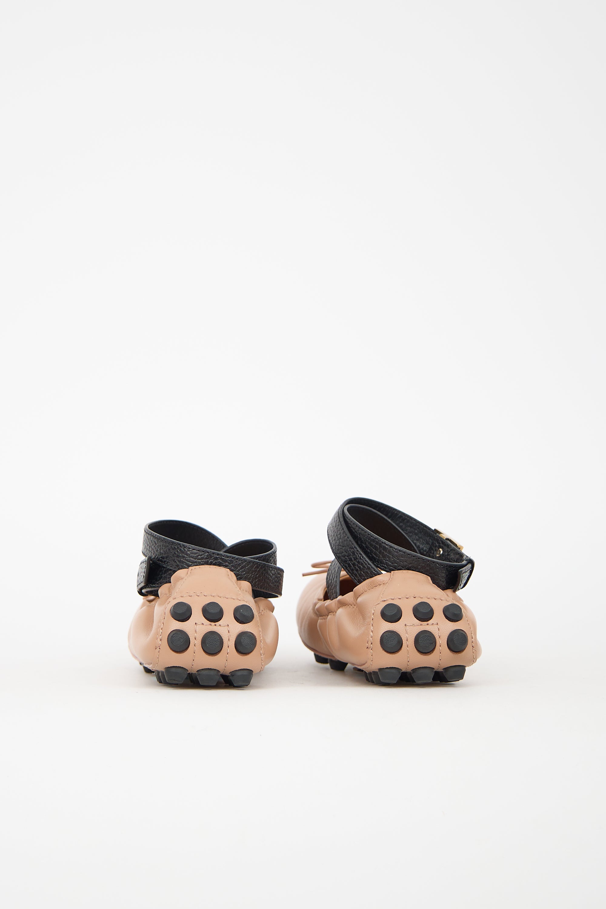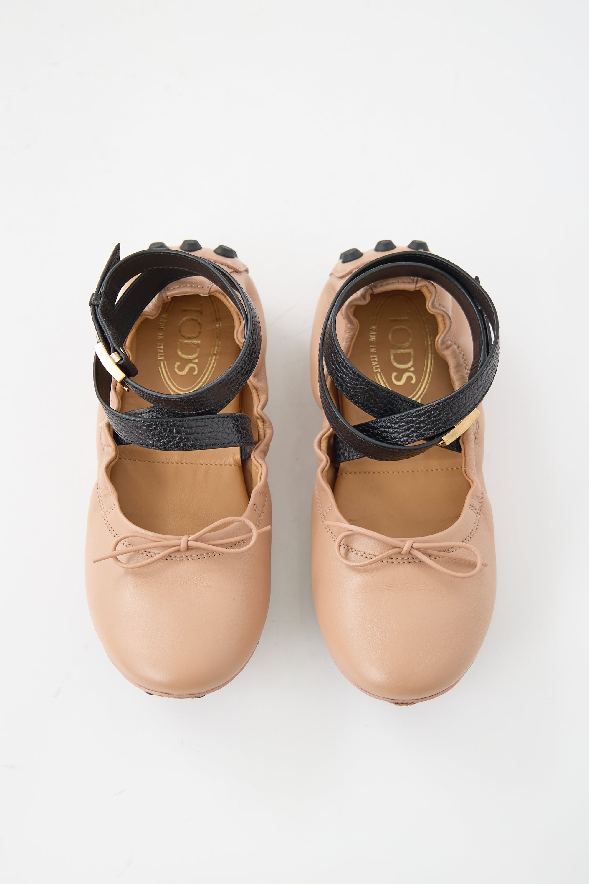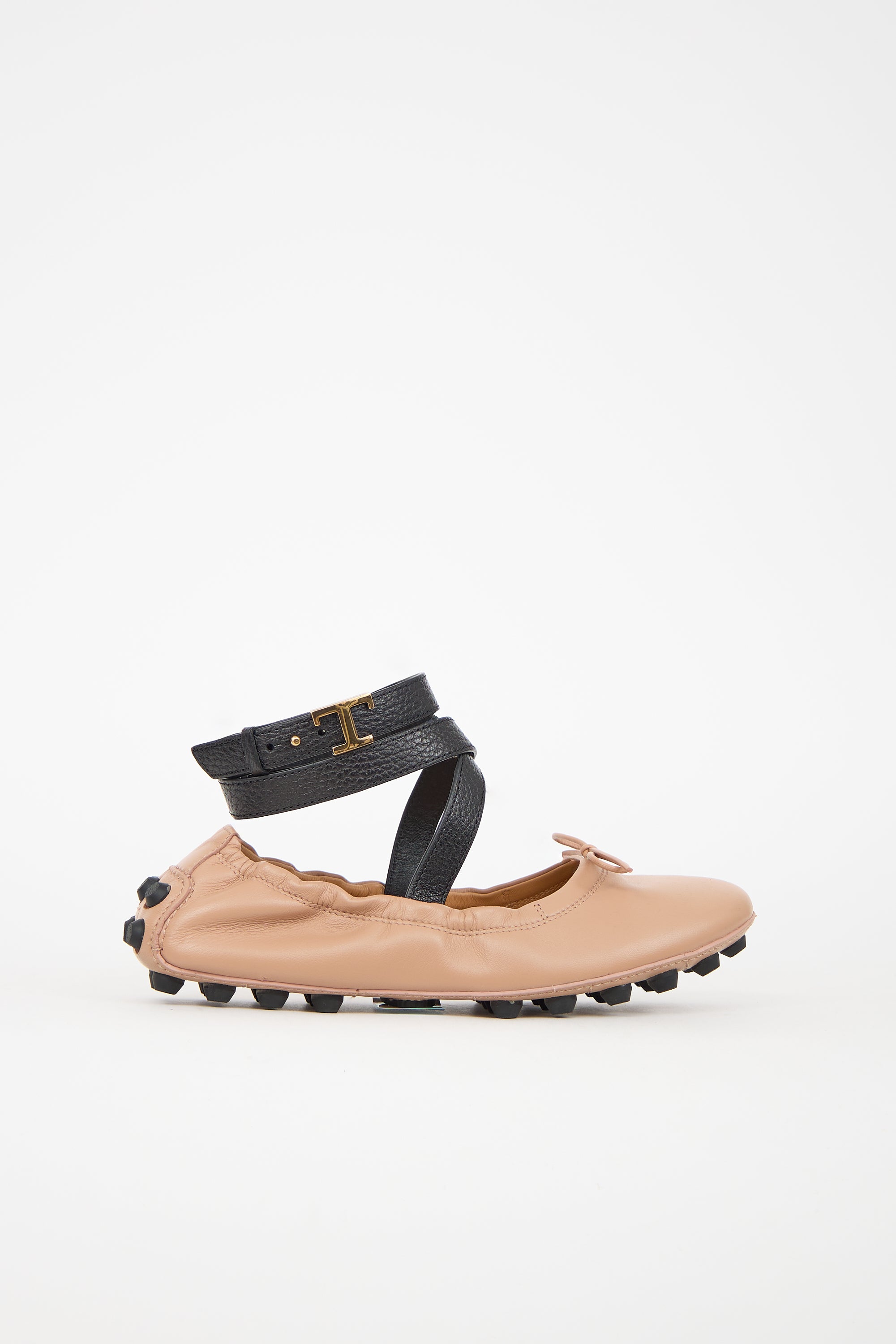 Pre-owned Tod's beige leather ballet flats featuring rounded toe, bow at vamp, black leather wraparound ankle strap with logo buckle closure, and rubber dot sole. Comes with original dust bag.