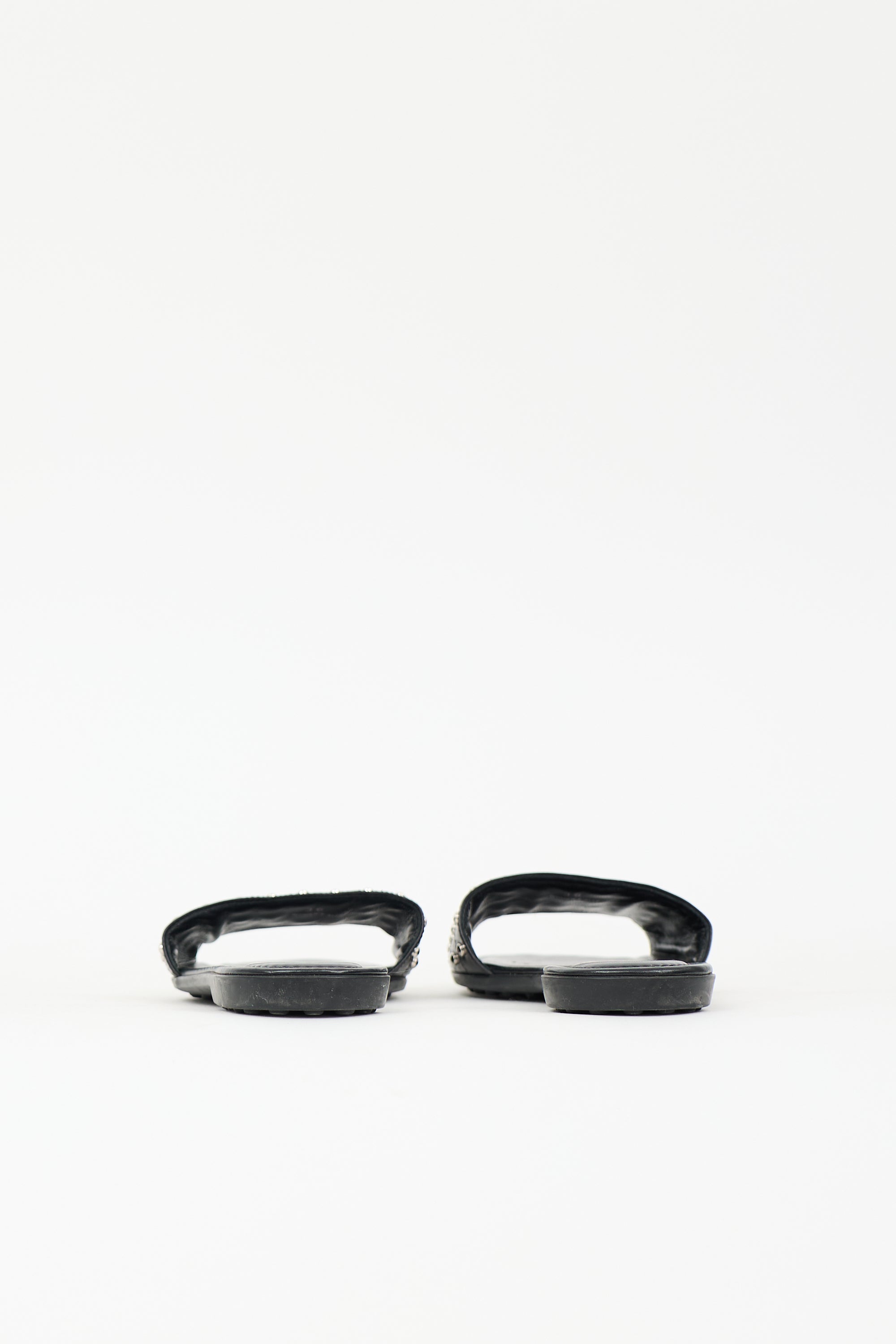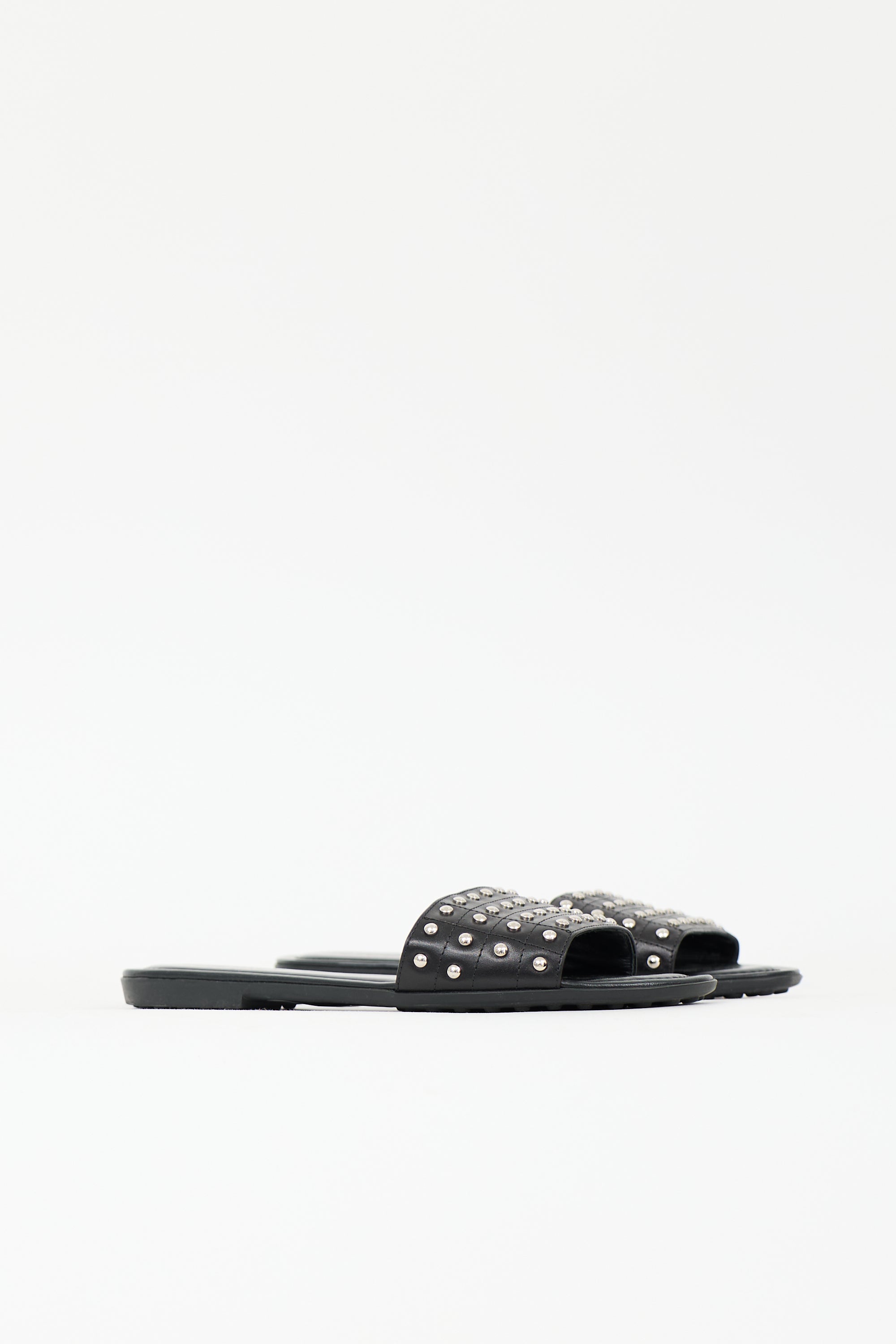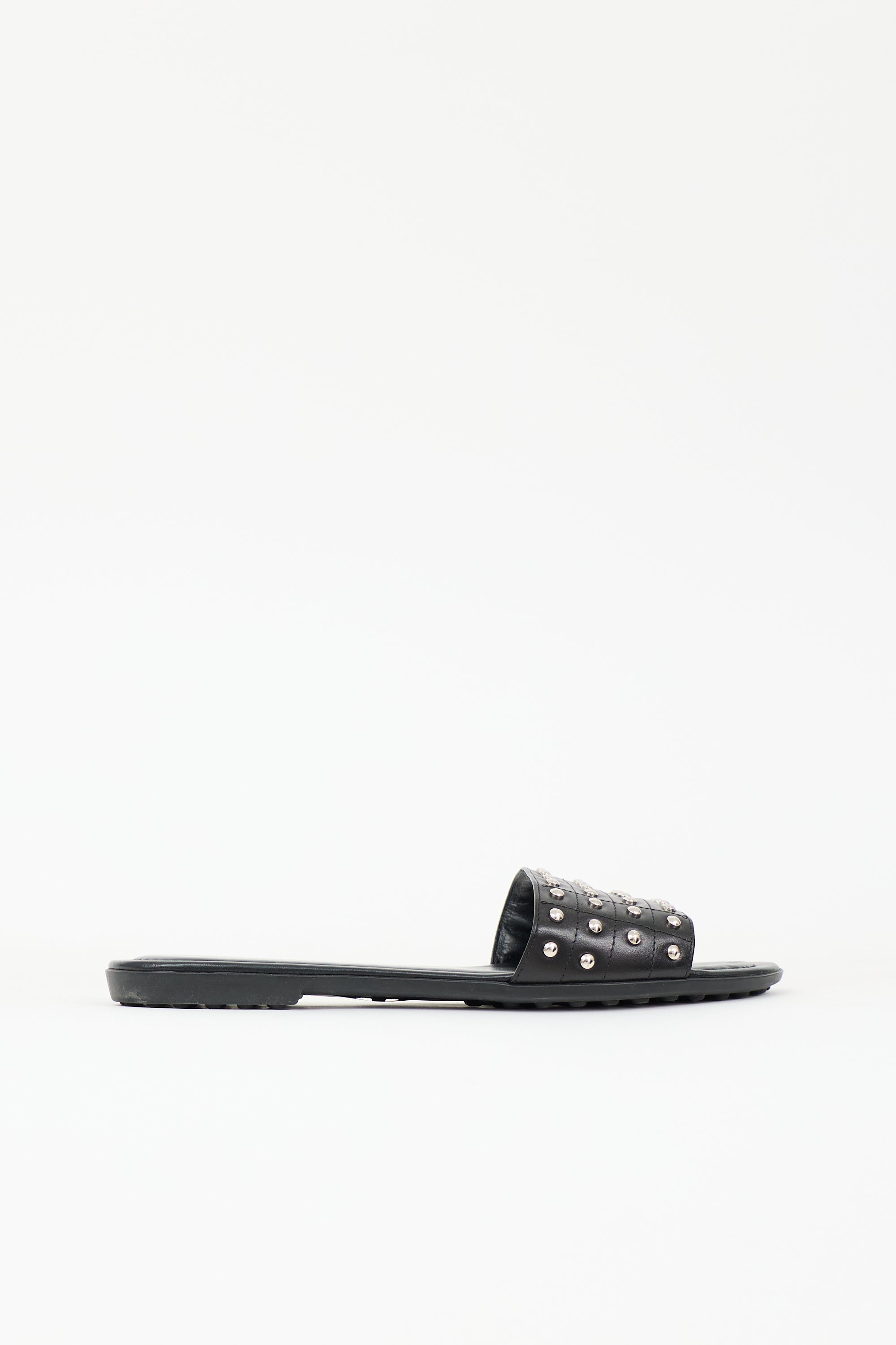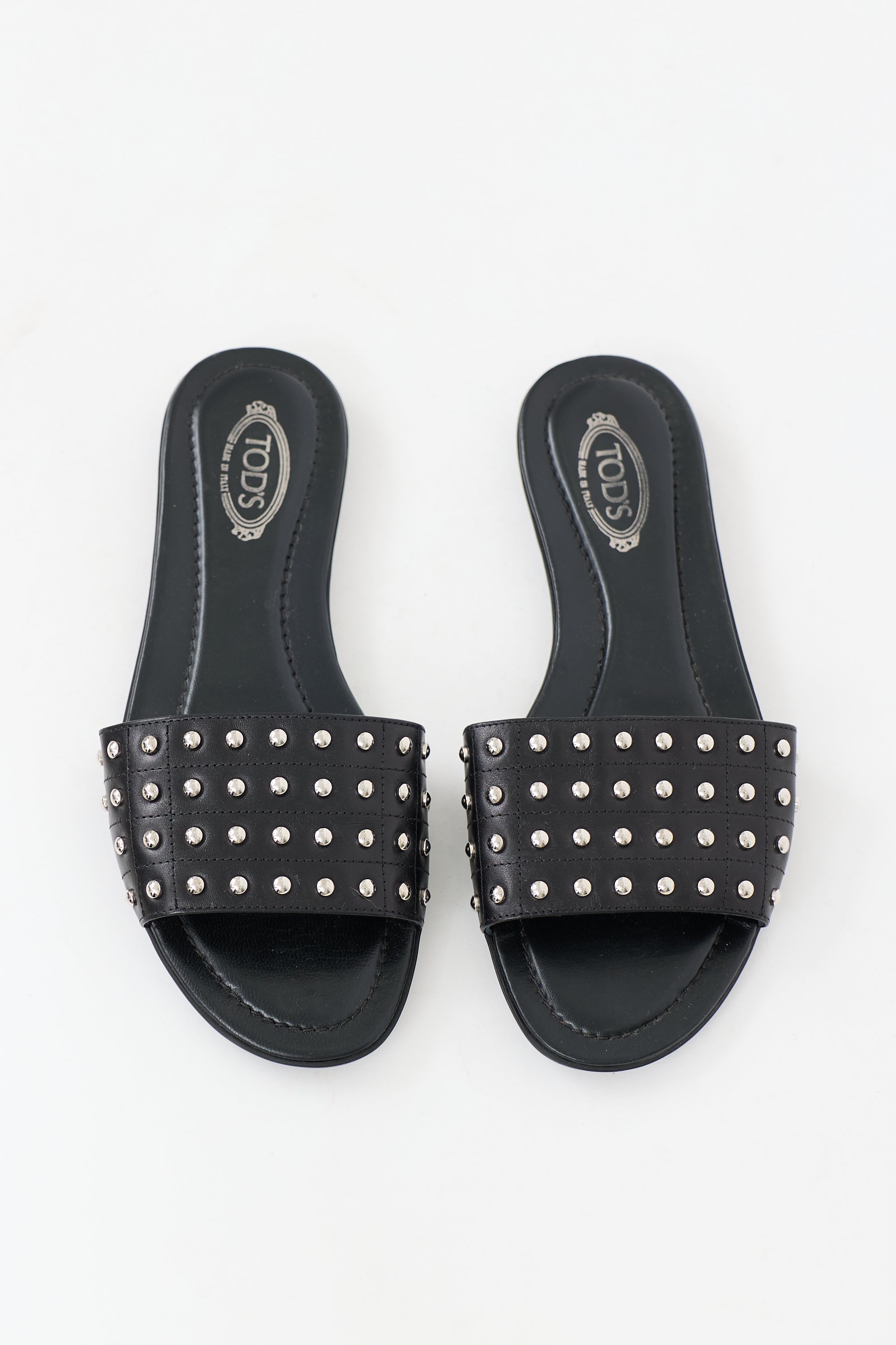Pre-owned Tod's black leather slides featuring silver tone stud embellishment, open rounded toe, and rubber outsole.