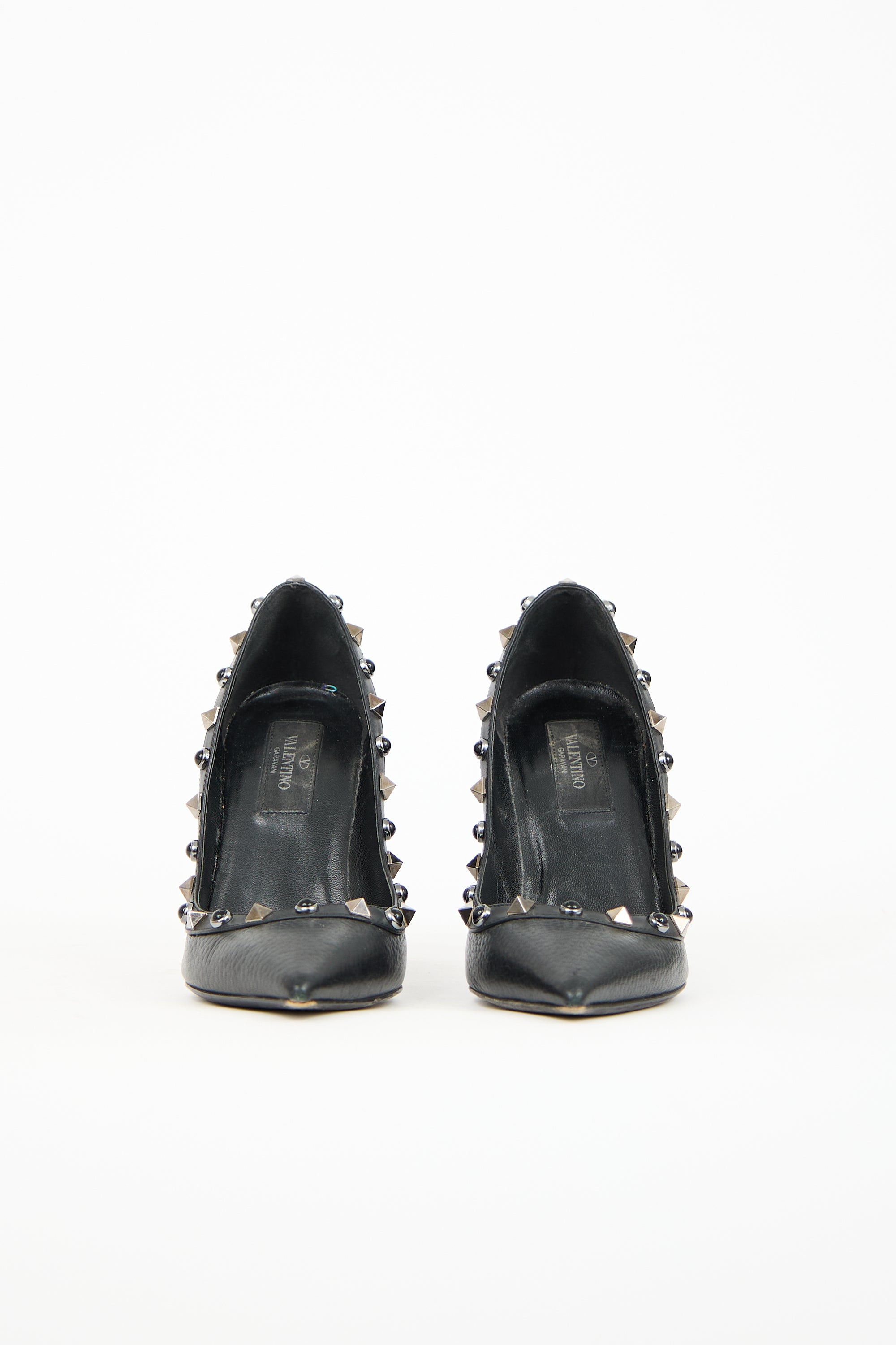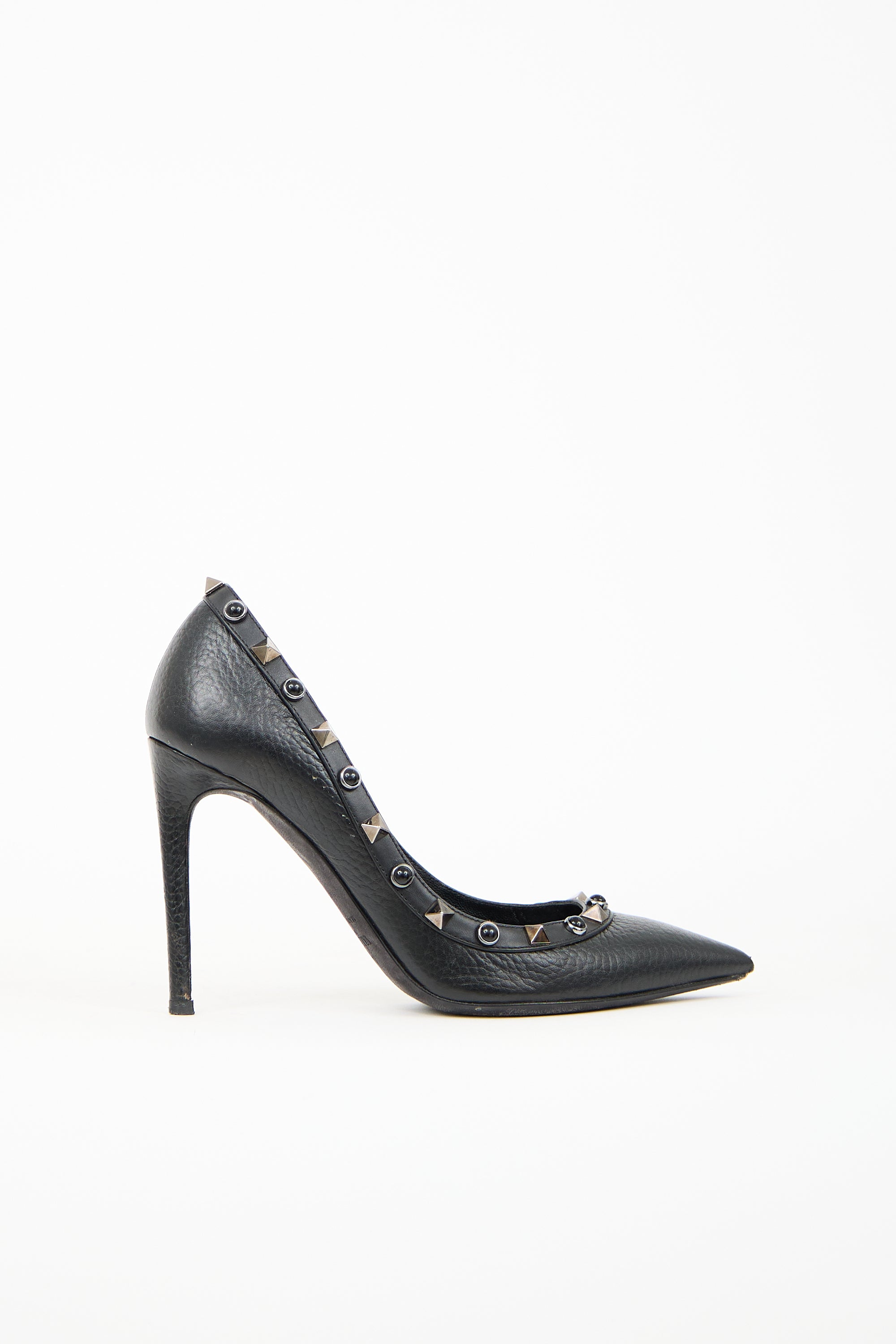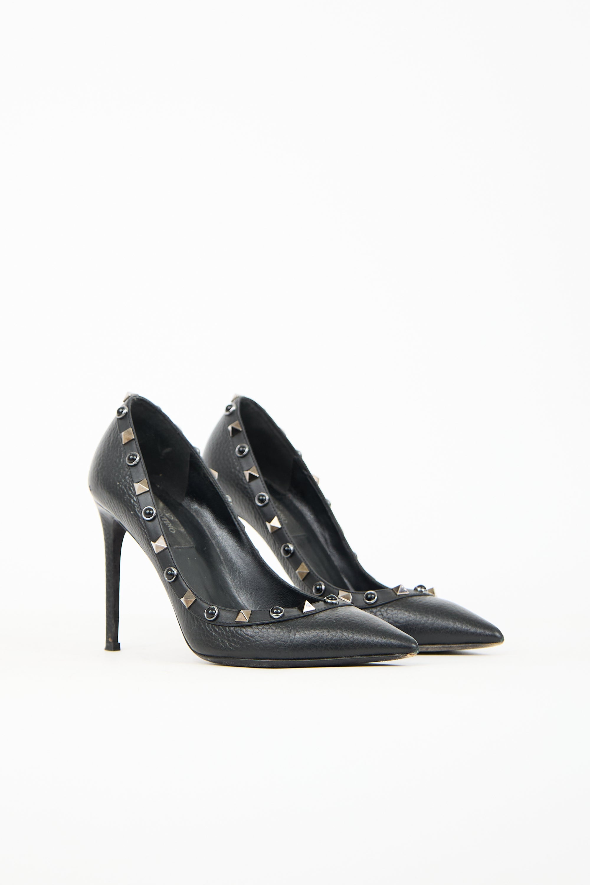 Pre-owned Valentino black leather Rockstud Rolling pumps featuring a pointed toe, embossed leather upper, silver tone Rockstud embellishment at collar, and stiletto heel.