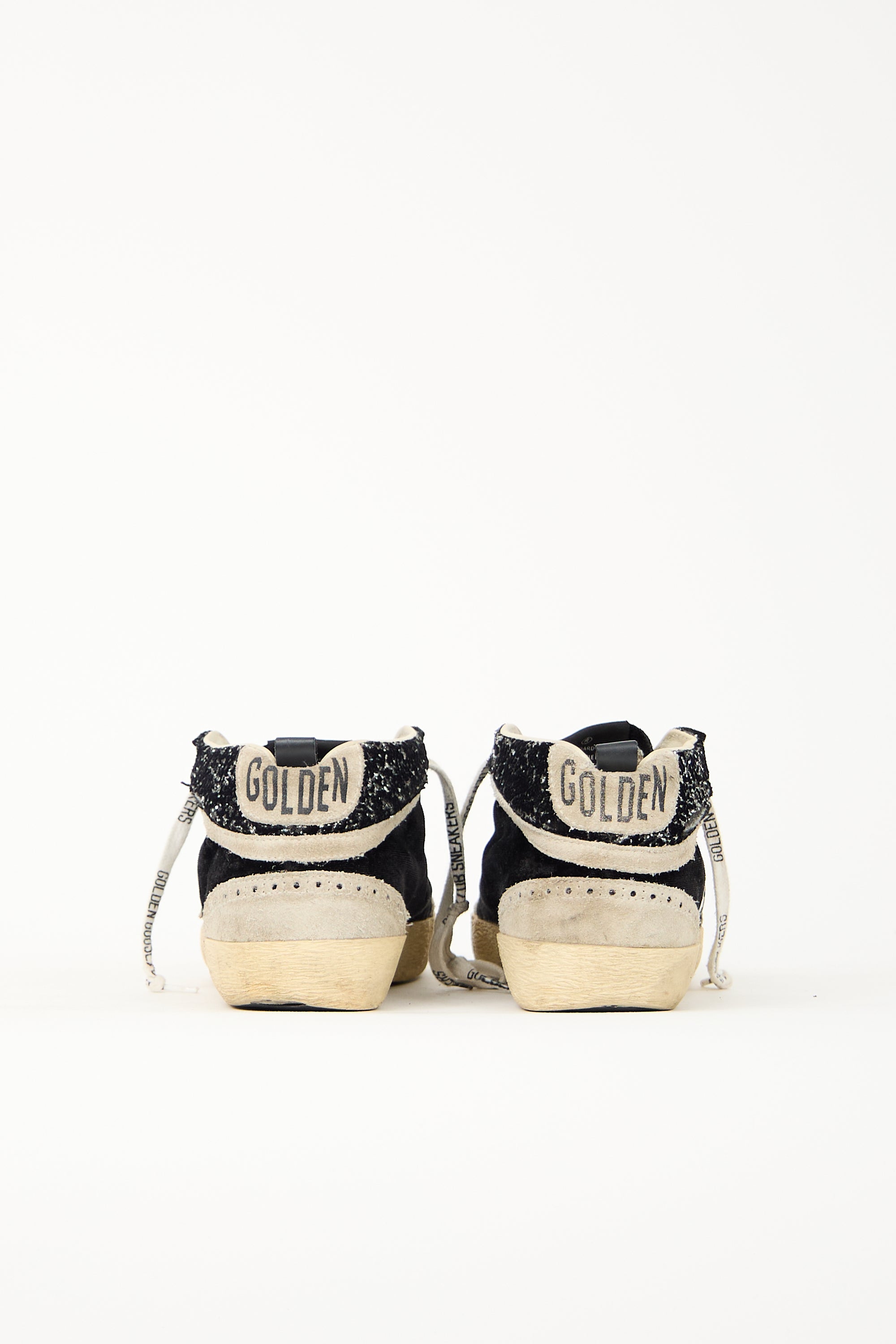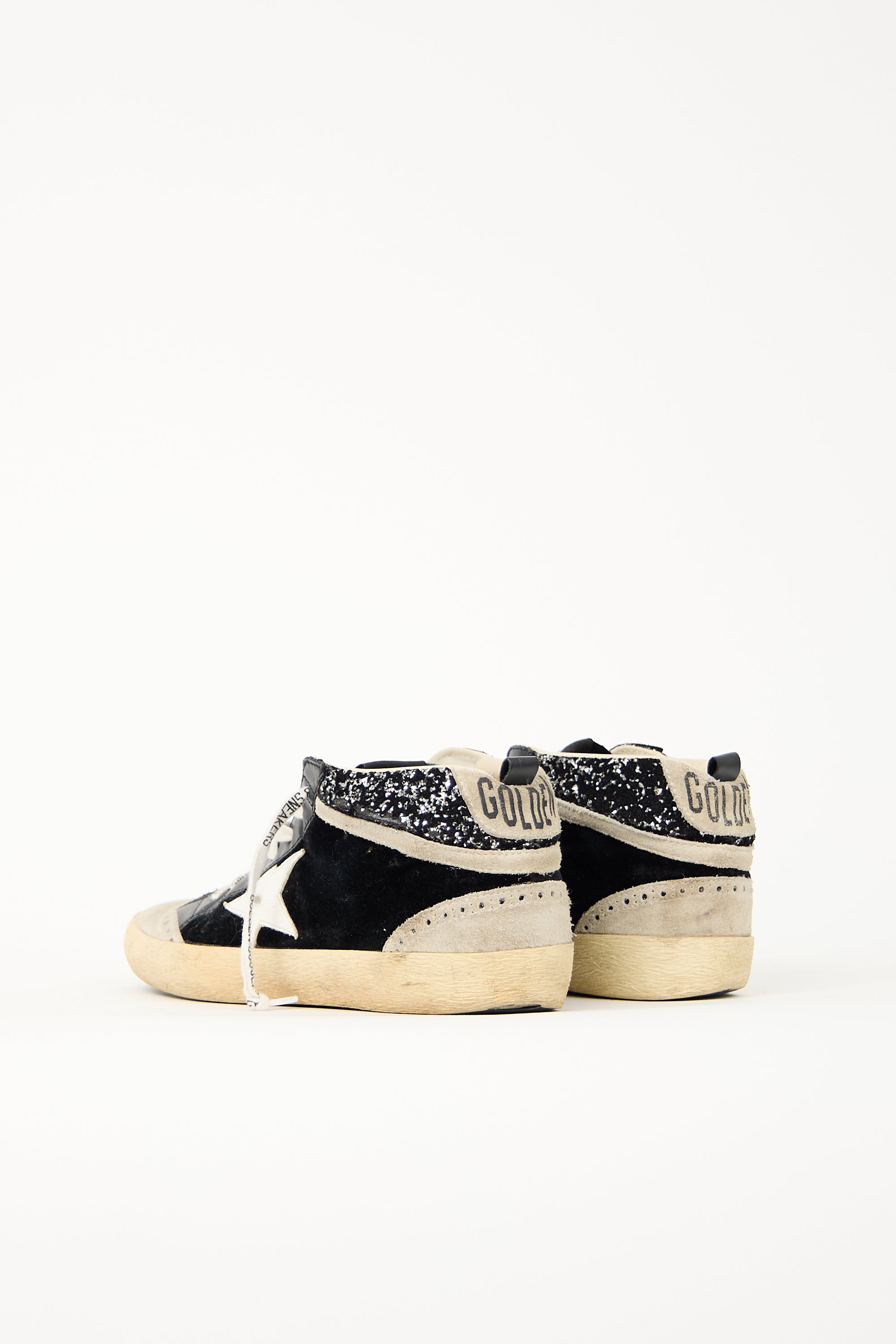 Pre-owned Golden Goose black and grey Mid Star sneakers featuring a rounded toe, velvet and leather upper, lace up front, glitter collar, stamped logo at counter, rubber sole, and intentional distressing throughout.