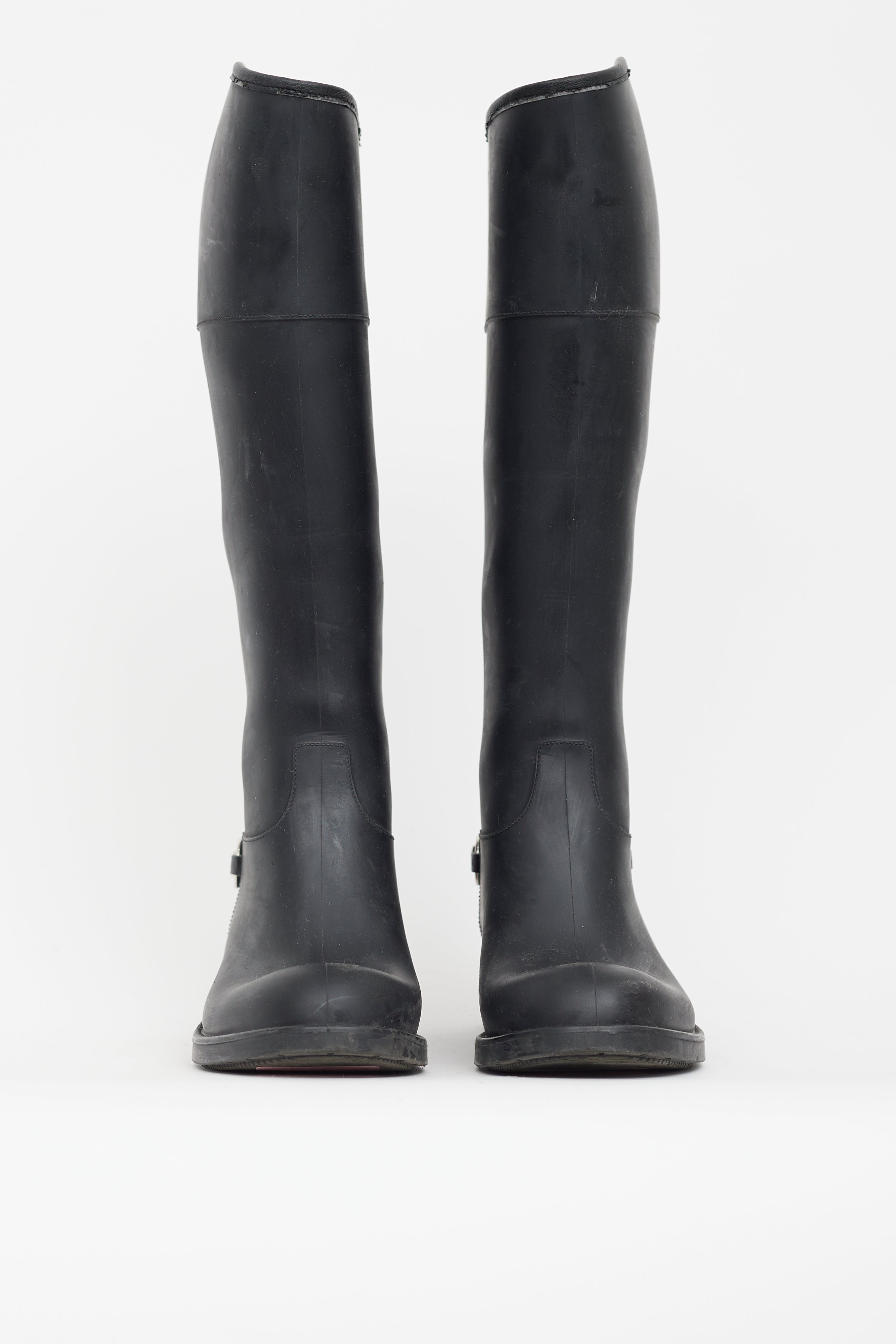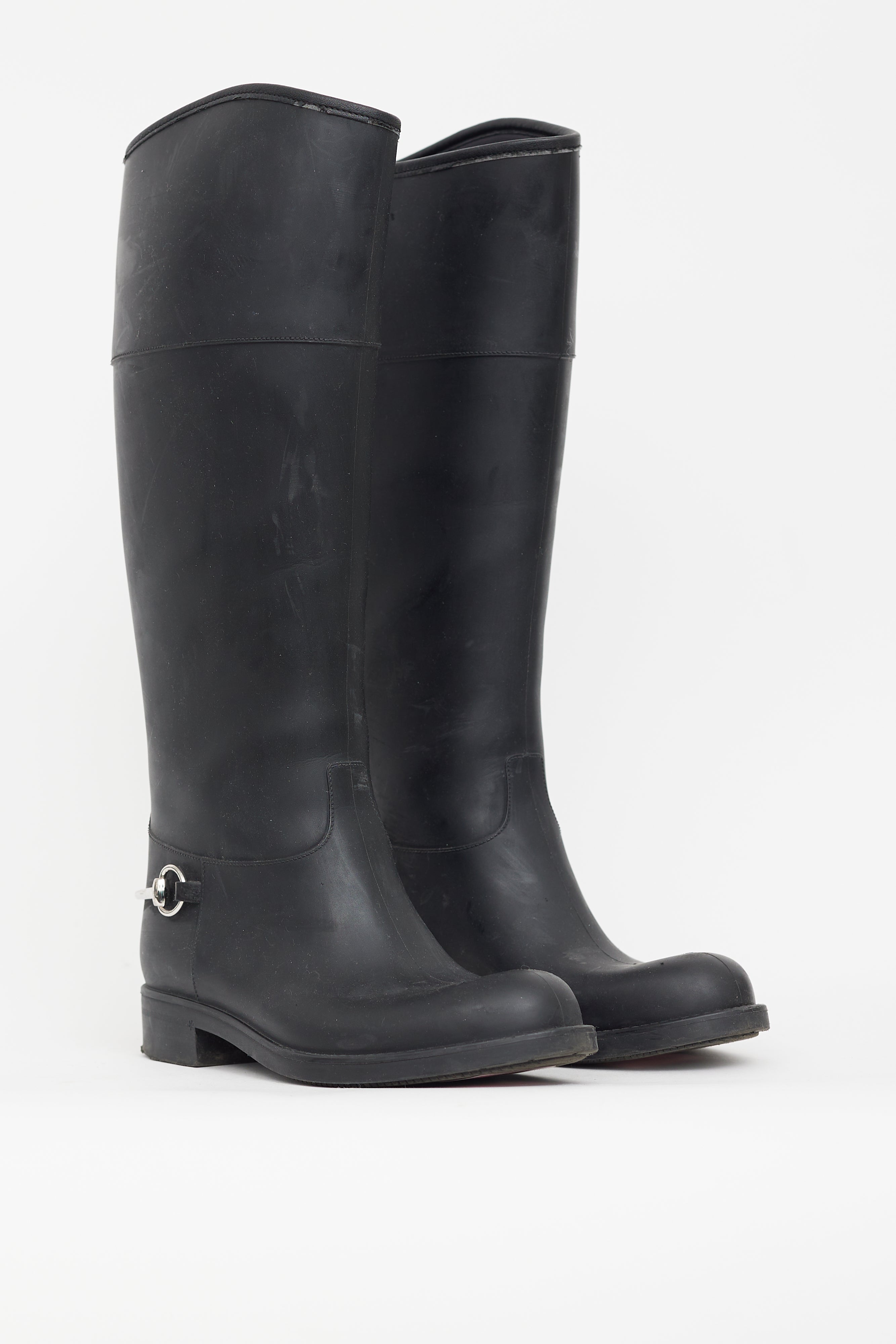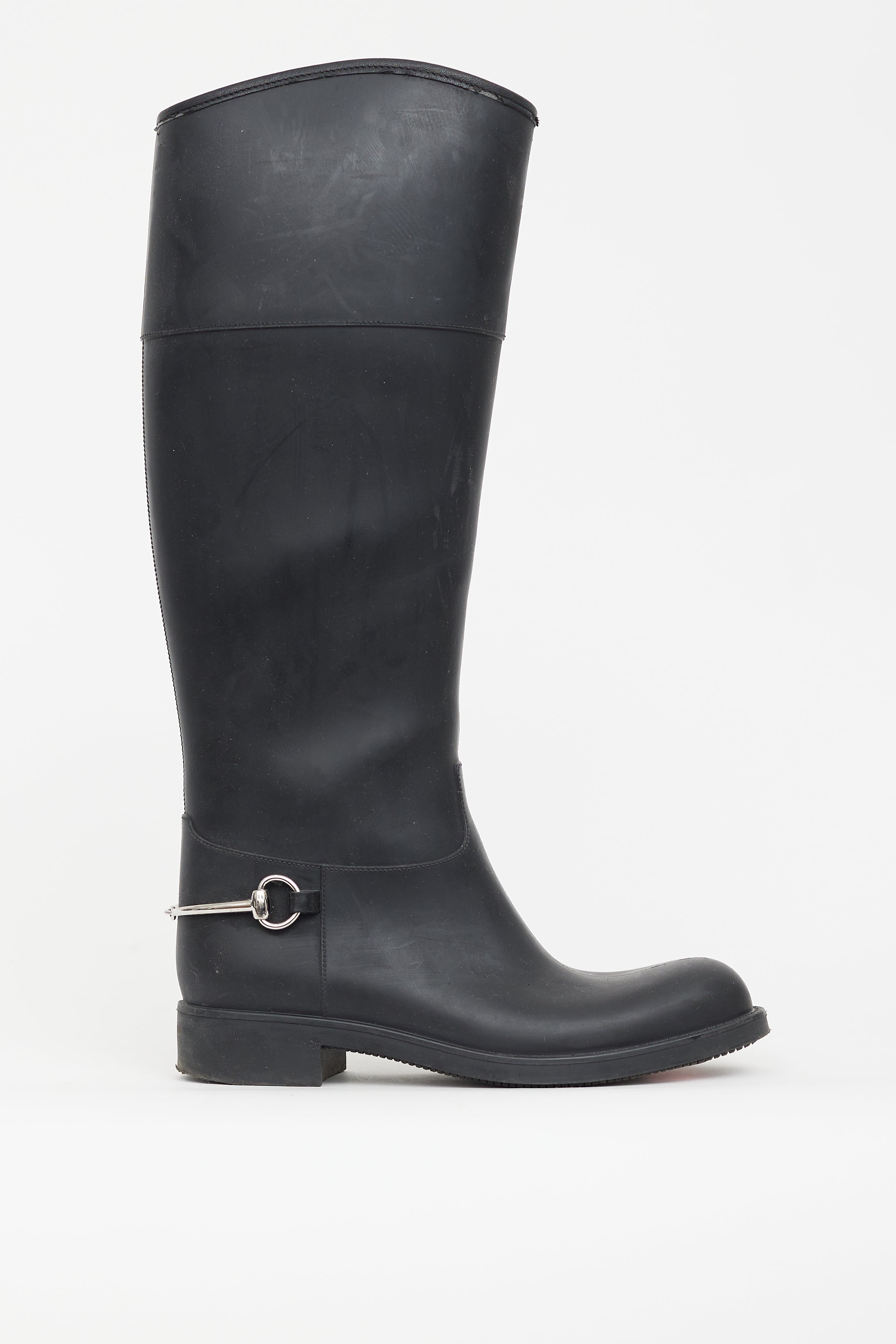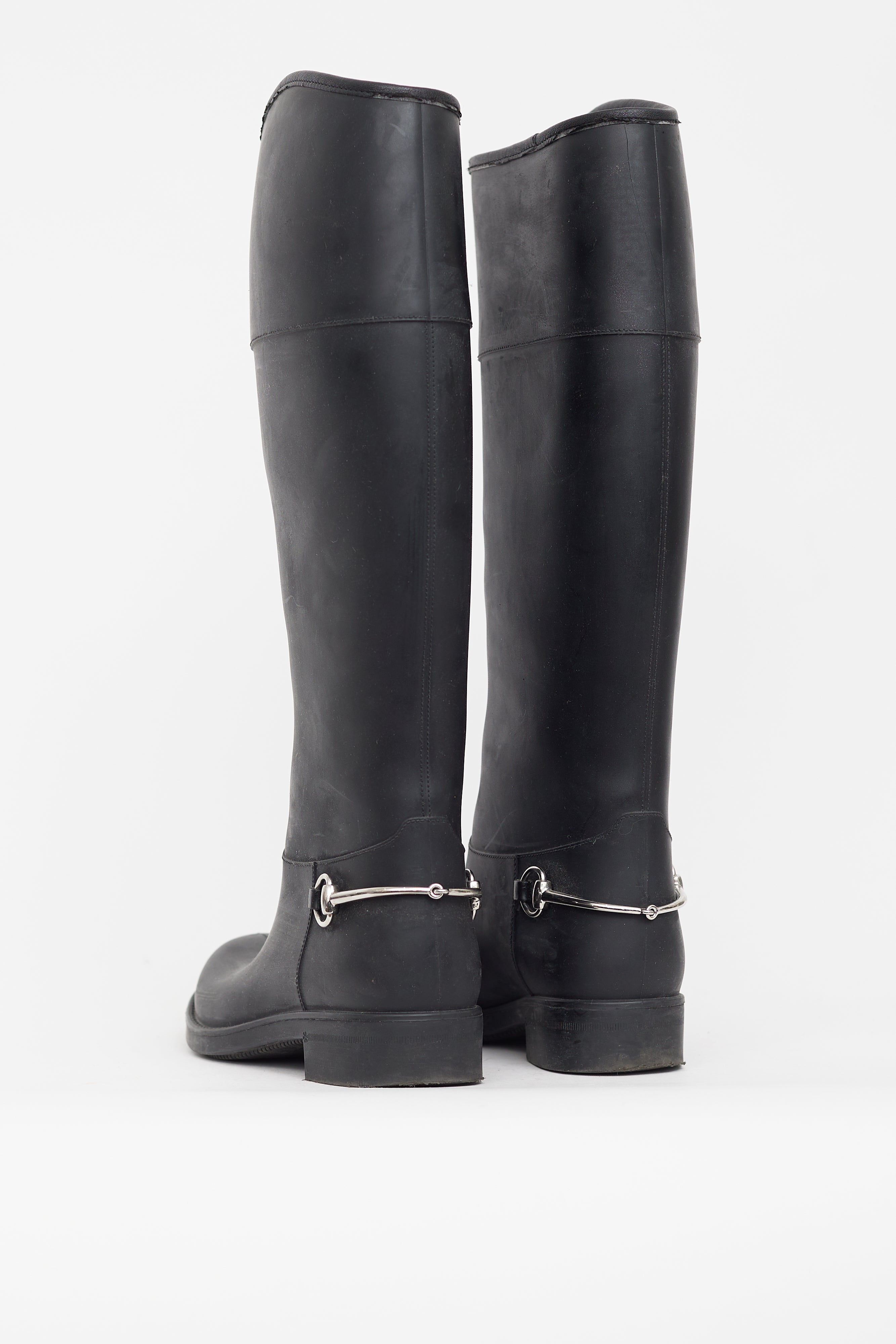 Pre-owned Gucci black rubber riding boots featuring round toe, curved collar, padded insole and silver tone Horsebit hardware at back.