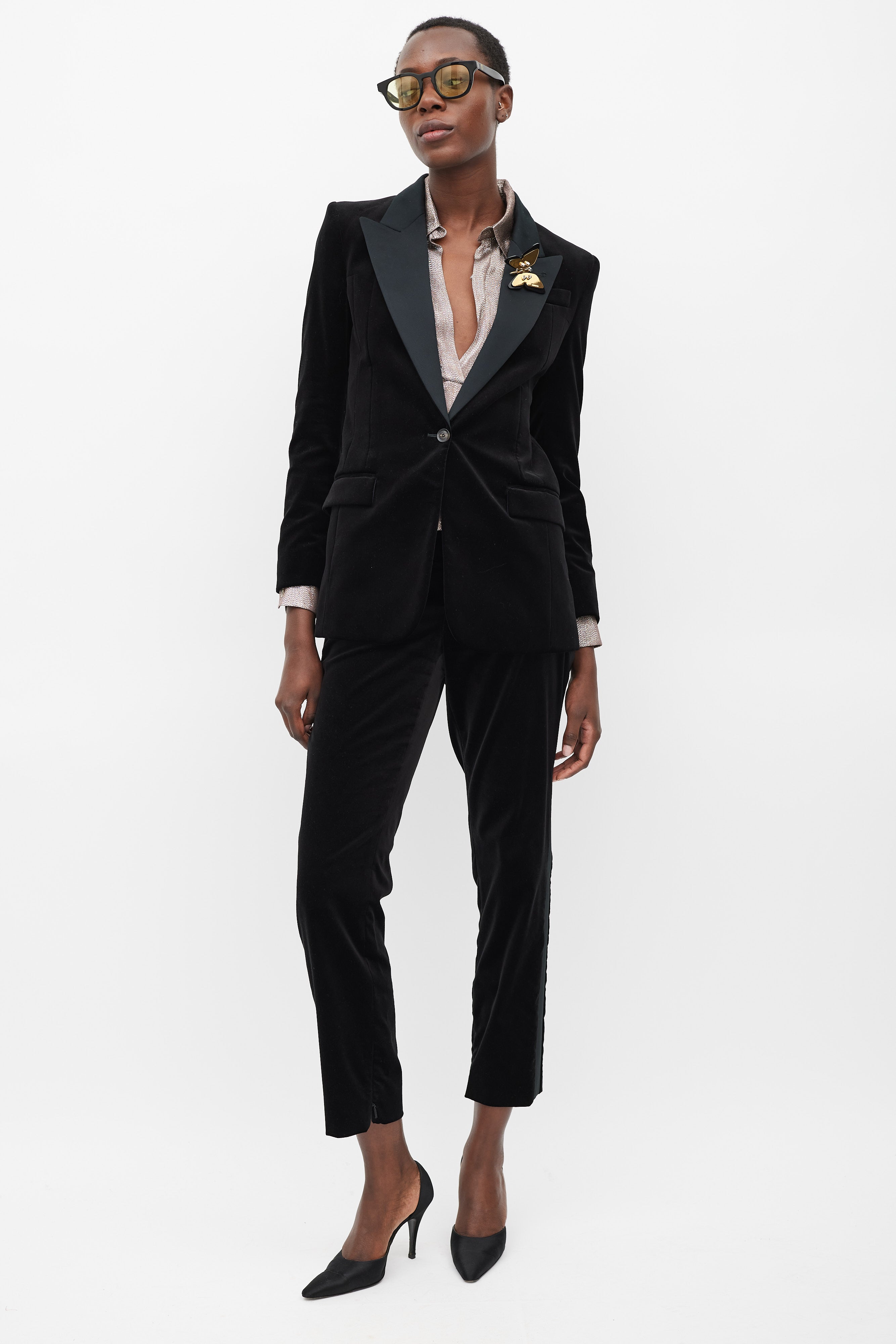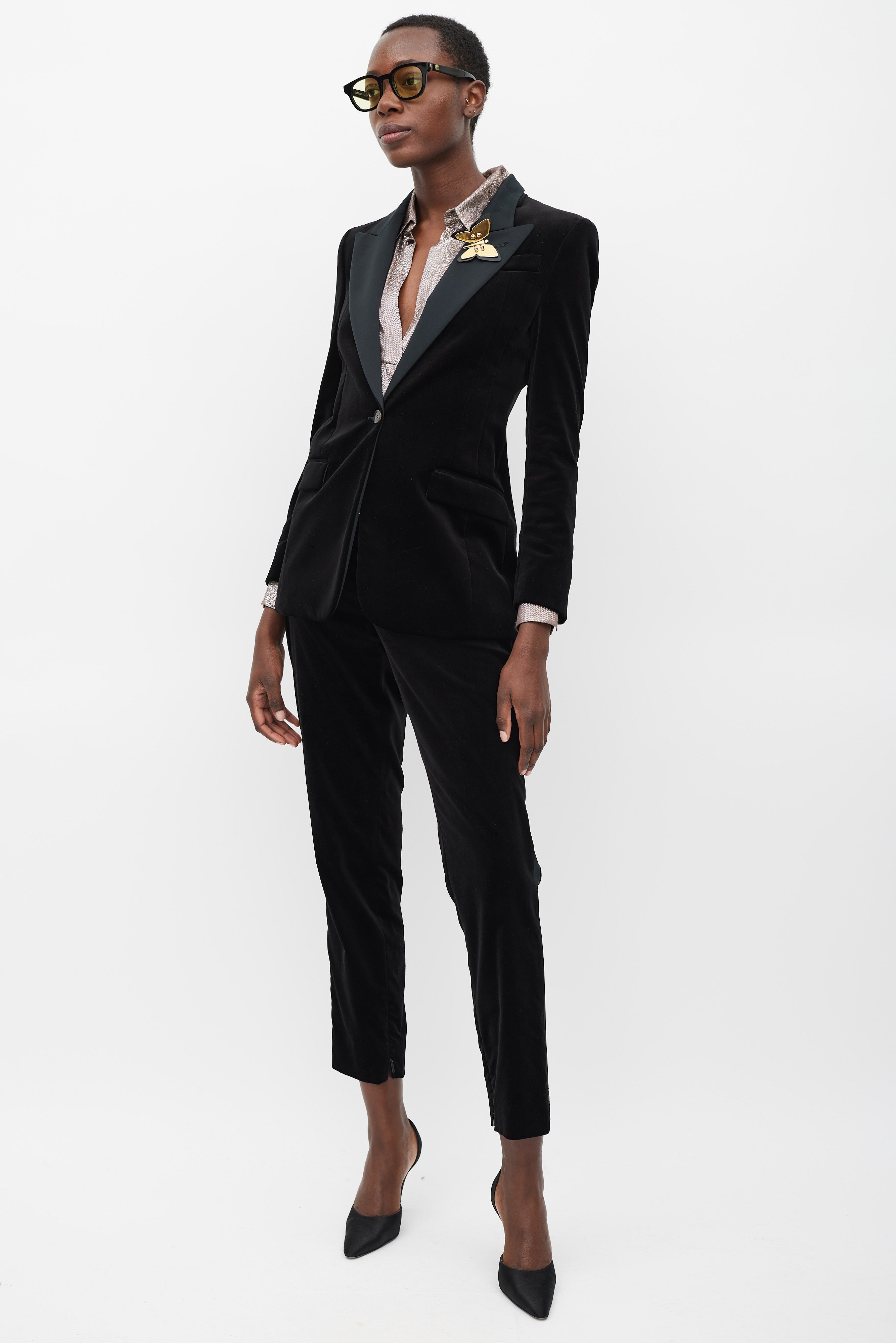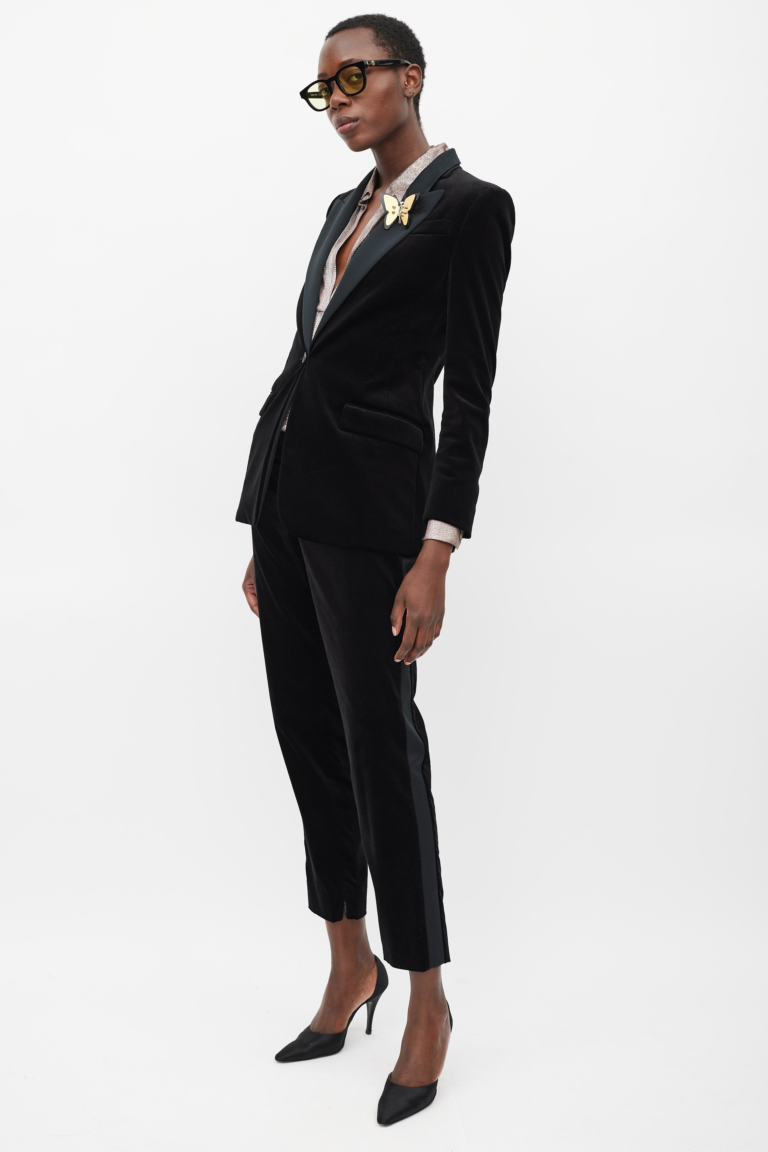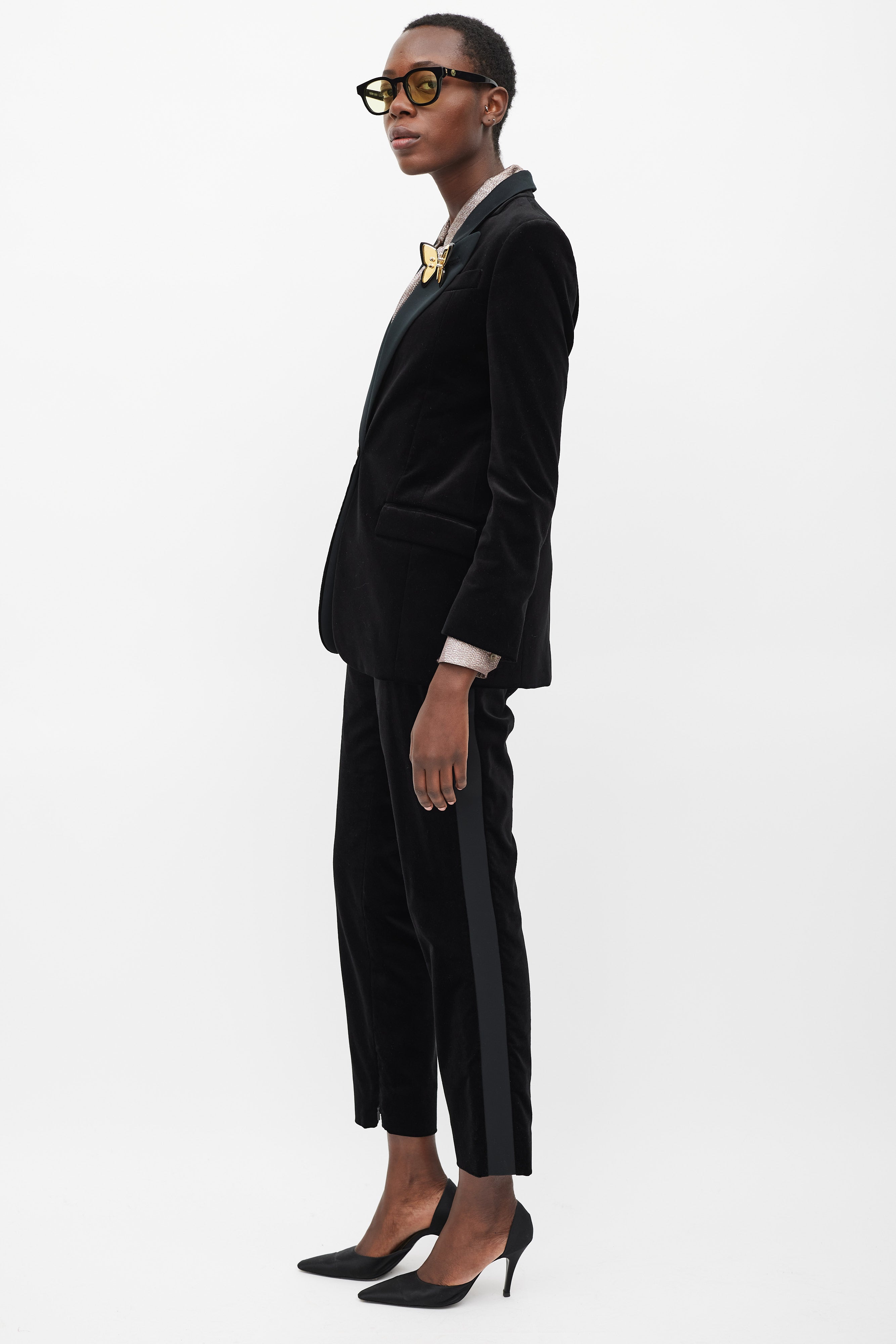 Pre-owned Gucci black velvet suit featuring blazer featuring a satin peak lapel, detachable gold tone metal plated butterfly brooch, slip pocket at left chest, two flap pockets at front hip, front single button closure, back vent, padded shoulders, and long sleeves with buttoned cuffs. Matching Trousers feature a slim leg, side stripes, zippered ankles, two front slash pockets, and concealed front zip with button fastenings. Blazer is lined.