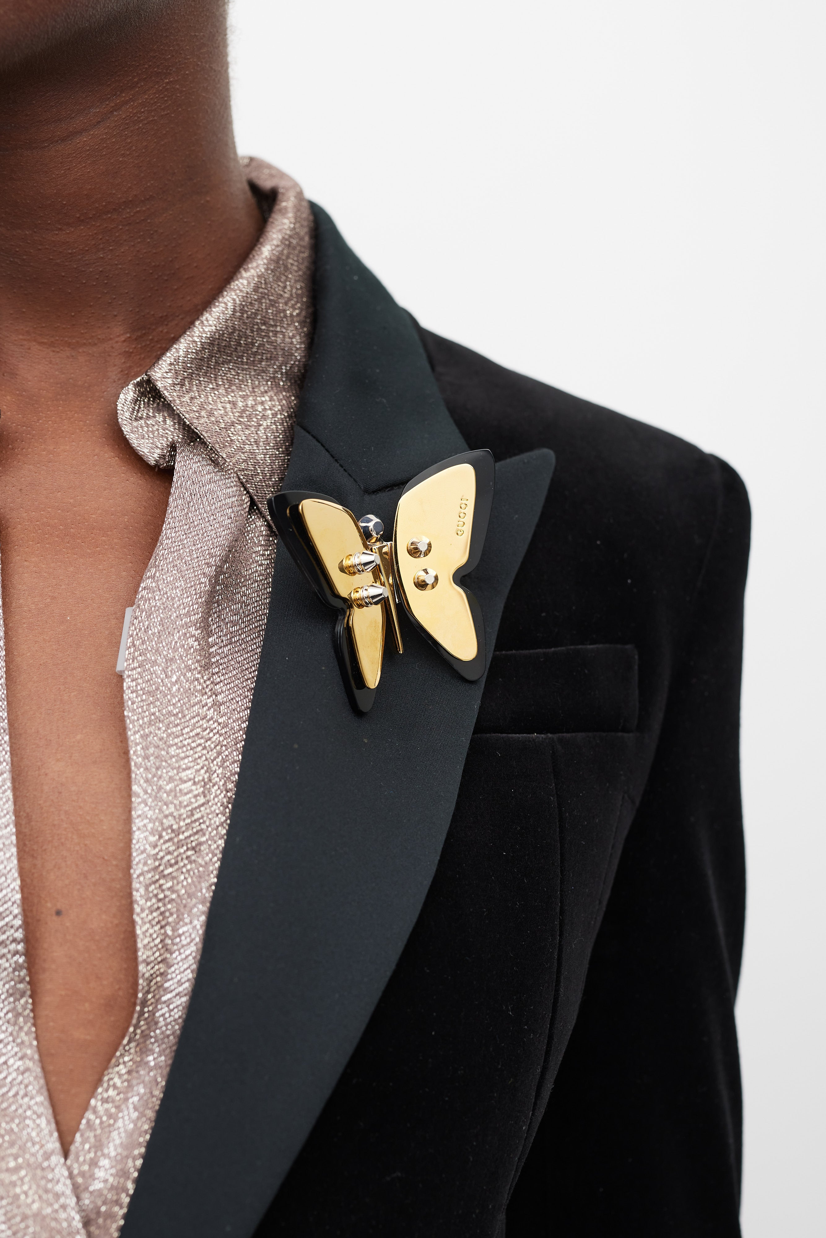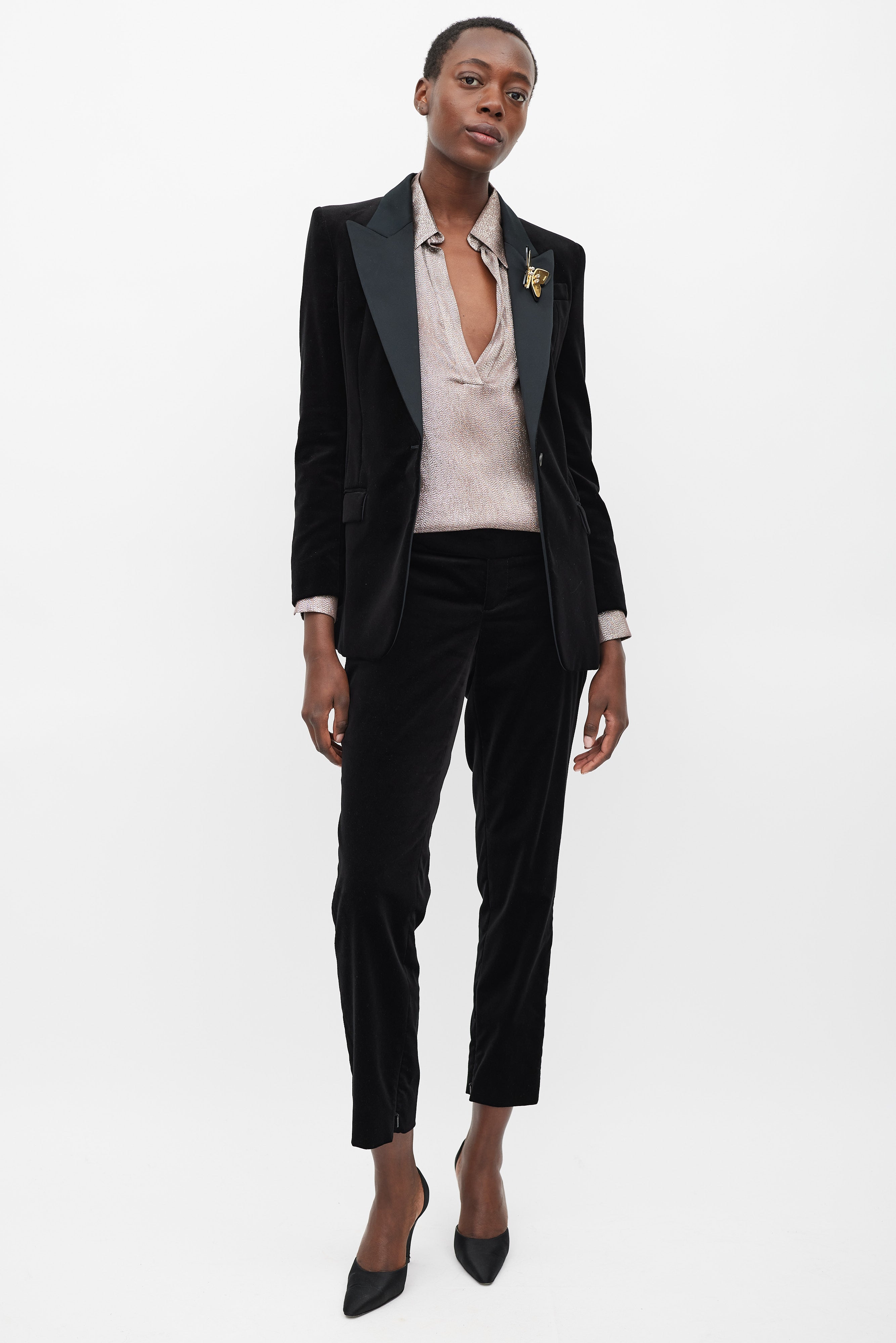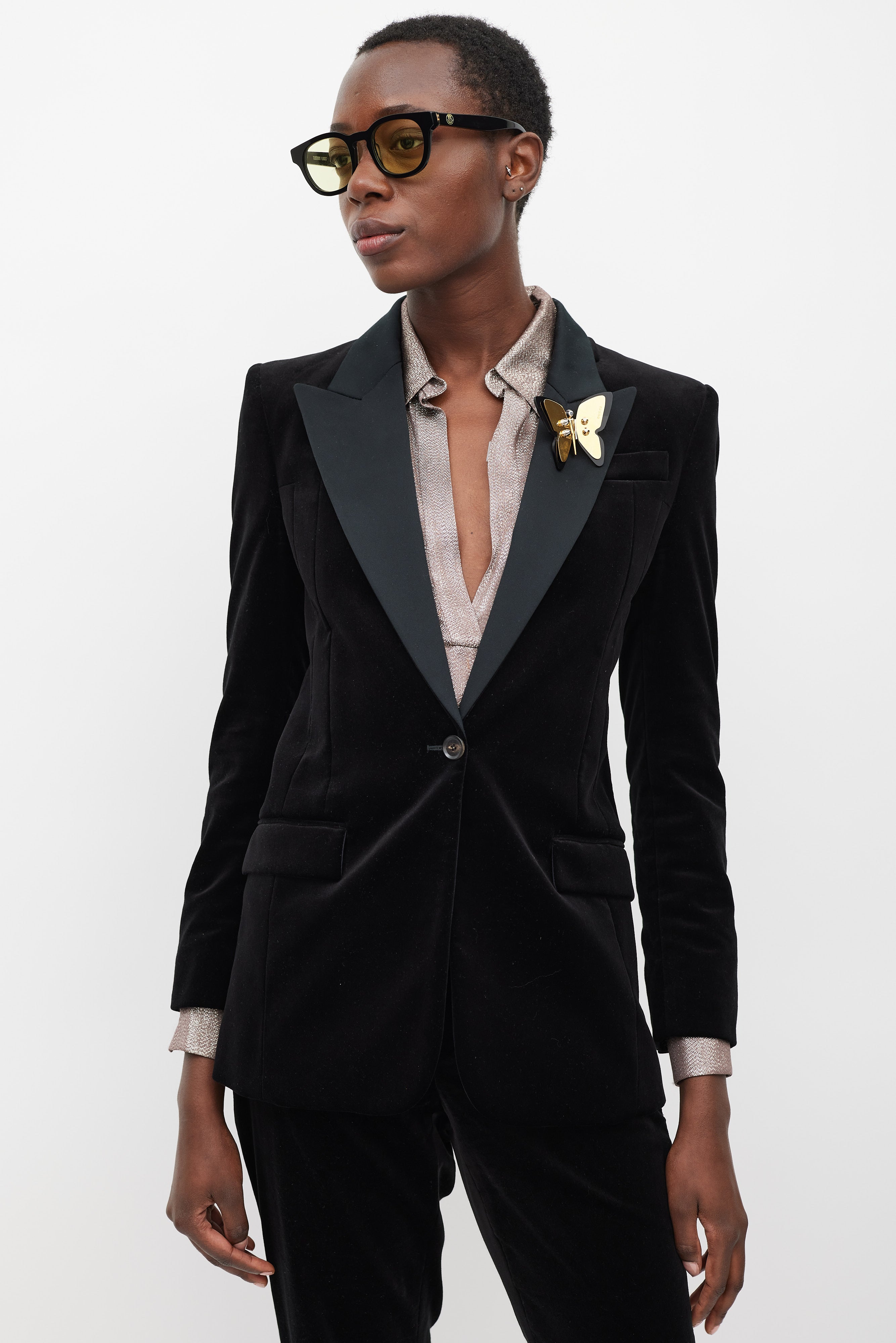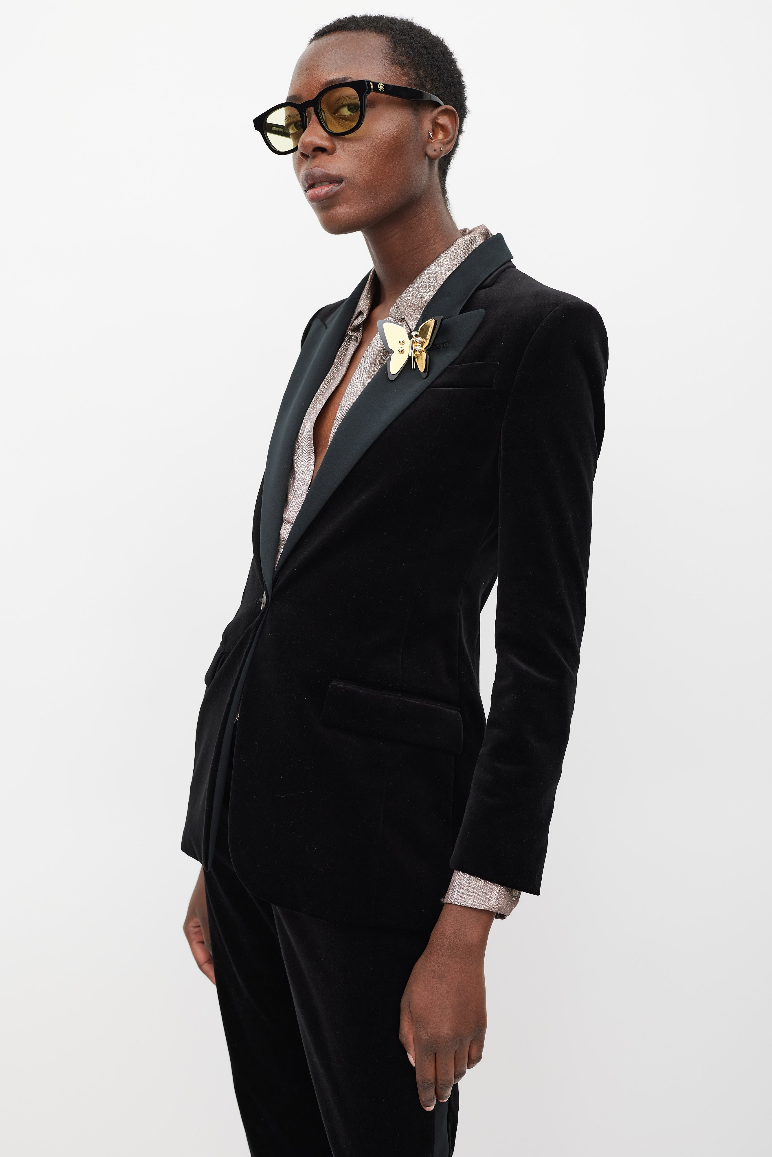 Pre-owned Gucci black velvet suit featuring blazer featuring a satin peak lapel, detachable gold tone metal plated butterfly brooch, slip pocket at left chest, two flap pockets at front hip, front single button closure, back vent, padded shoulders, and long sleeves with buttoned cuffs. Matching Trousers feature a slim leg, side stripes, zippered ankles, two front slash pockets, and concealed front zip with button fastenings. Blazer is lined.