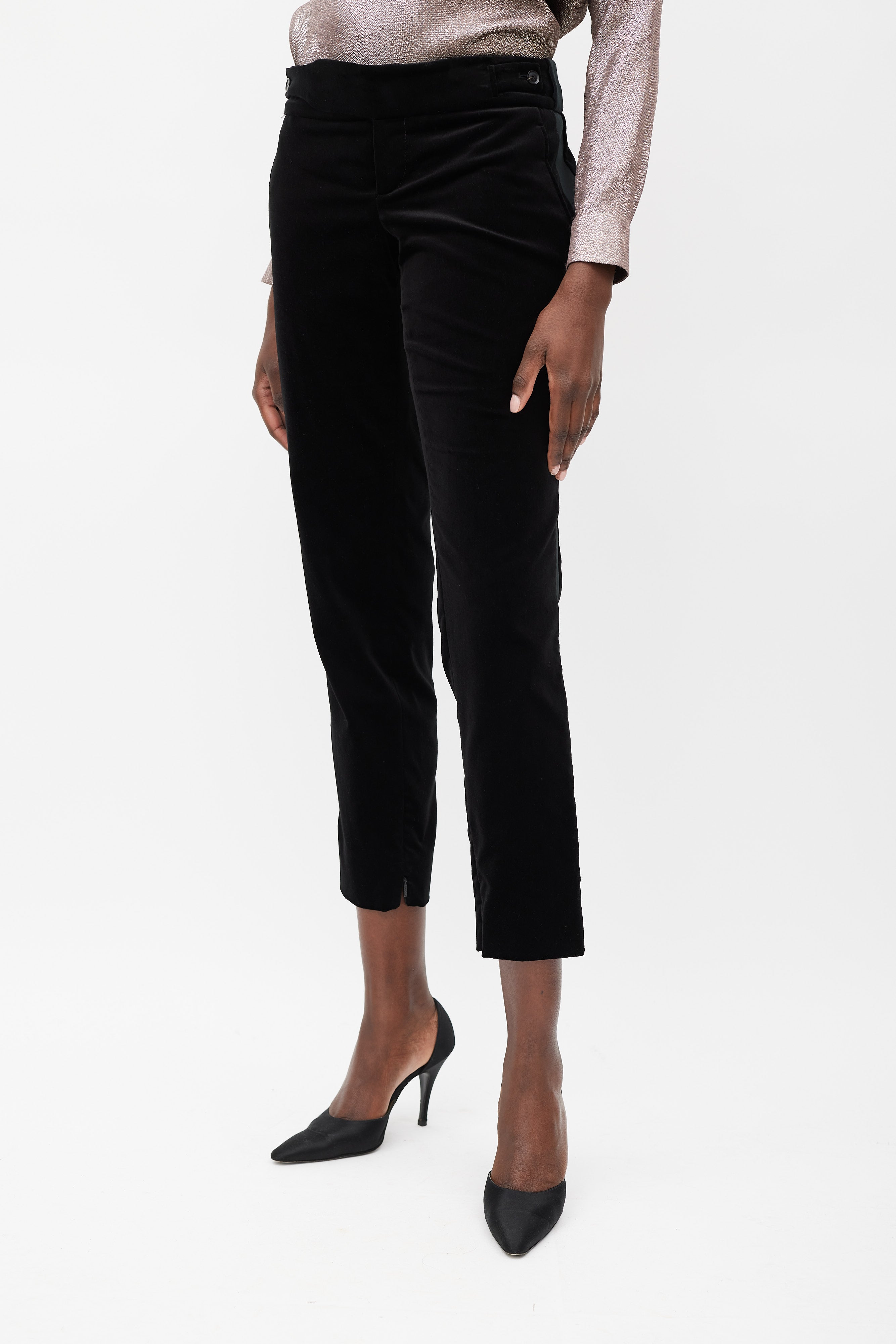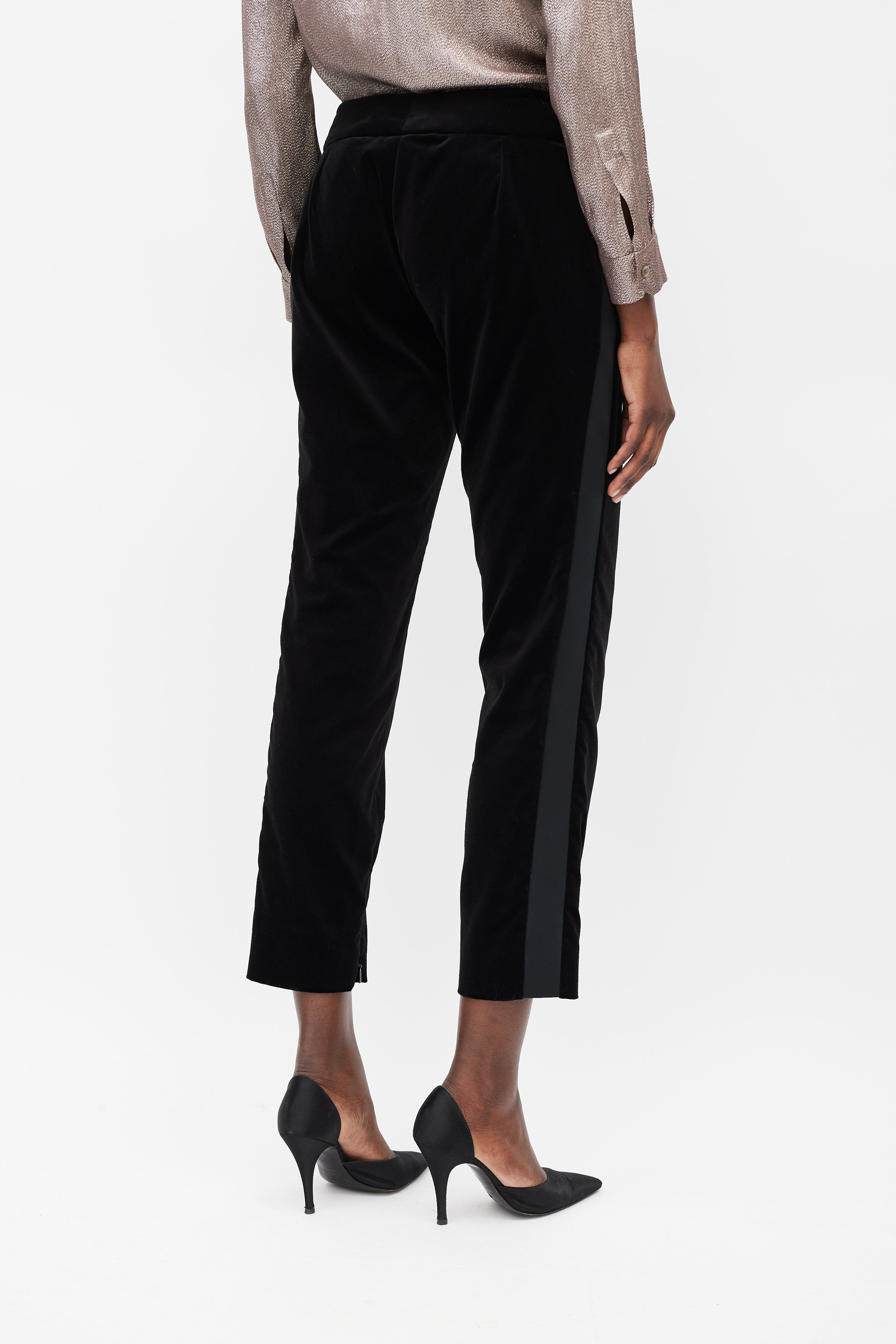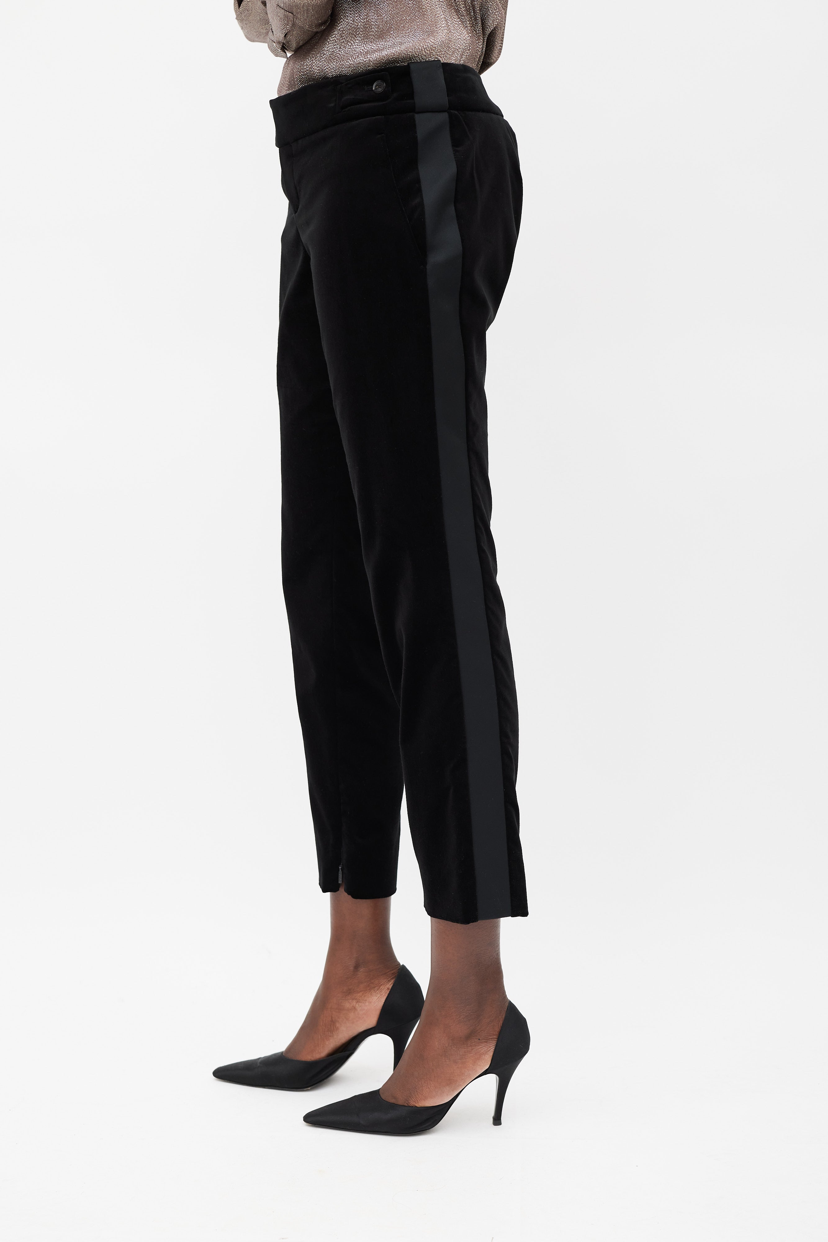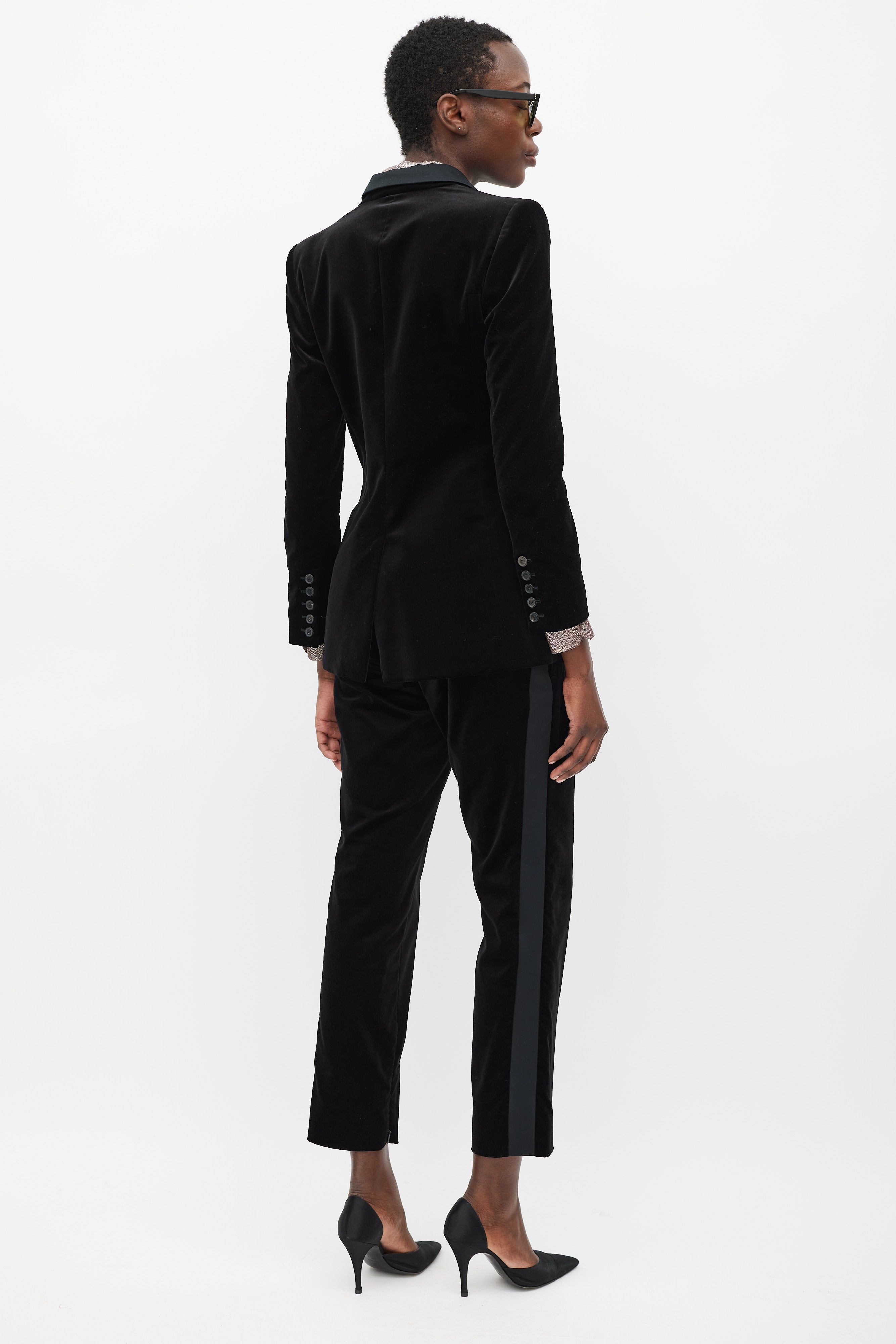 Pre-owned Gucci black velvet suit featuring blazer featuring a satin peak lapel, detachable gold tone metal plated butterfly brooch, slip pocket at left chest, two flap pockets at front hip, front single button closure, back vent, padded shoulders, and long sleeves with buttoned cuffs. Matching Trousers feature a slim leg, side stripes, zippered ankles, two front slash pockets, and concealed front zip with button fastenings. Blazer is lined.