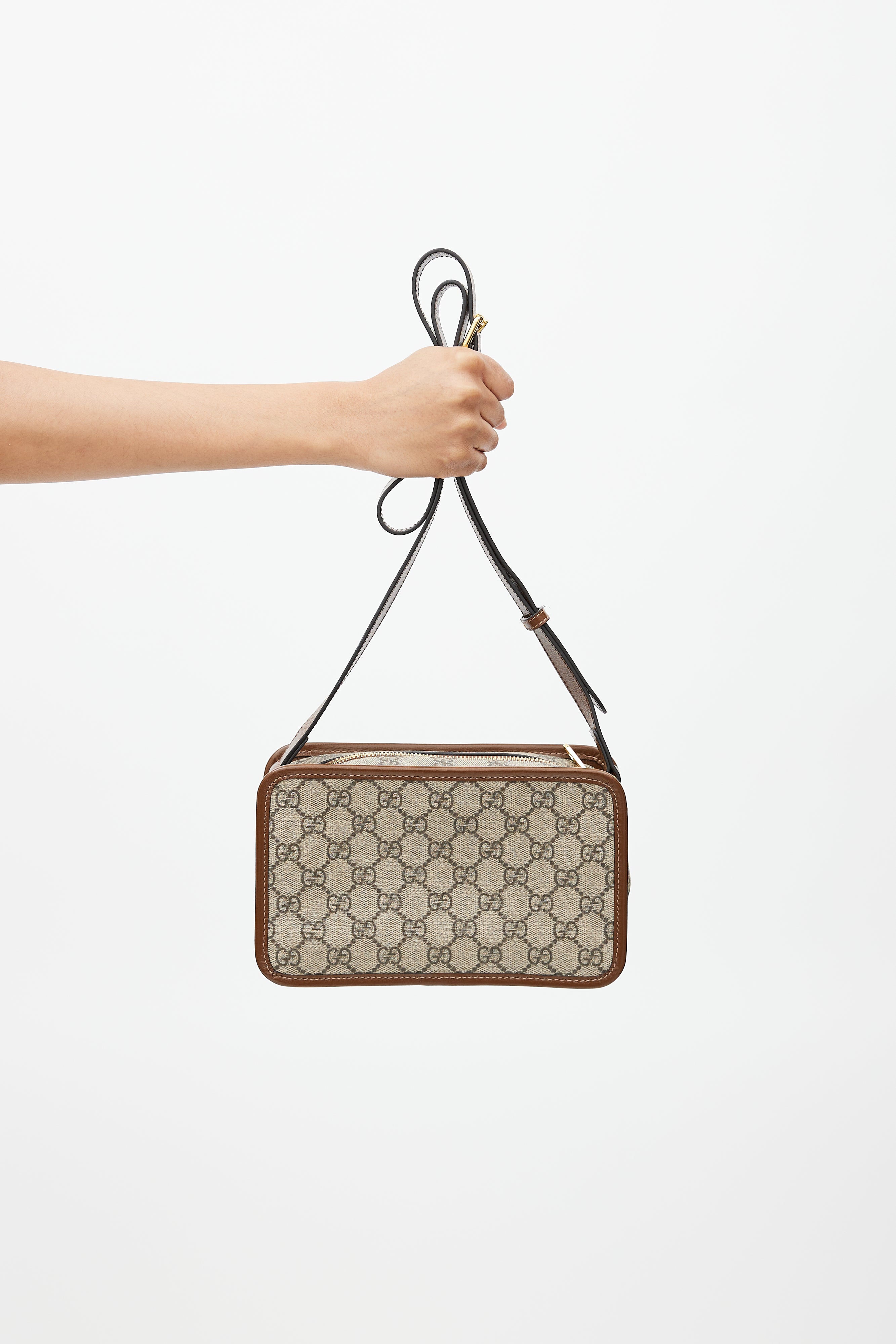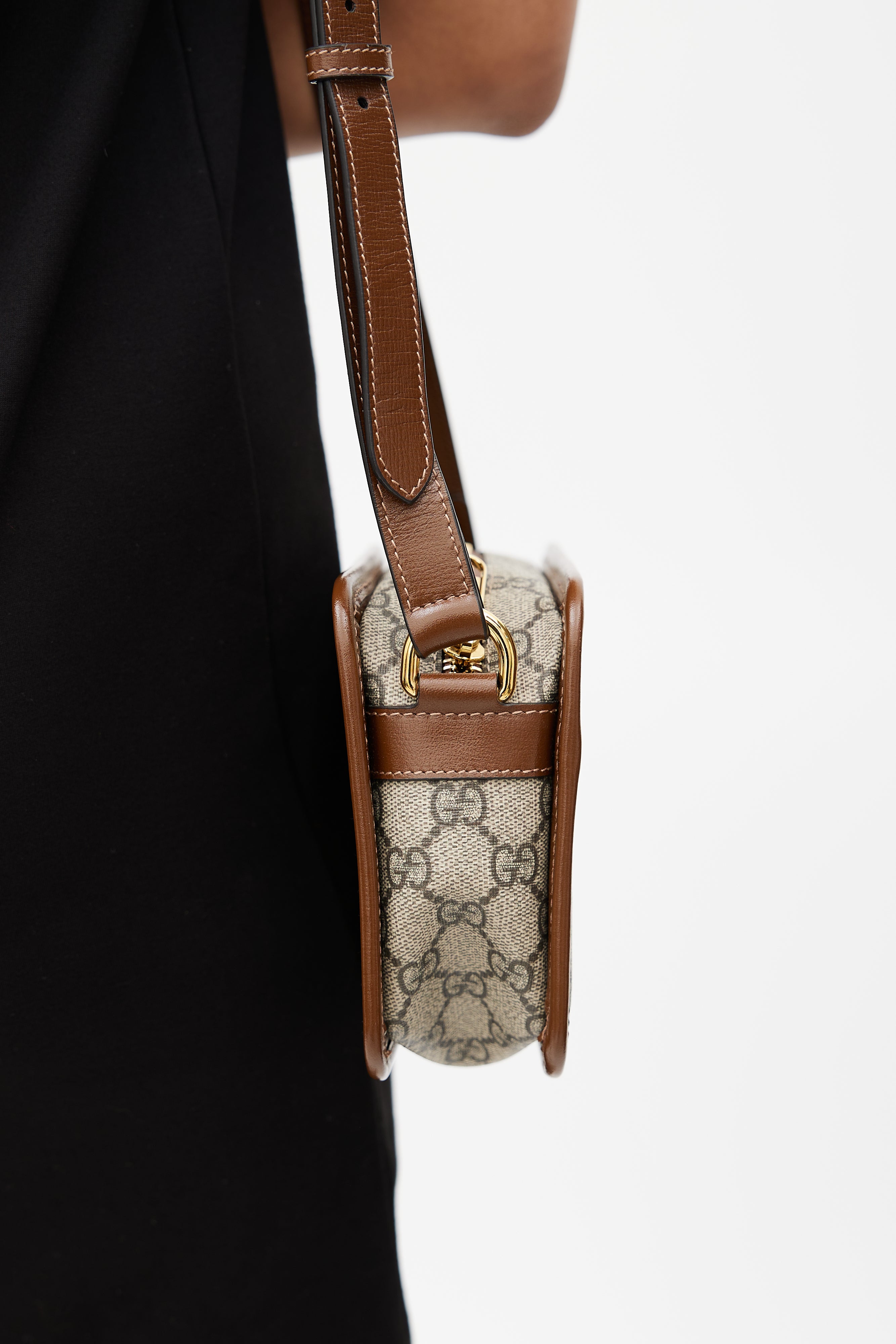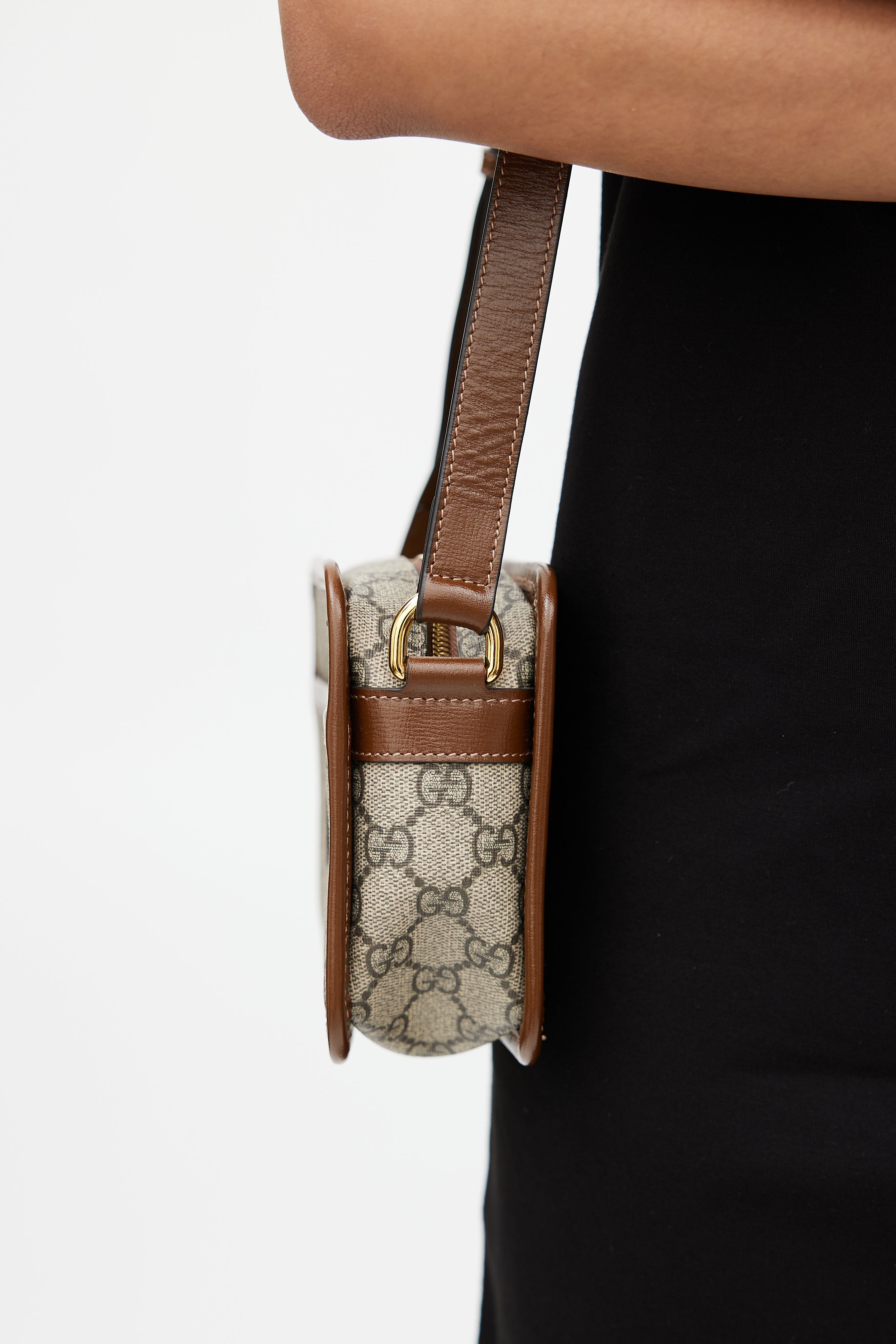 Pre-owned Gucci brown mini bag in GG Supreme monogram coated canvas featuring GG logo patch at front, leather trim, one main compartment with one slip pocket, adjustable shoulder strap, and top zip closure. Comes with original dust bag.